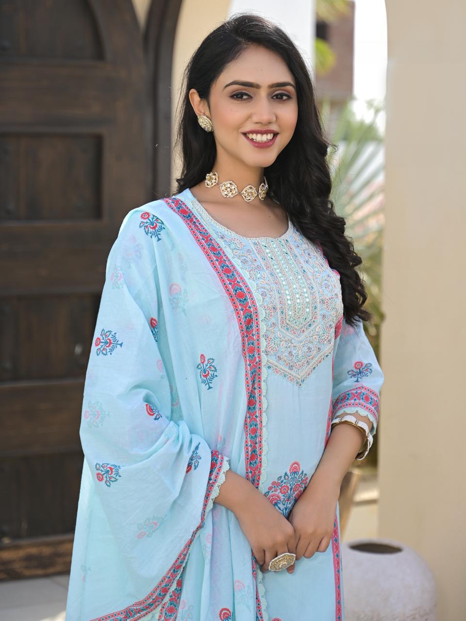 Refresh your ethnic wardrobe with this elegant teal blue cotton kurta set, designed for effortless grace and comfort. Crafted from soft, breathable cotton, the kurta features delicate floral motifs in soothing hues, complemented by intricate embroidery detailing on the neckline for a refined finish. The subtle placement prints add charm while maintaining a light and airy appeal. The set is paired with a beautifully coordinated dupatta adorned with vibrant borders and matching floral prints, enhancing the overall look with a touch of color contrast. Perfect for daytime gatherings, festive brunches, office wear, or casual celebrations, this ensemble offers timeless style with all-day ease. Style it with minimal jewelry and classic flats for a graceful, understated look. Set Includes: