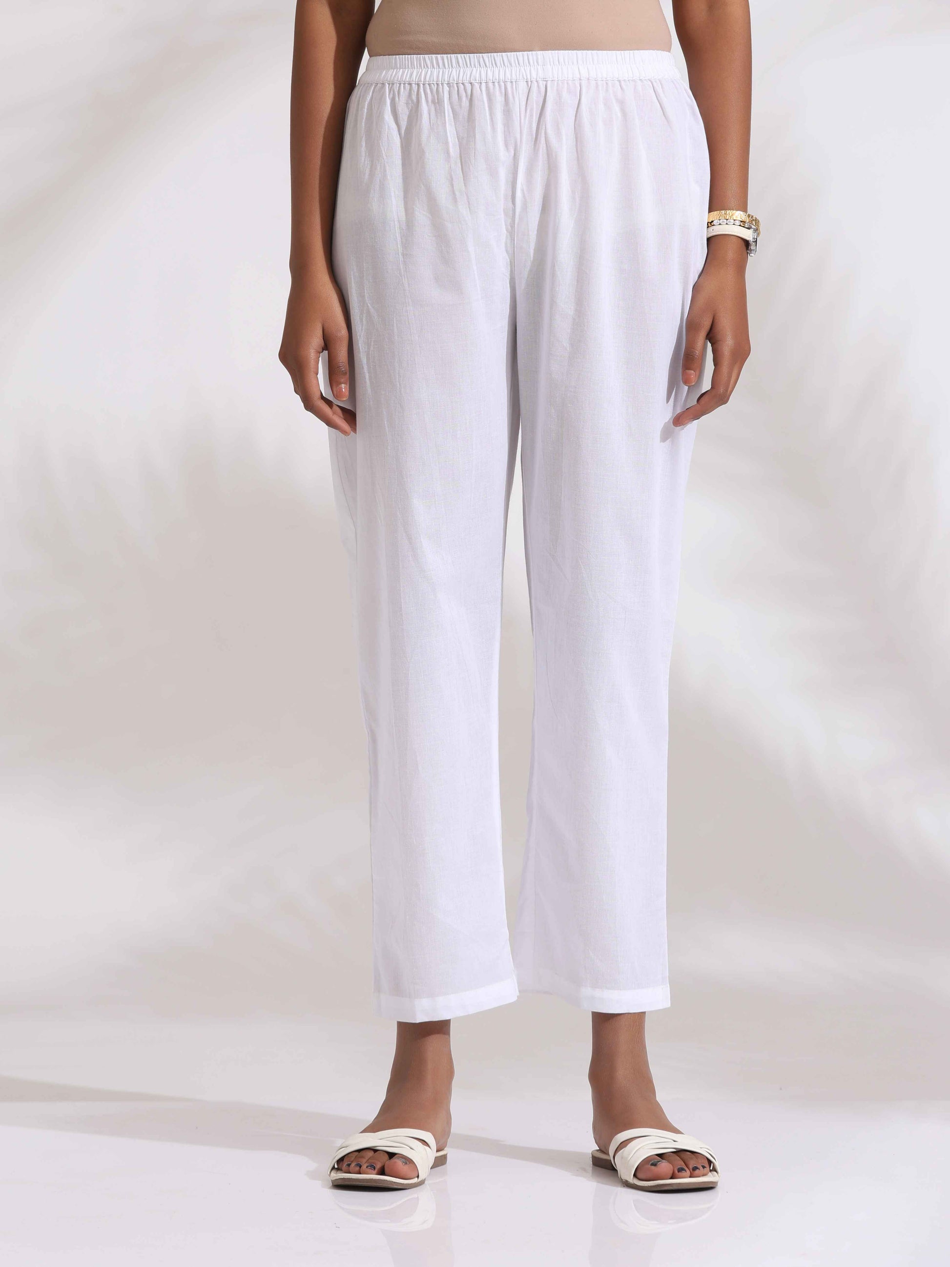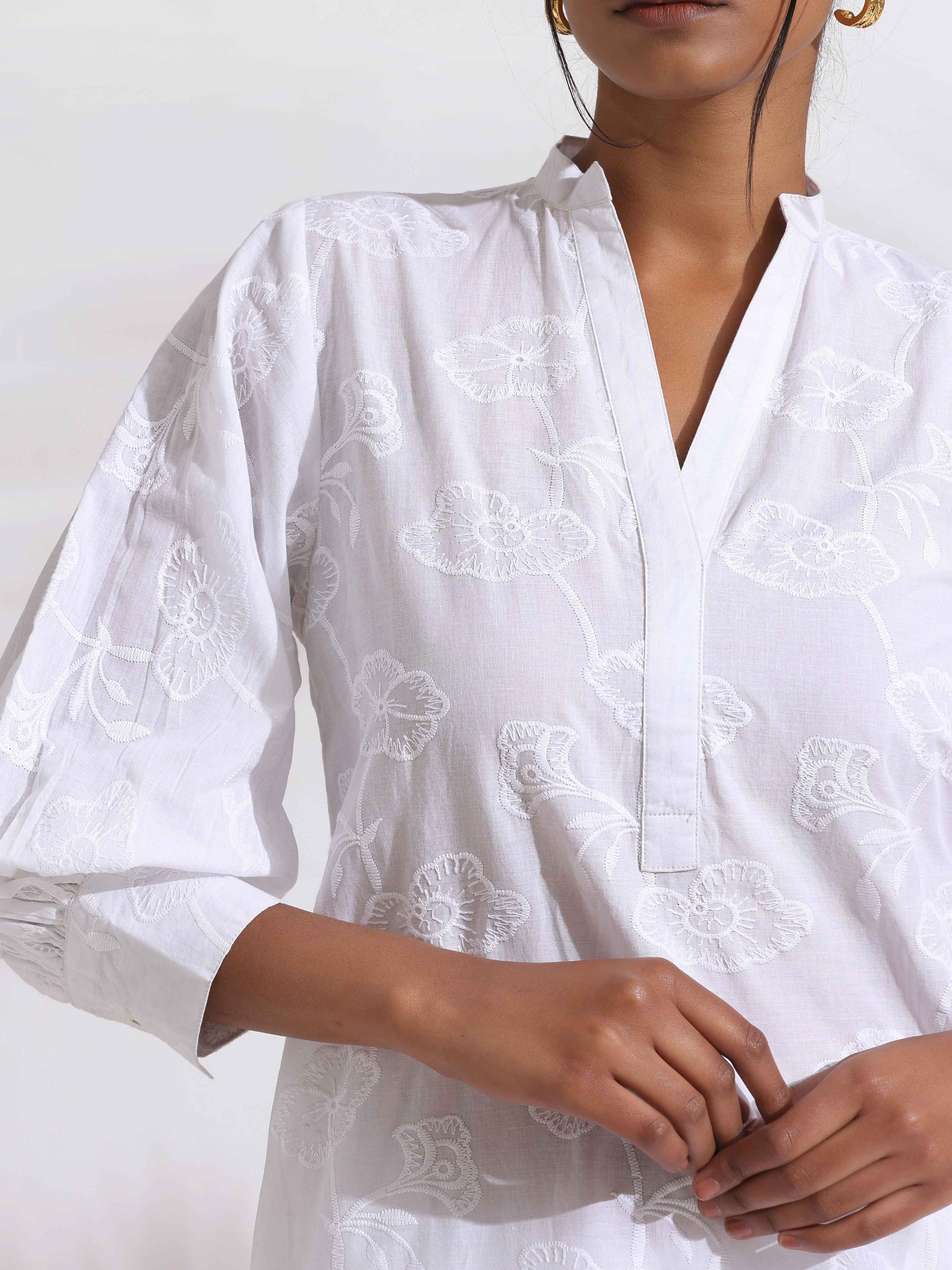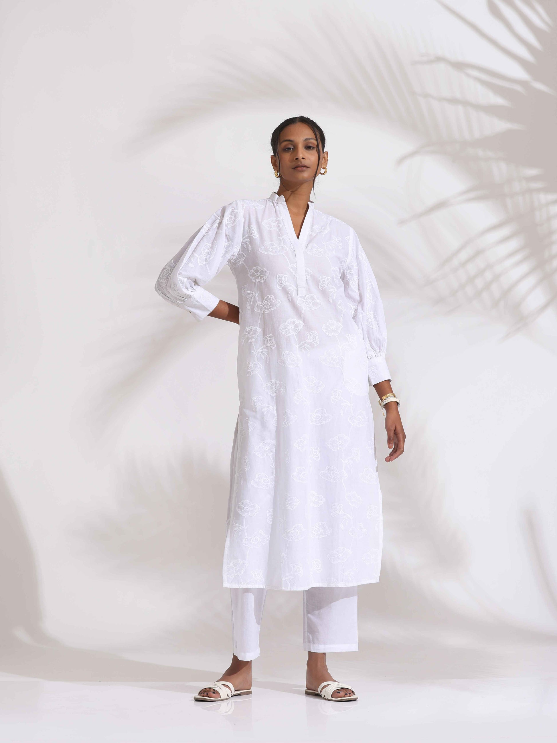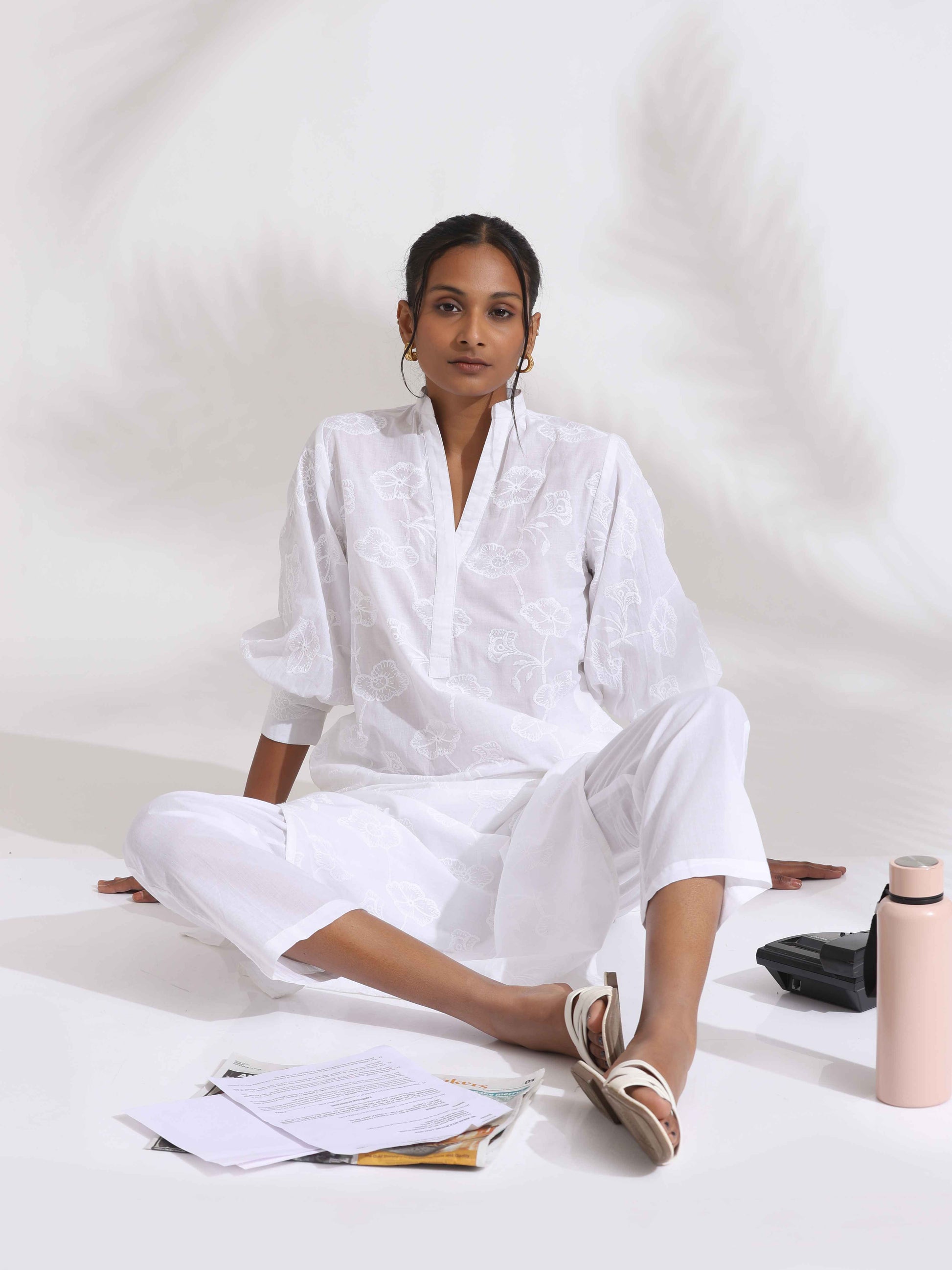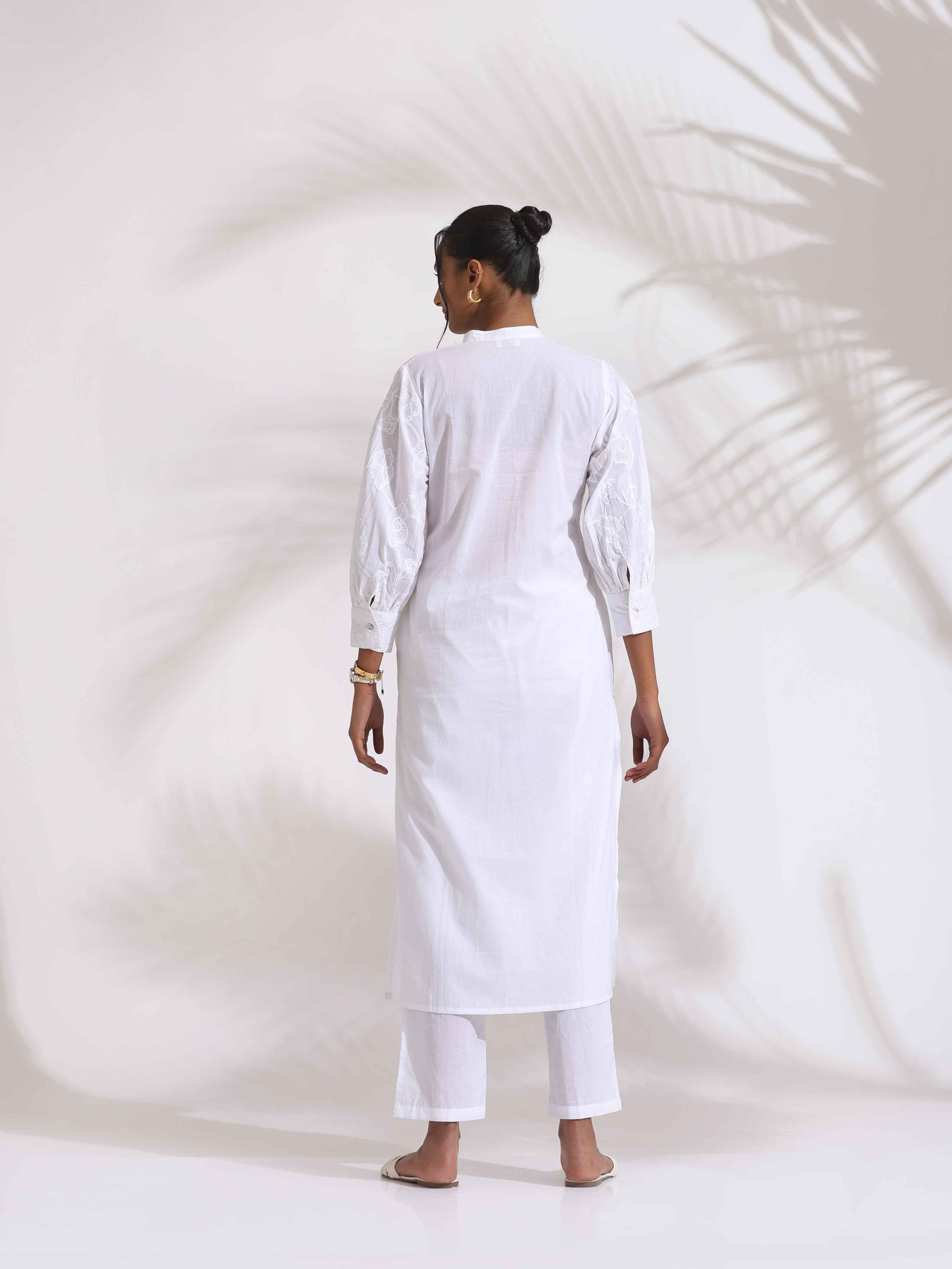 - Elevate your style with this white cotton kurta, adorned with intricate embroidery in front and sleeves, complemented by solid back panels. Paired with white pants, it's an ideal blend of elegance and comfort.