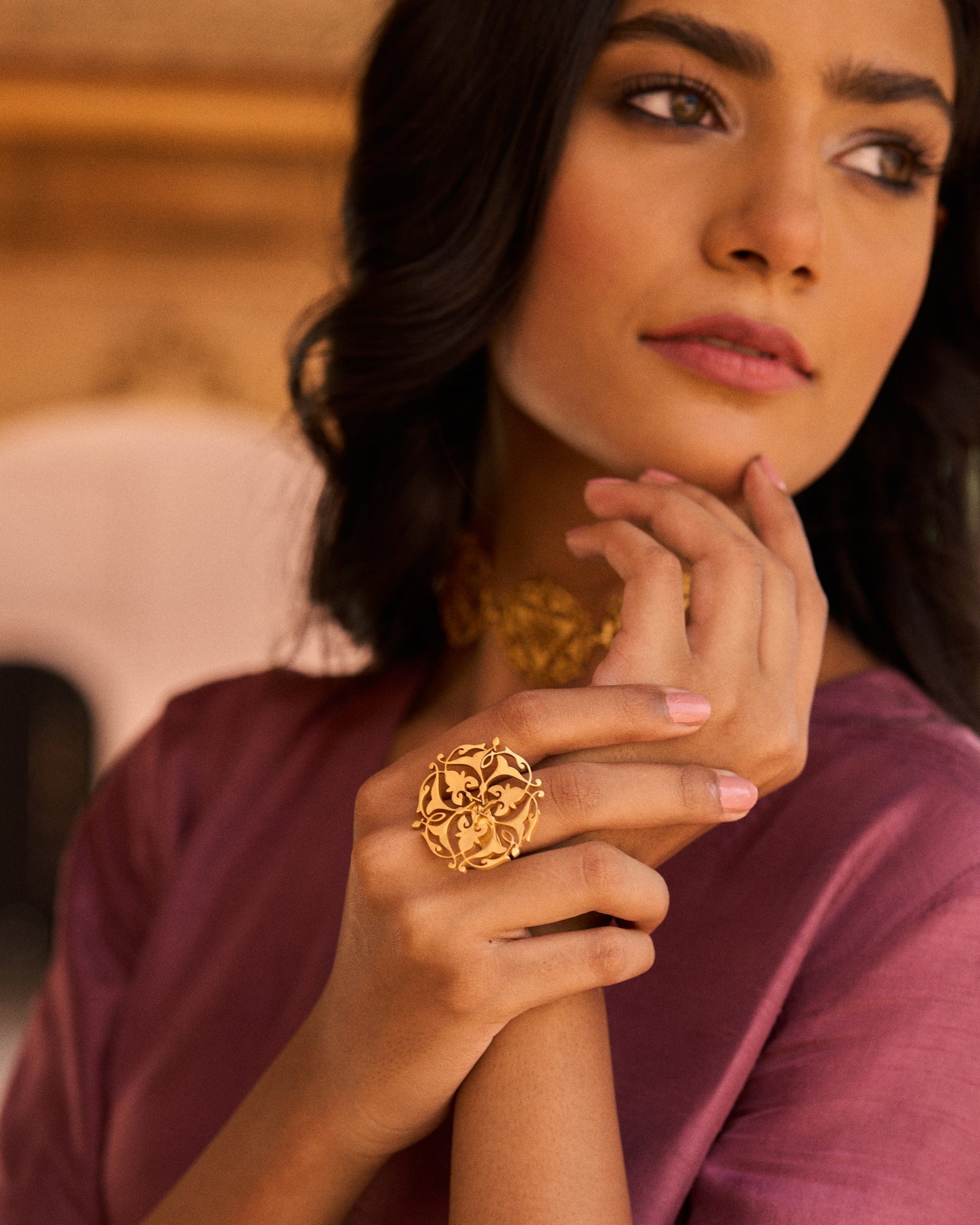 - 22K Gold-plated carved circular Ring with leaf motif and adjustable slip-on closure.