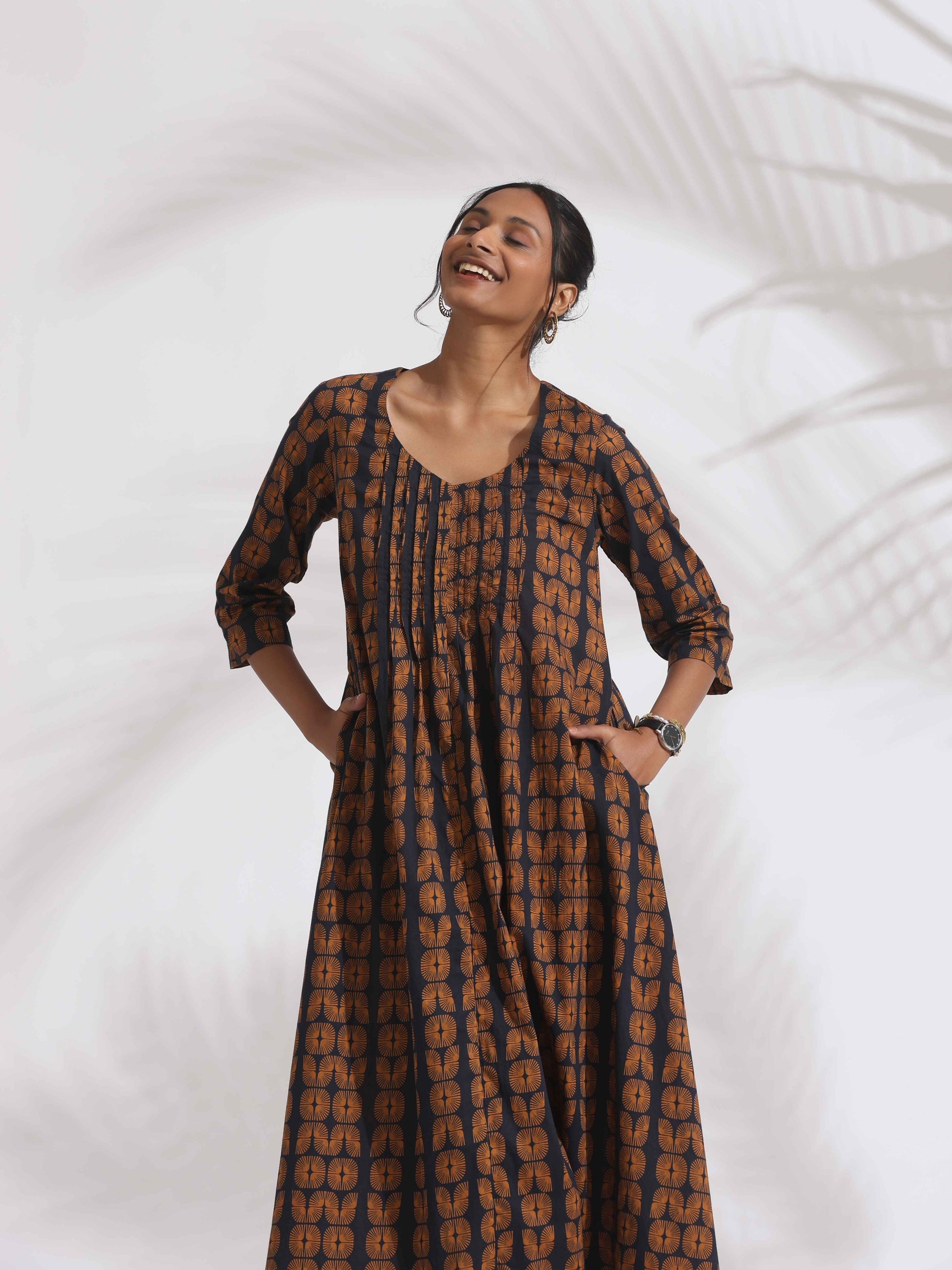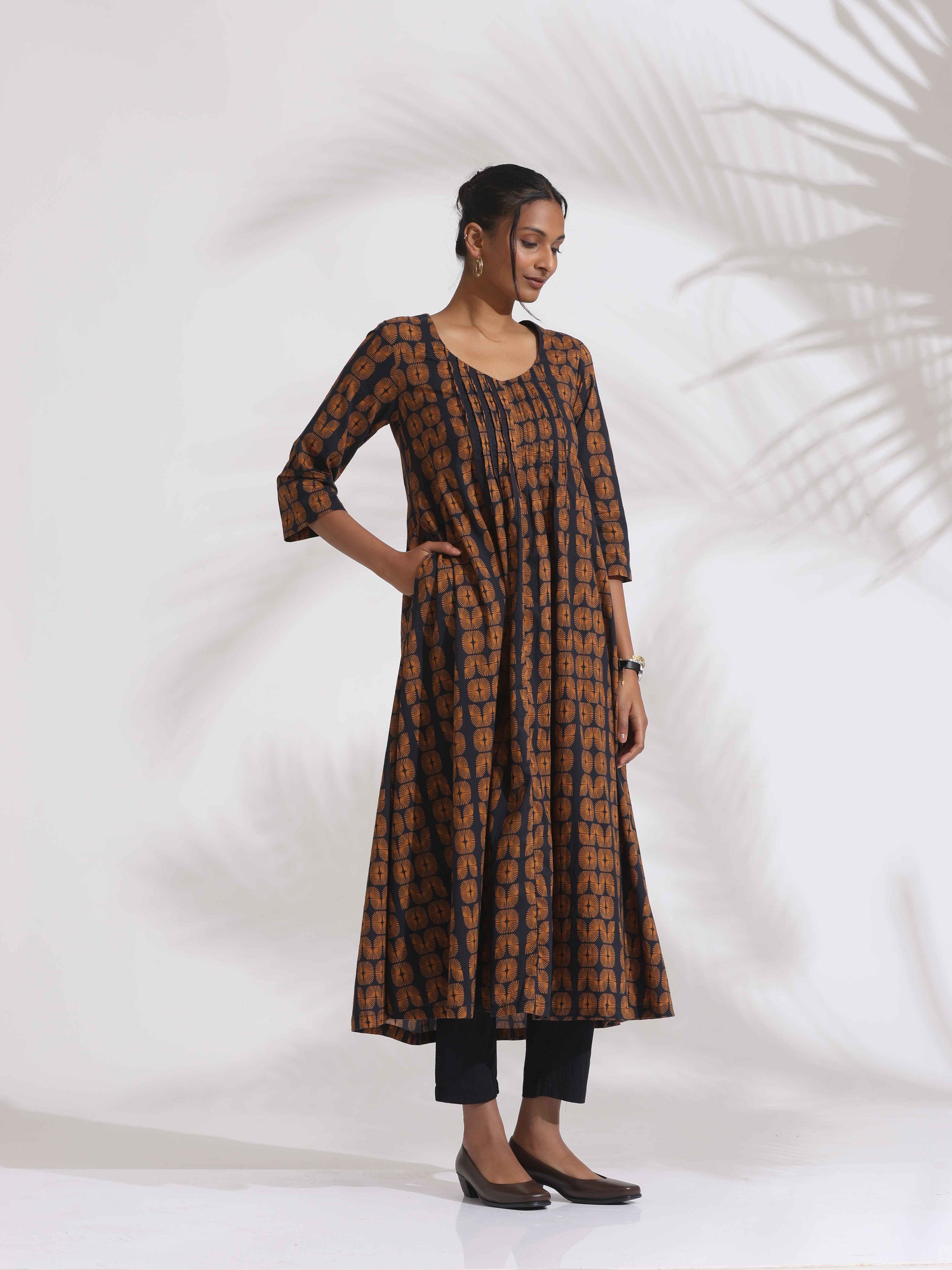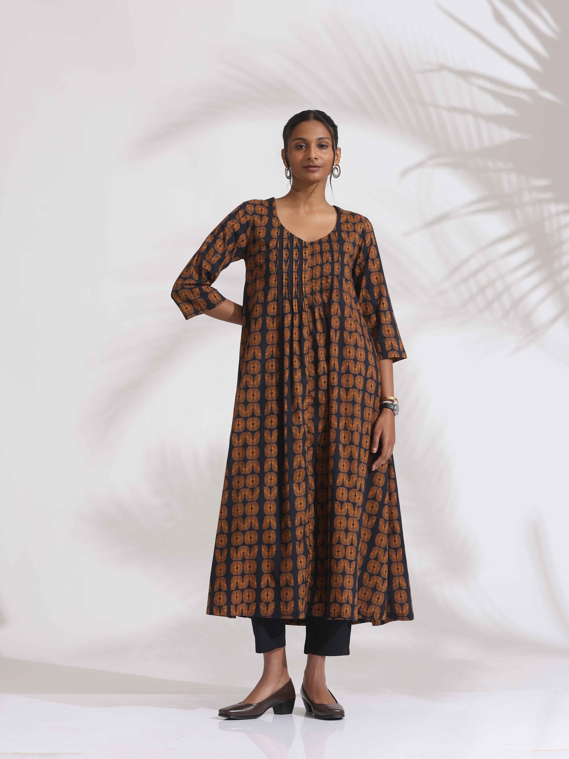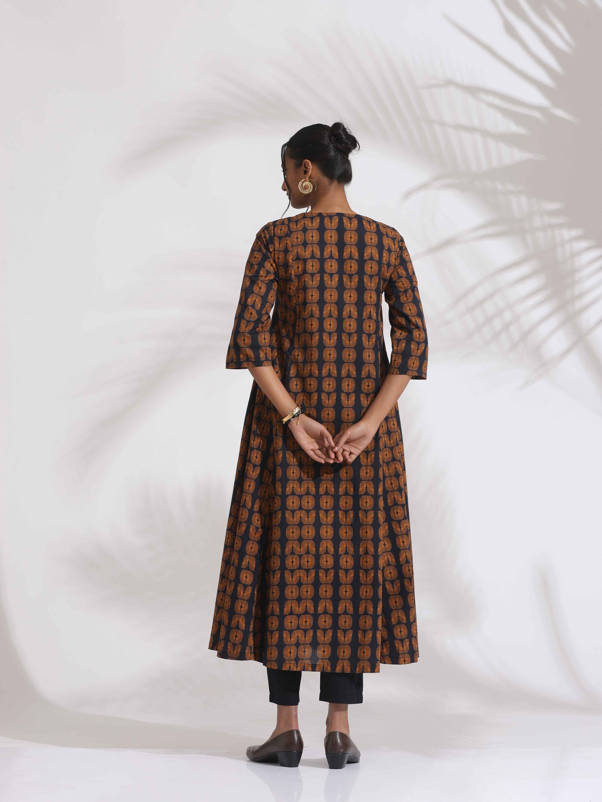 trueBrowns Black Cotton Print Pleated Flared Kurta Set