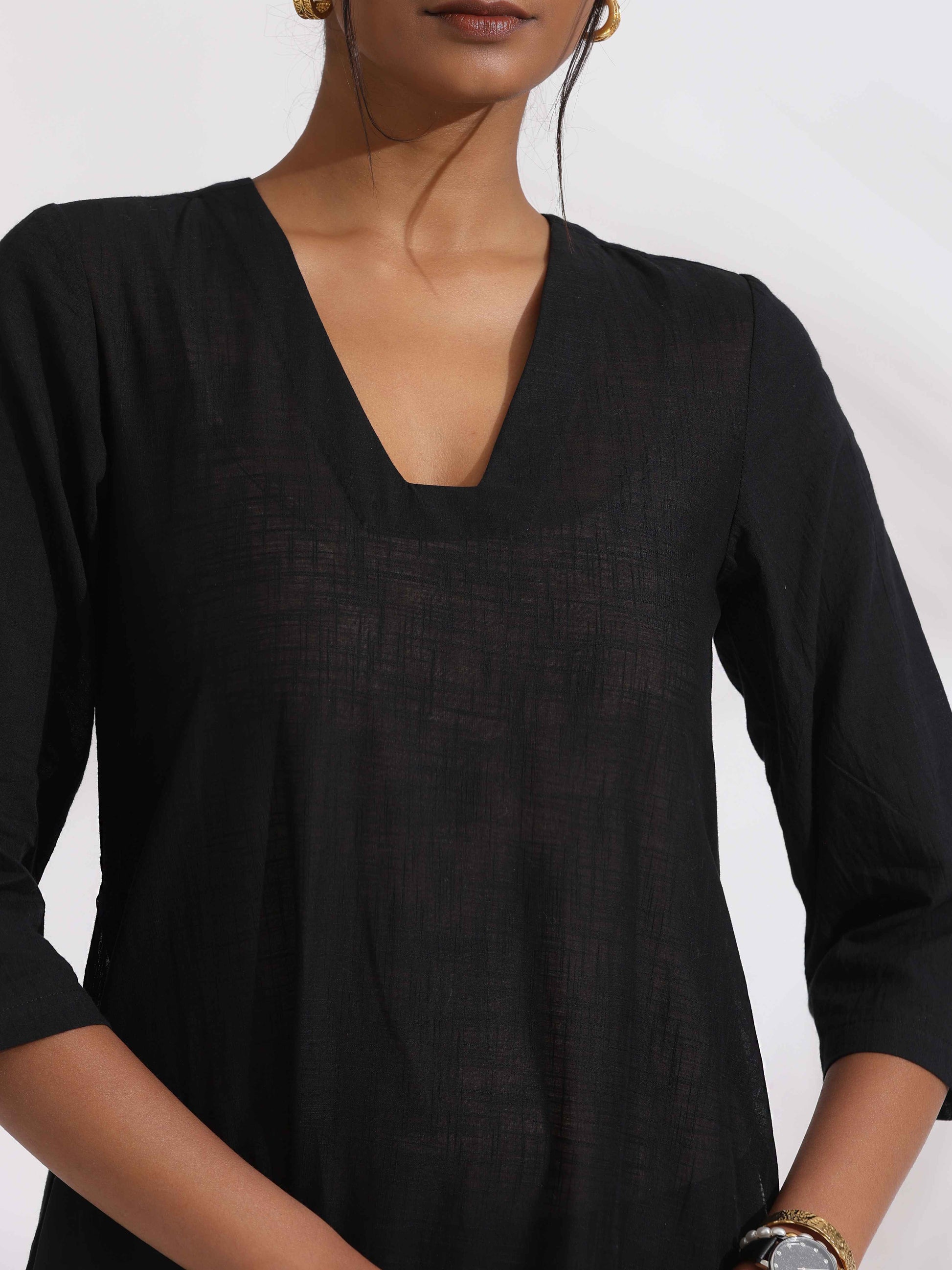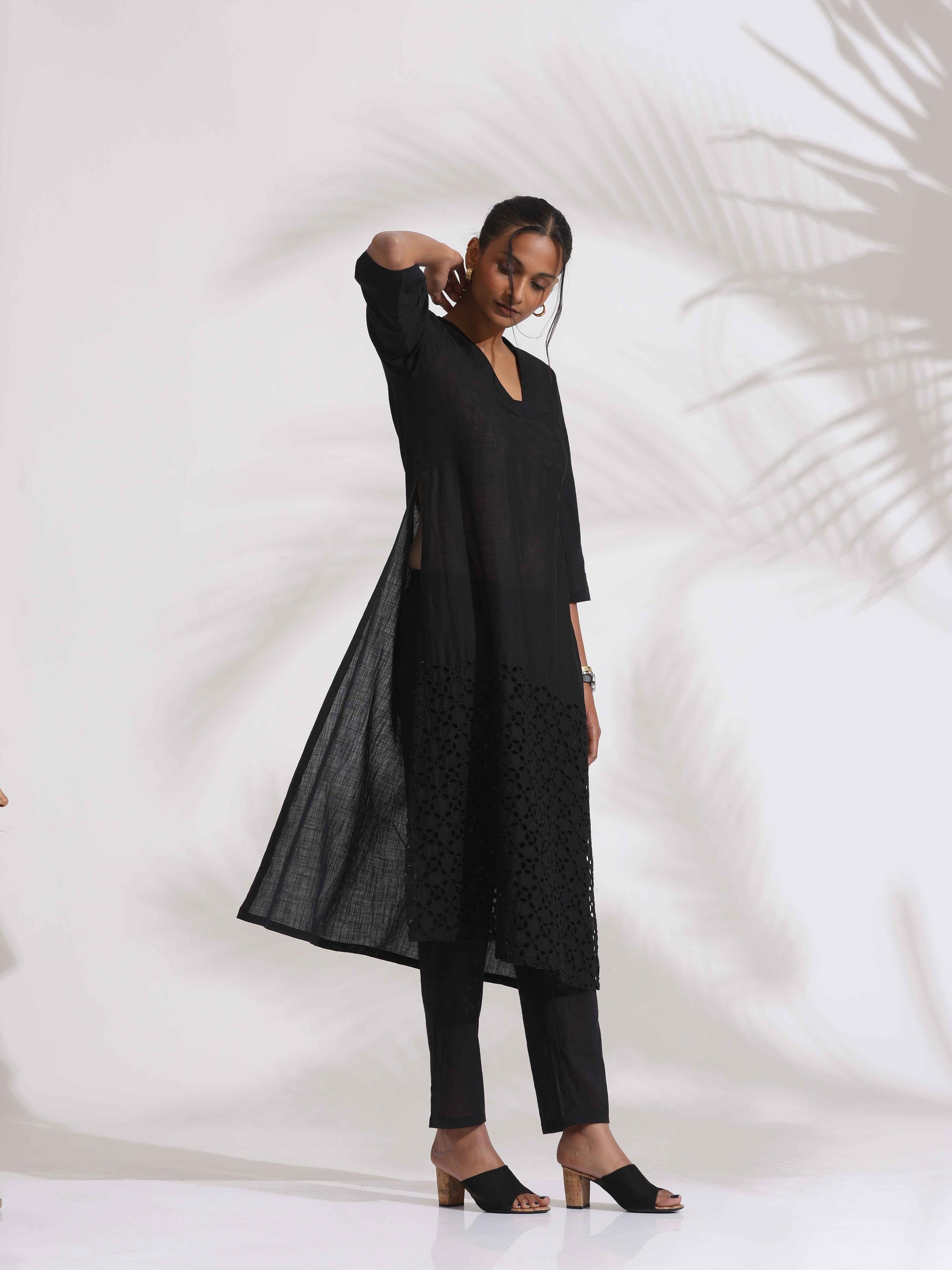 - Elevate your style with this black cotton kurta set, featuring a glass neckline and high slit for a modern touch. It’s the perfect blend of elegance and comfort, ideal for both casual and semi-formal occasions.