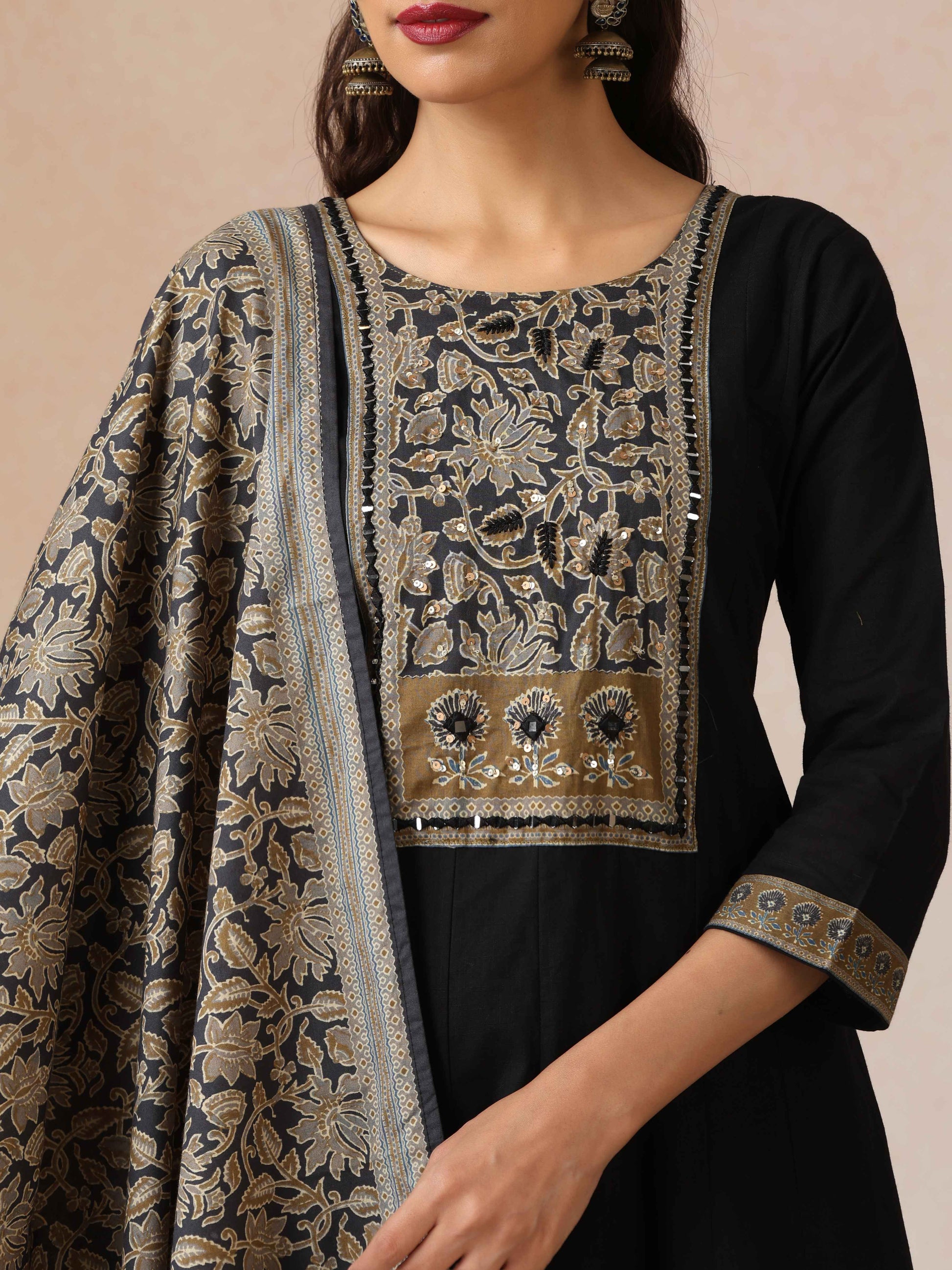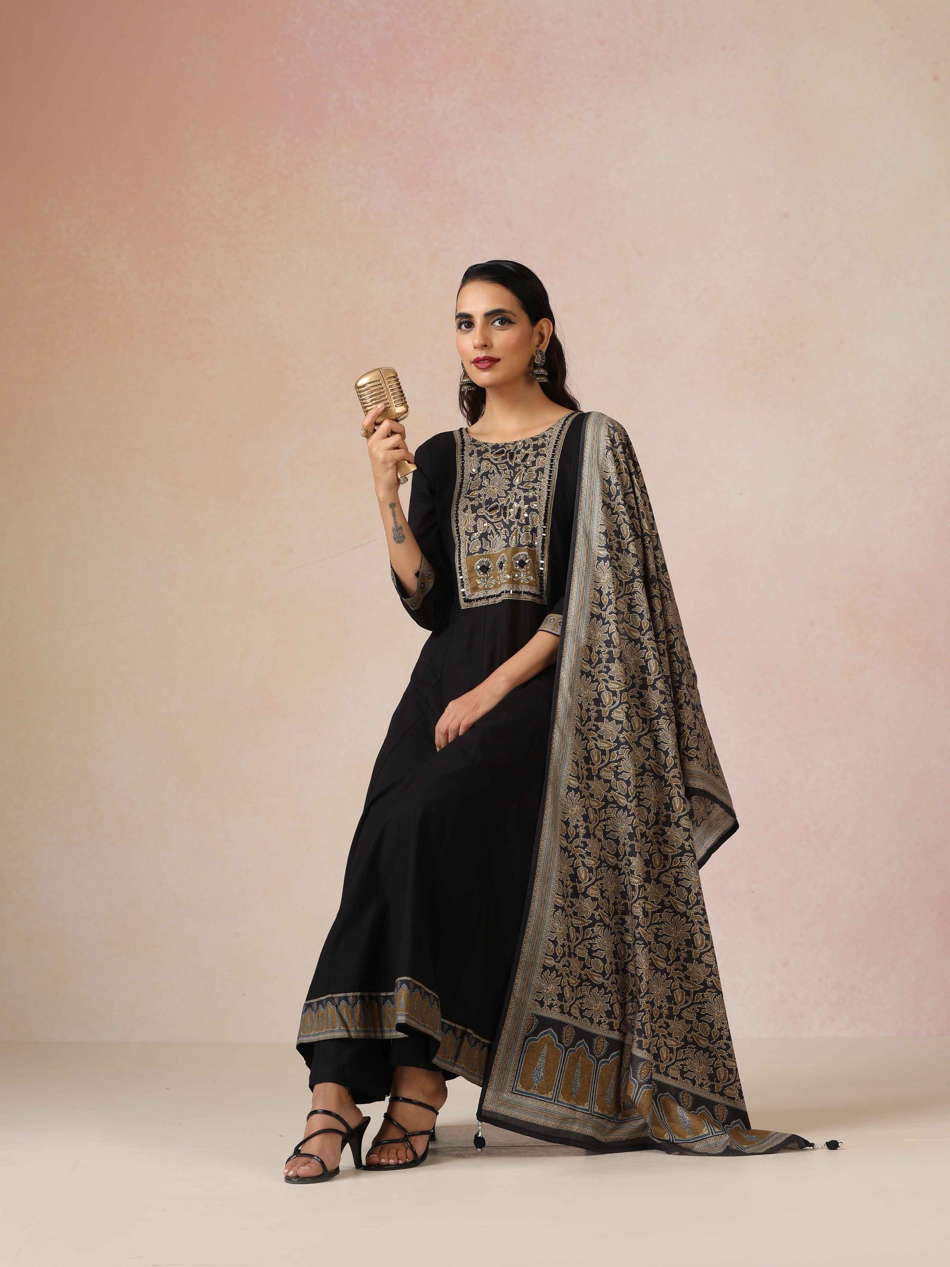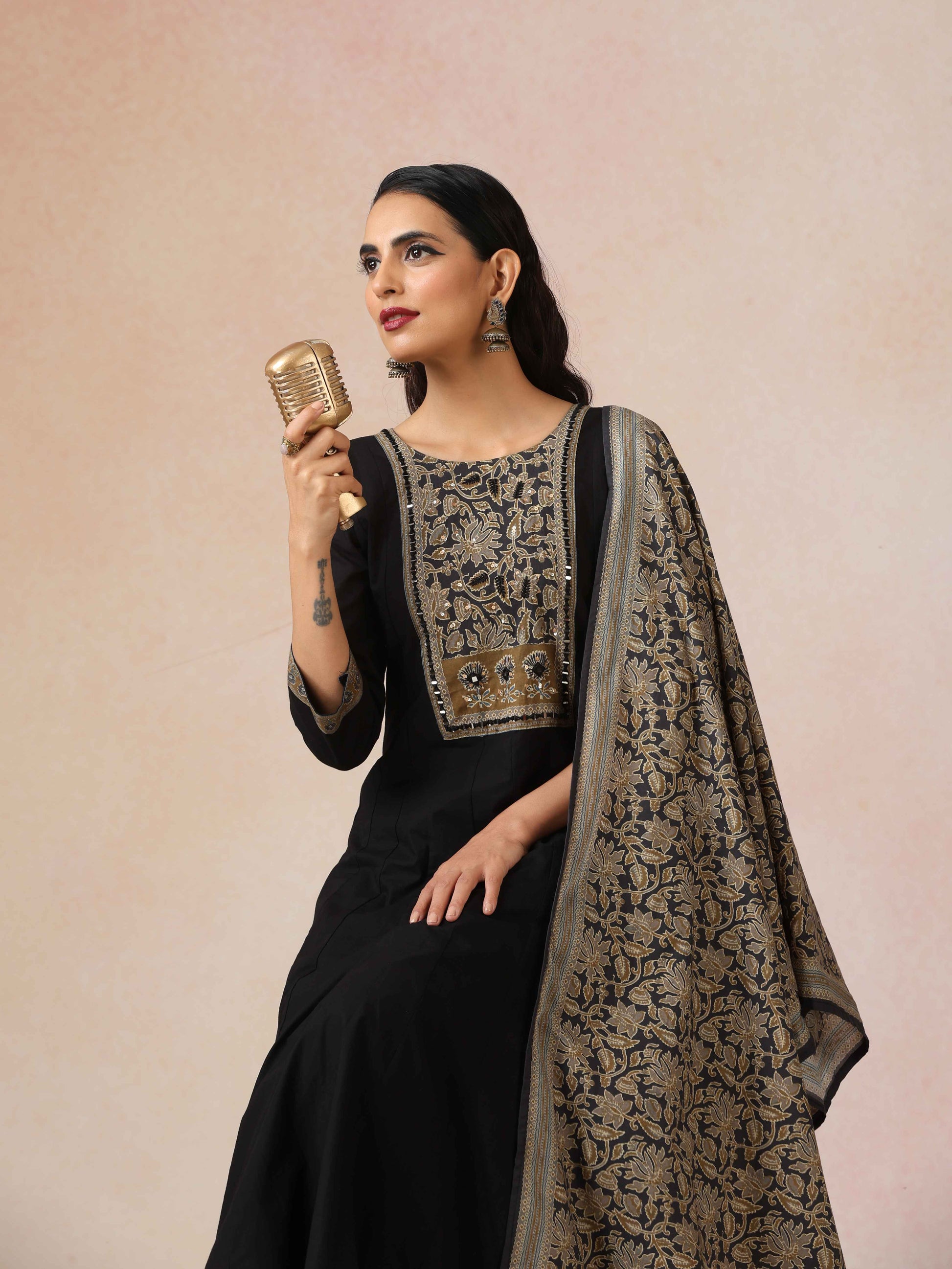 trueBrowns Black Embroidered Anarkali Pant Dupatta Set