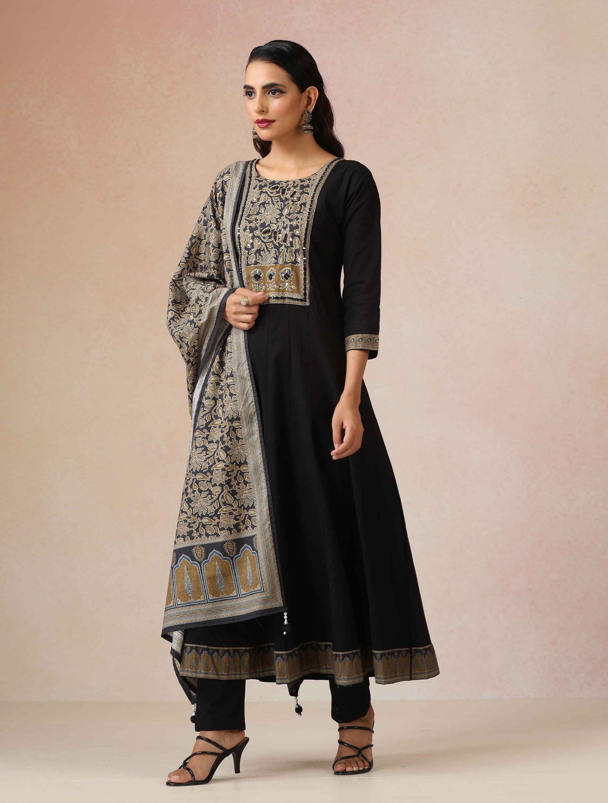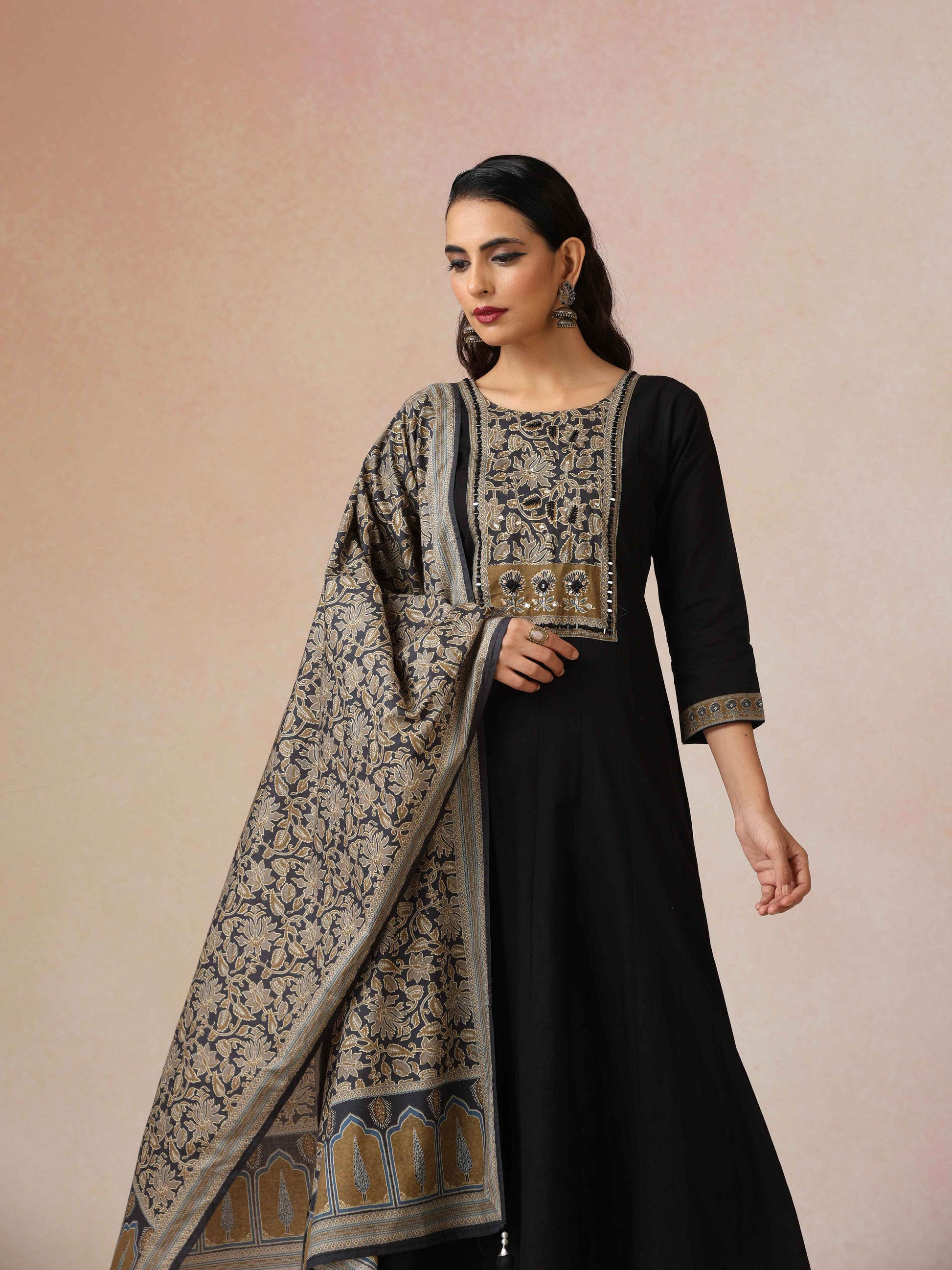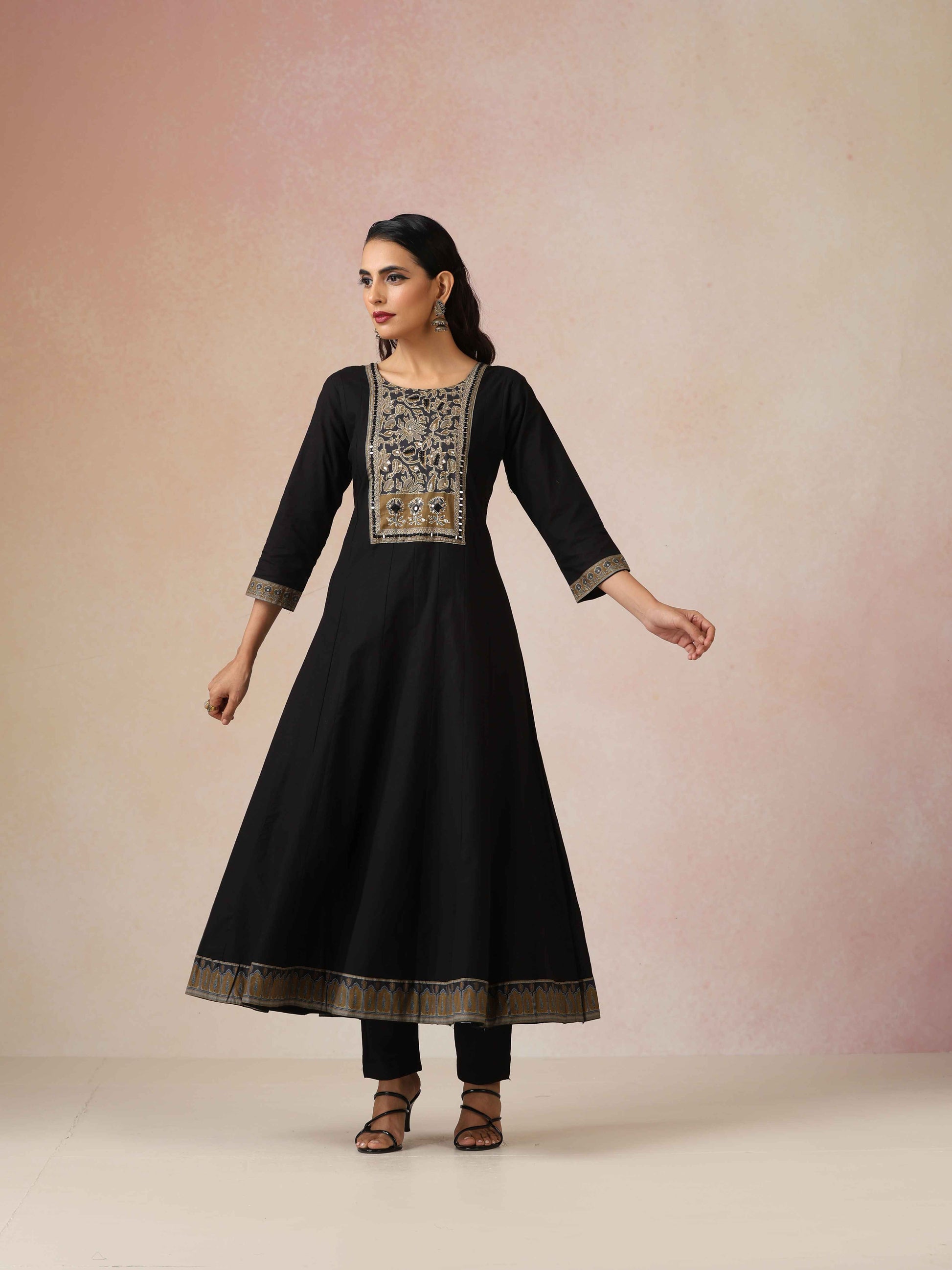 - Elevate your style and step into effortless elegance with black yoke embroidered anarkali kurta, paired with black pants and black printed dupatta. Designed for modern grace, perfect for festive ease and gatherings.