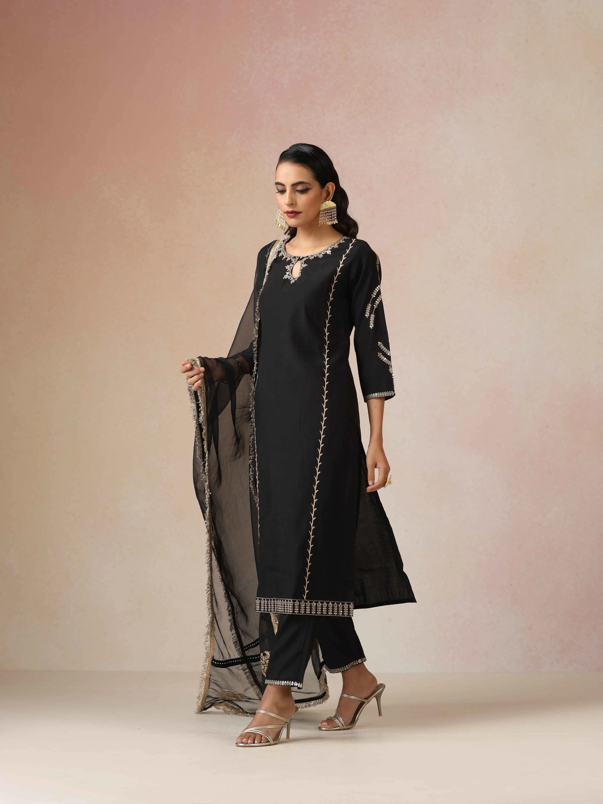 trueBrowns Black Embroidered Kurta Pant Dupatta Set