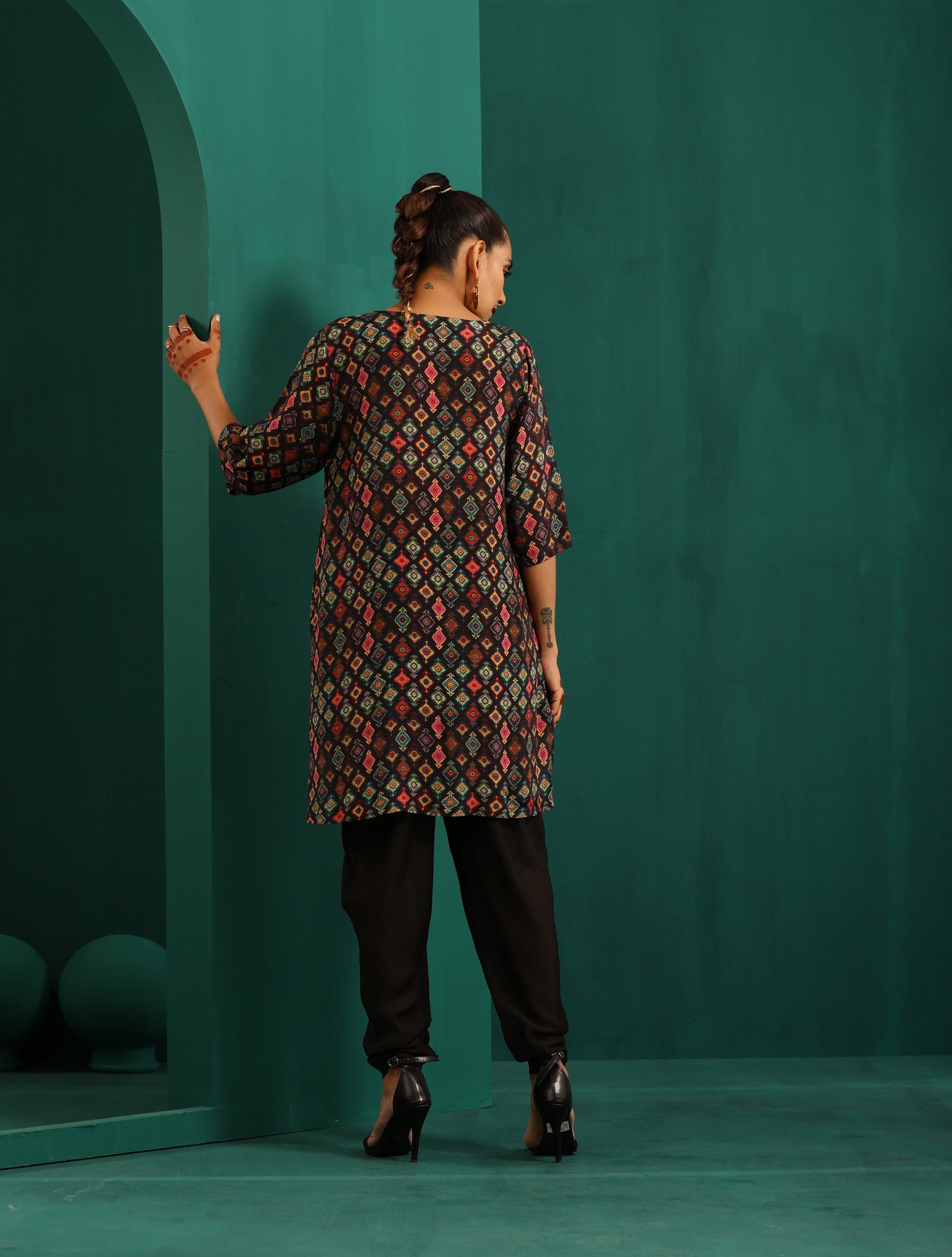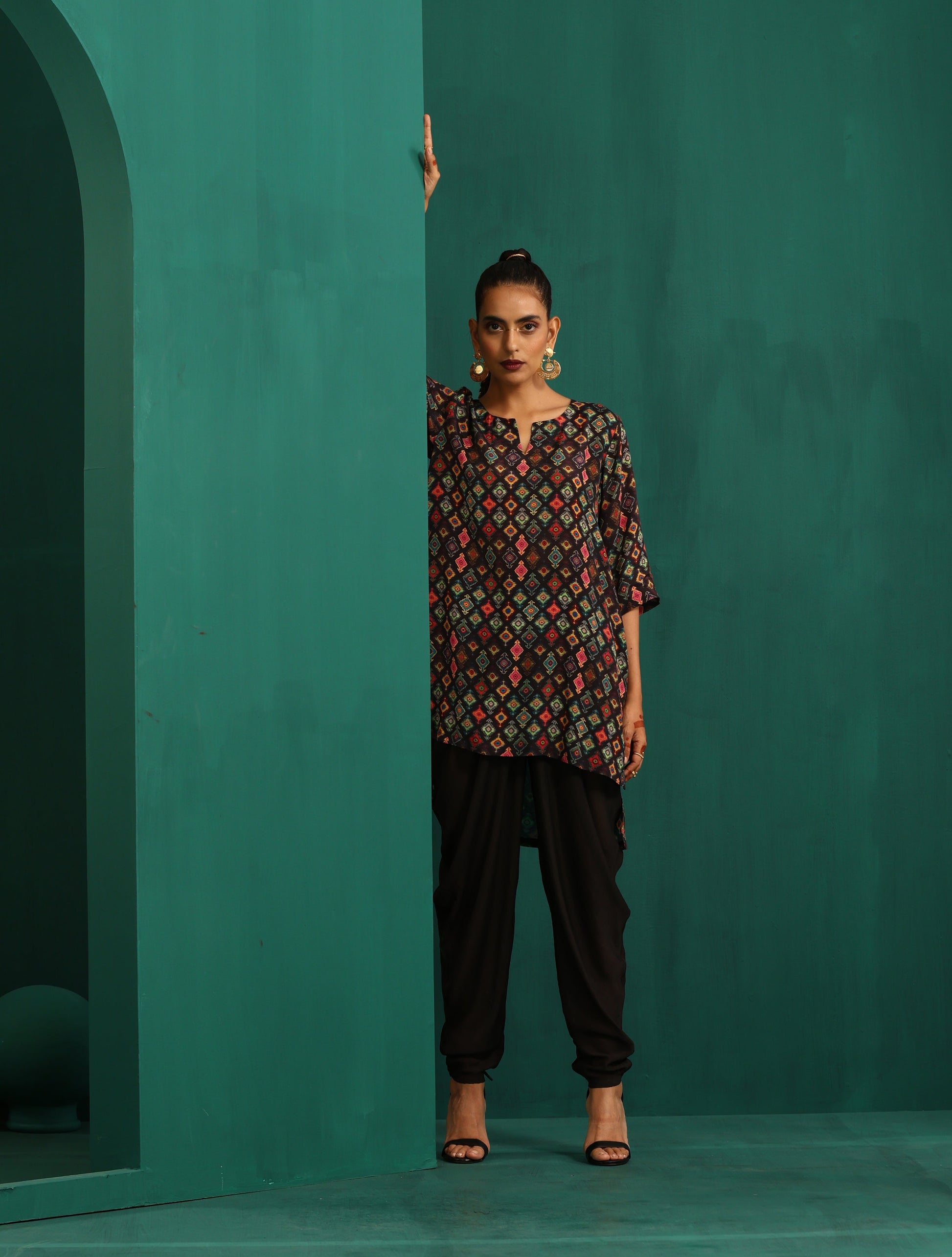 trueBrowns Black Ikat Muslin Silk Printed High Low Co-ord Set