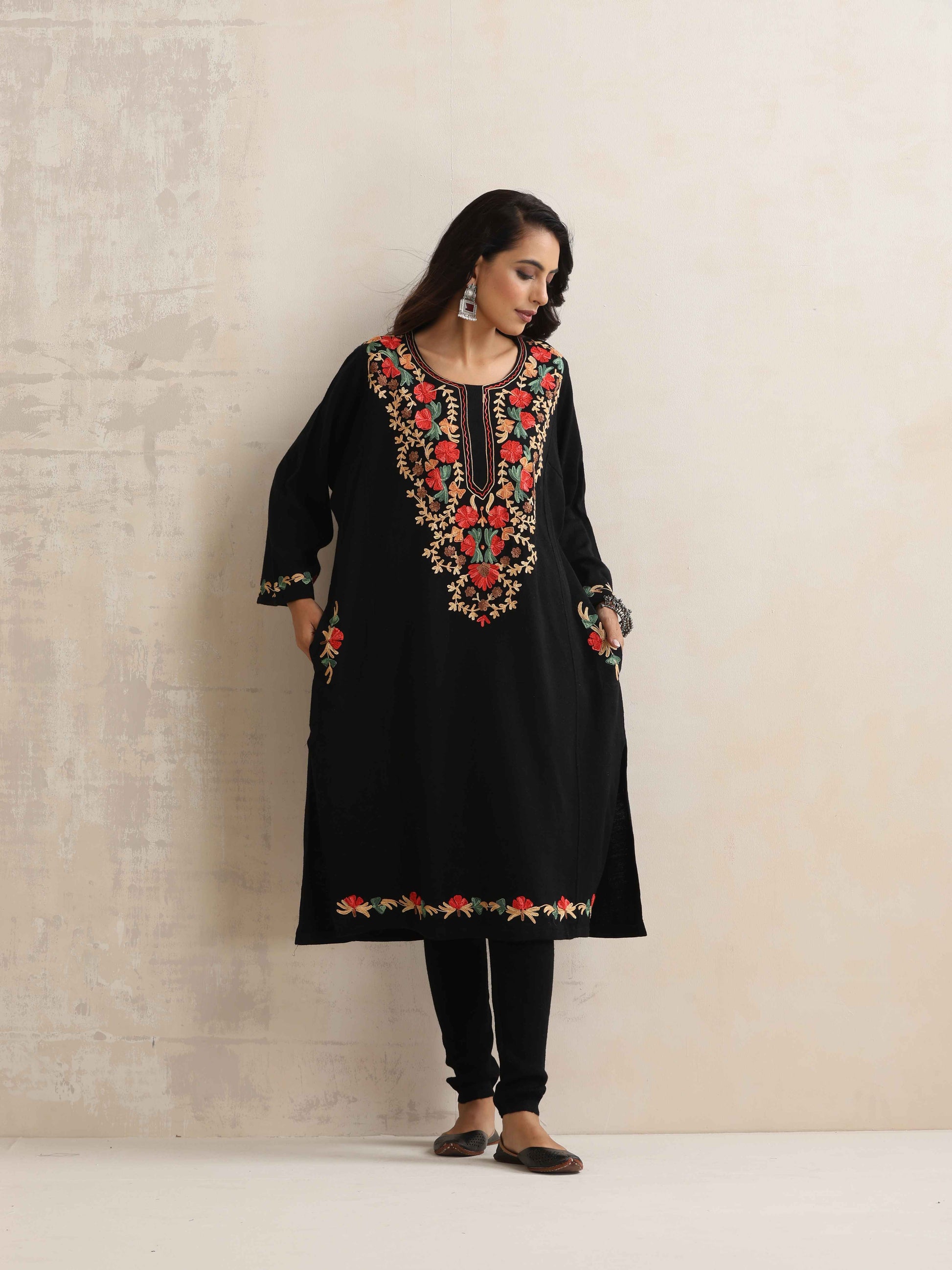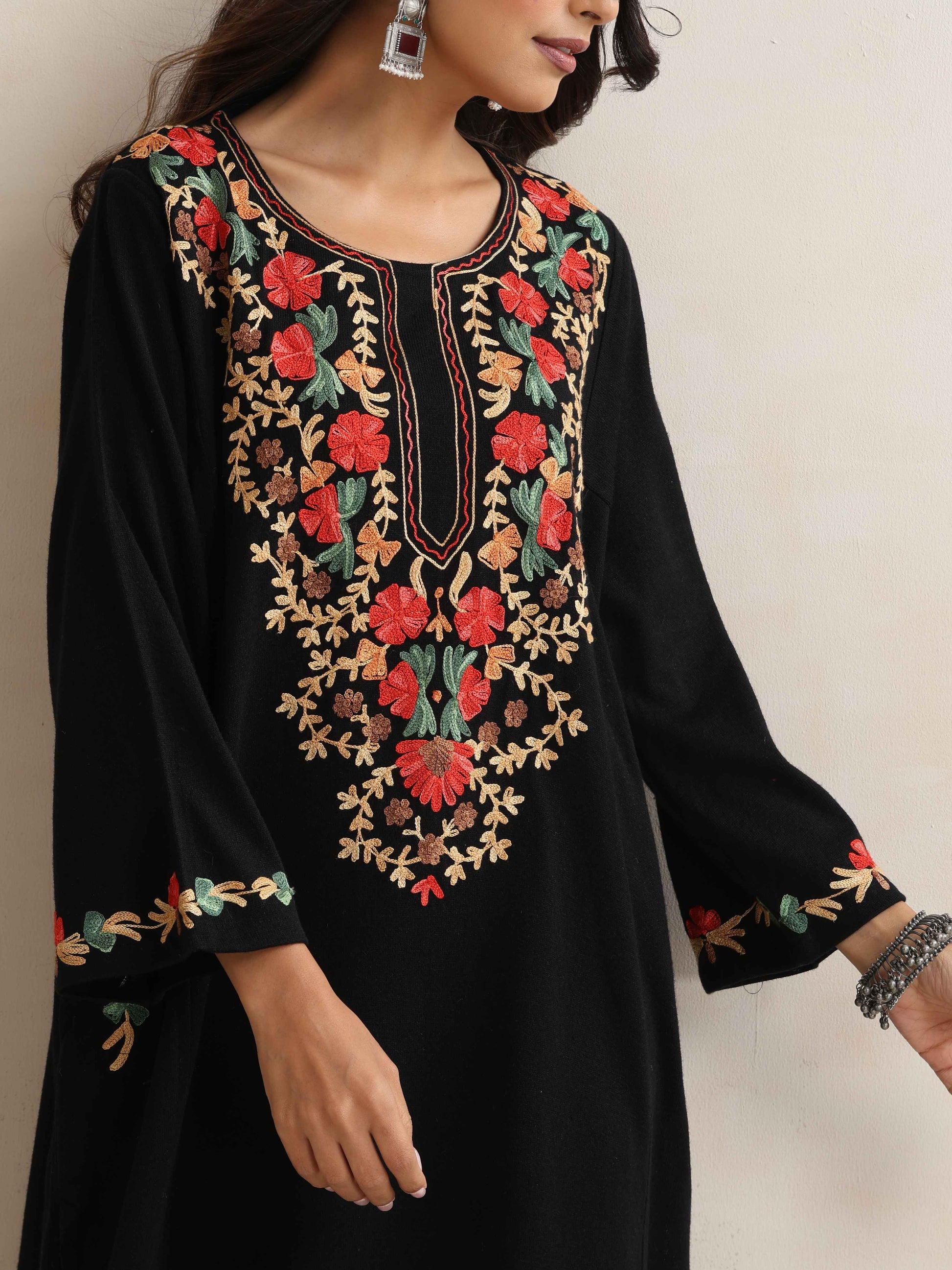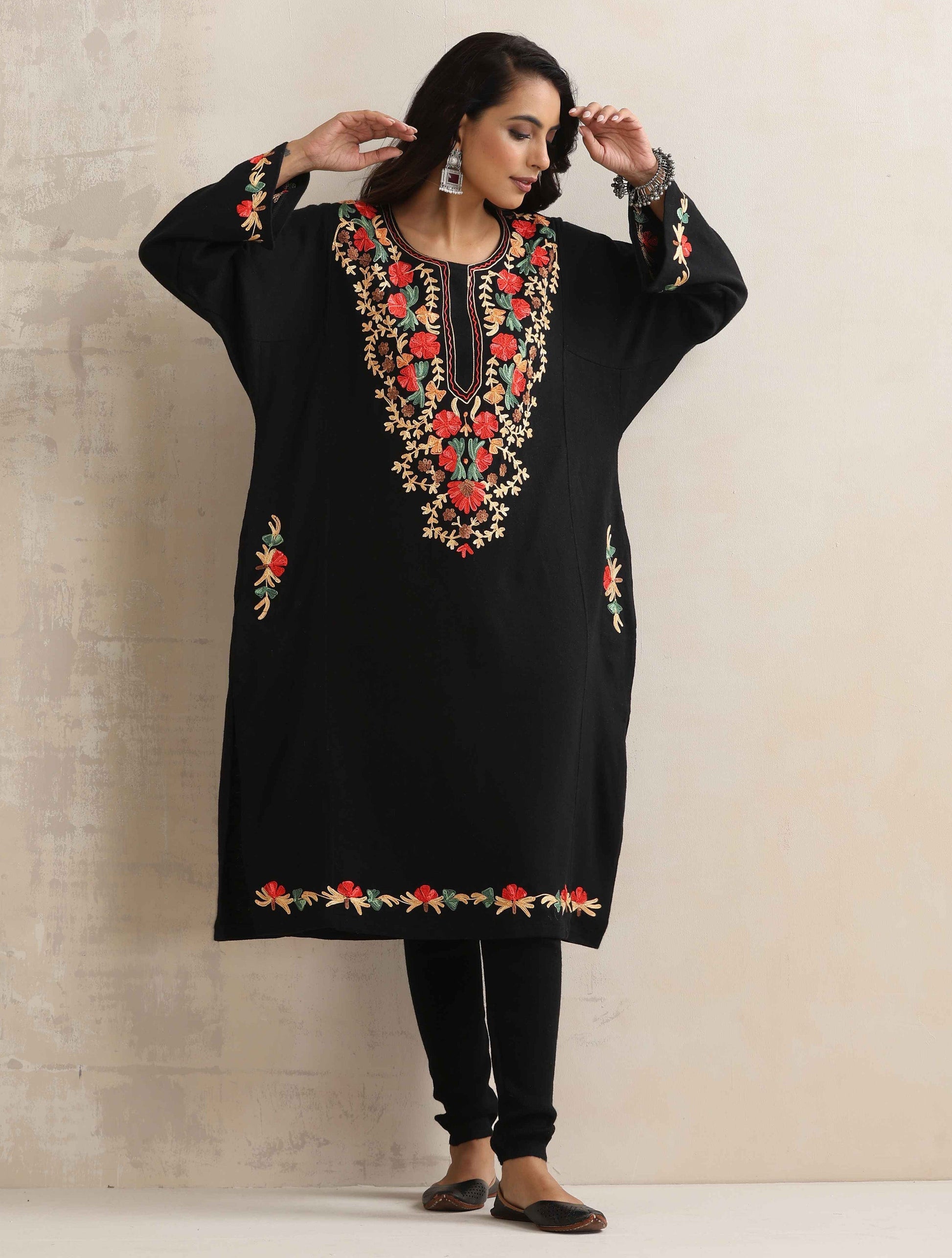 trueBrowns Black Kashmiri Embroidered Woollen Phiran Kurta