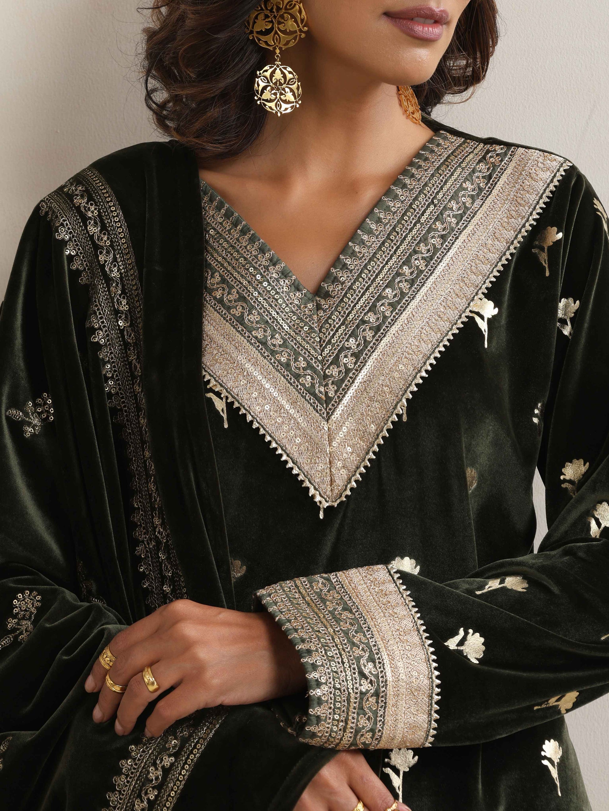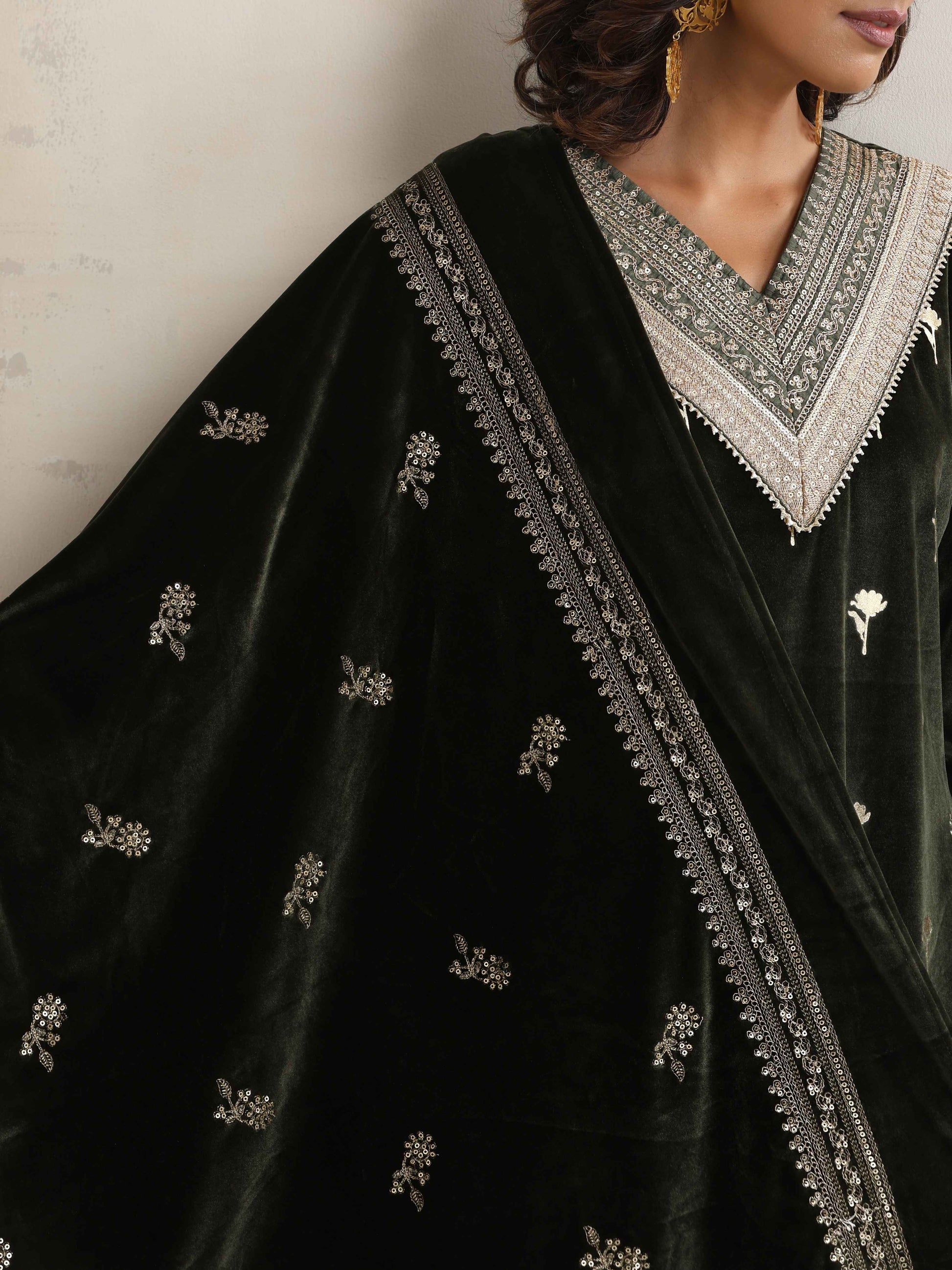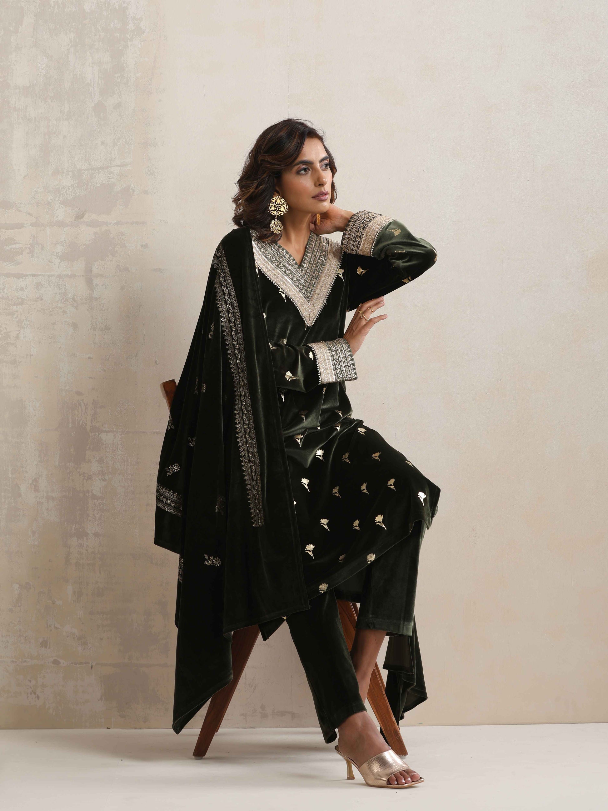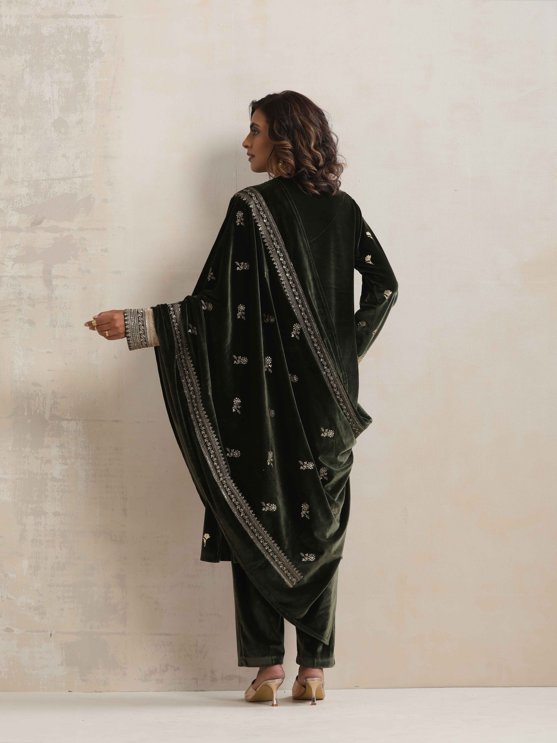 trueBrowns Green Velvet Floral Embroidered Kurta Pant Dupatta Set
