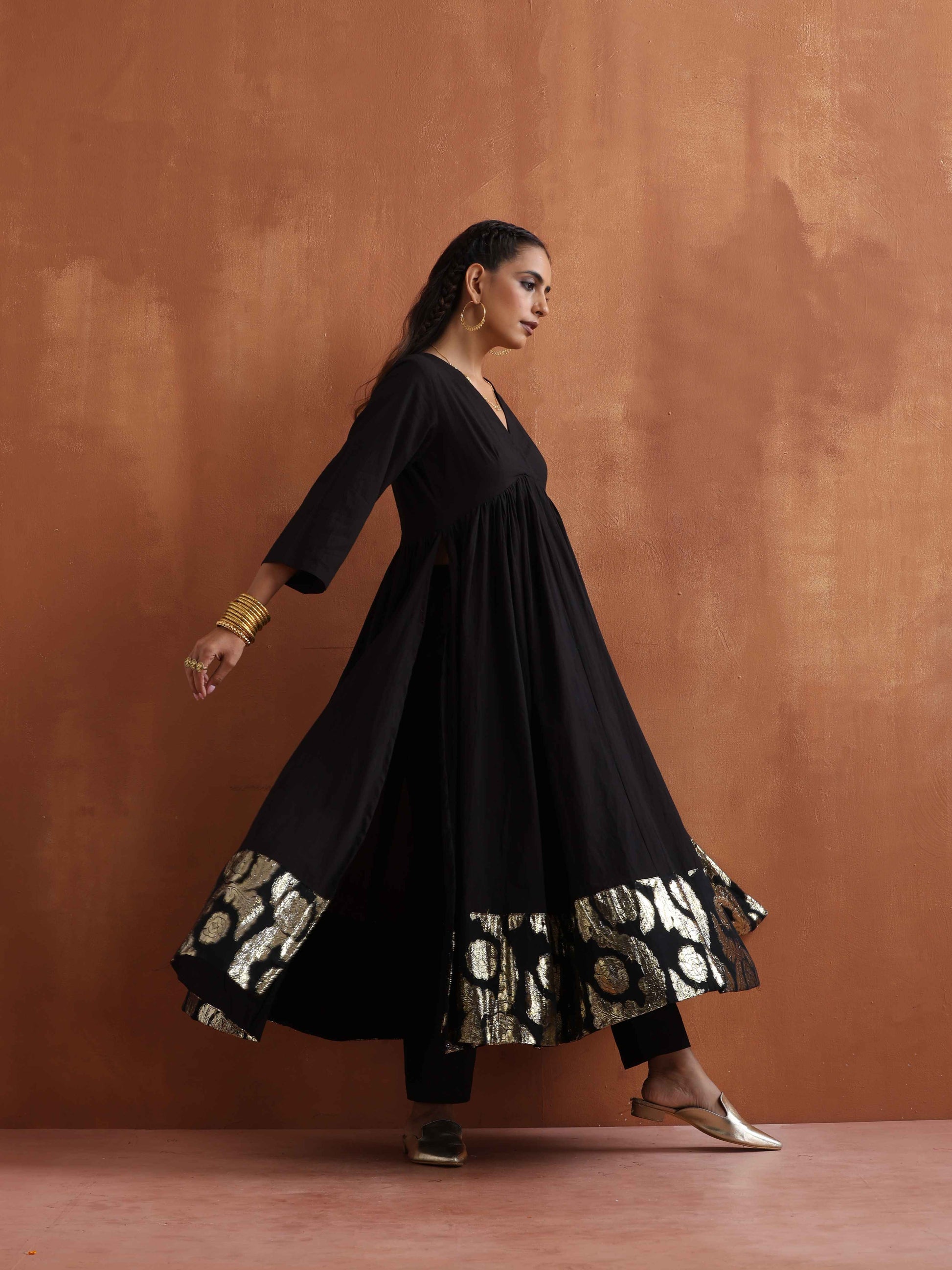 - Elevate your style with this black metallic flared anarkali kurta paired with black pant, it's an ideal blend of elegance and comfort.