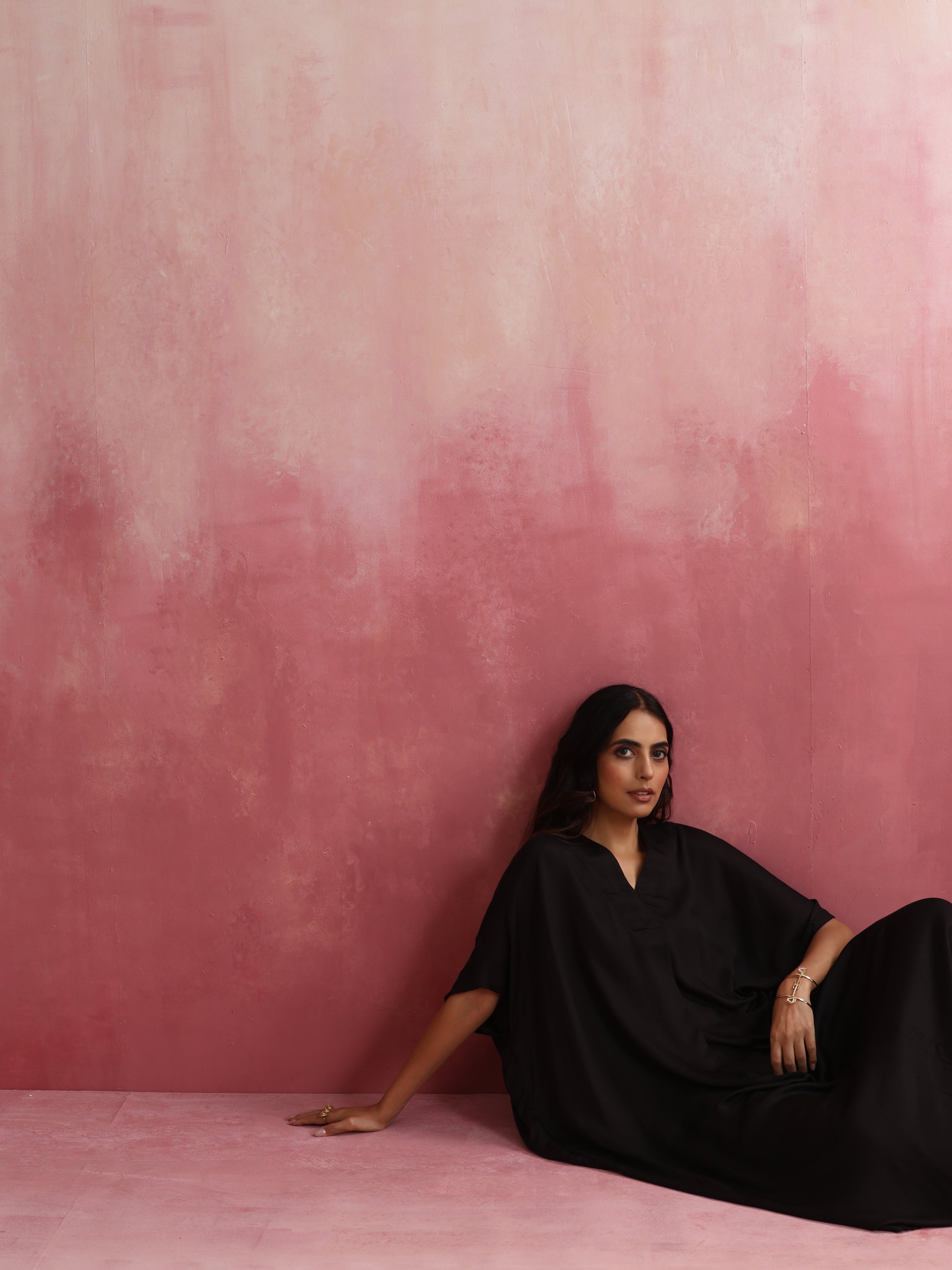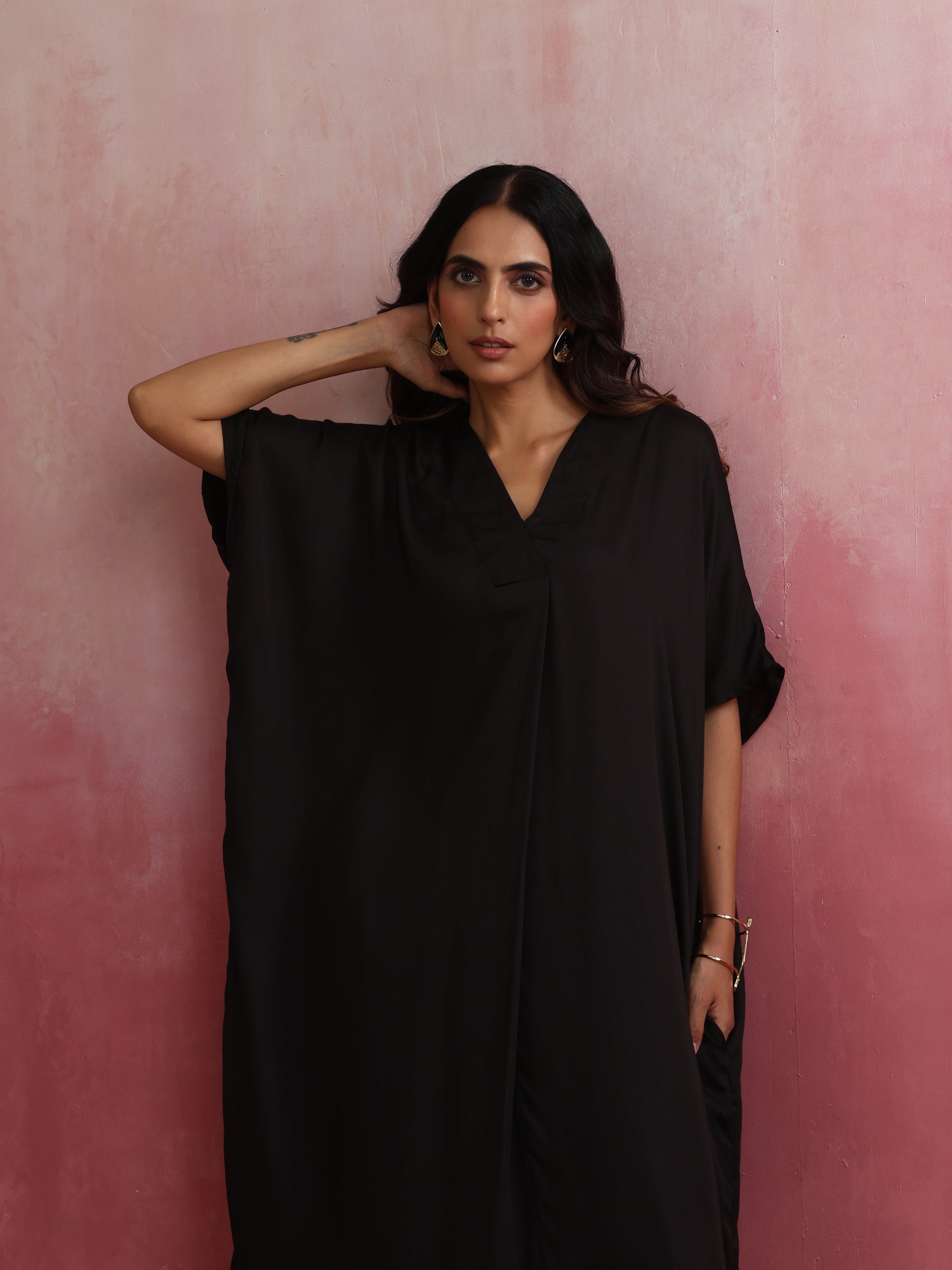 - Elevate your style with this black modal kaftan kurta with v neckline and front pleat.