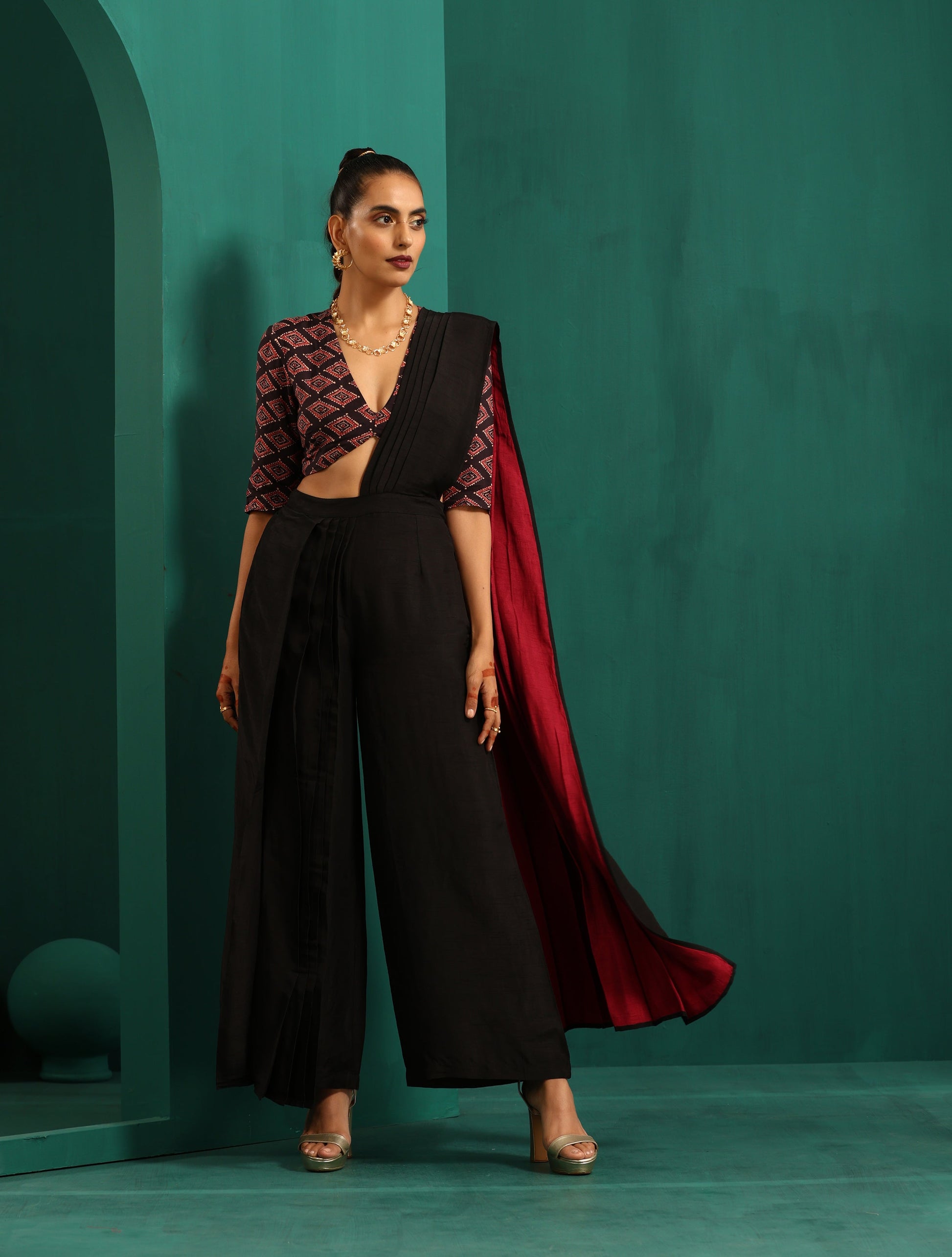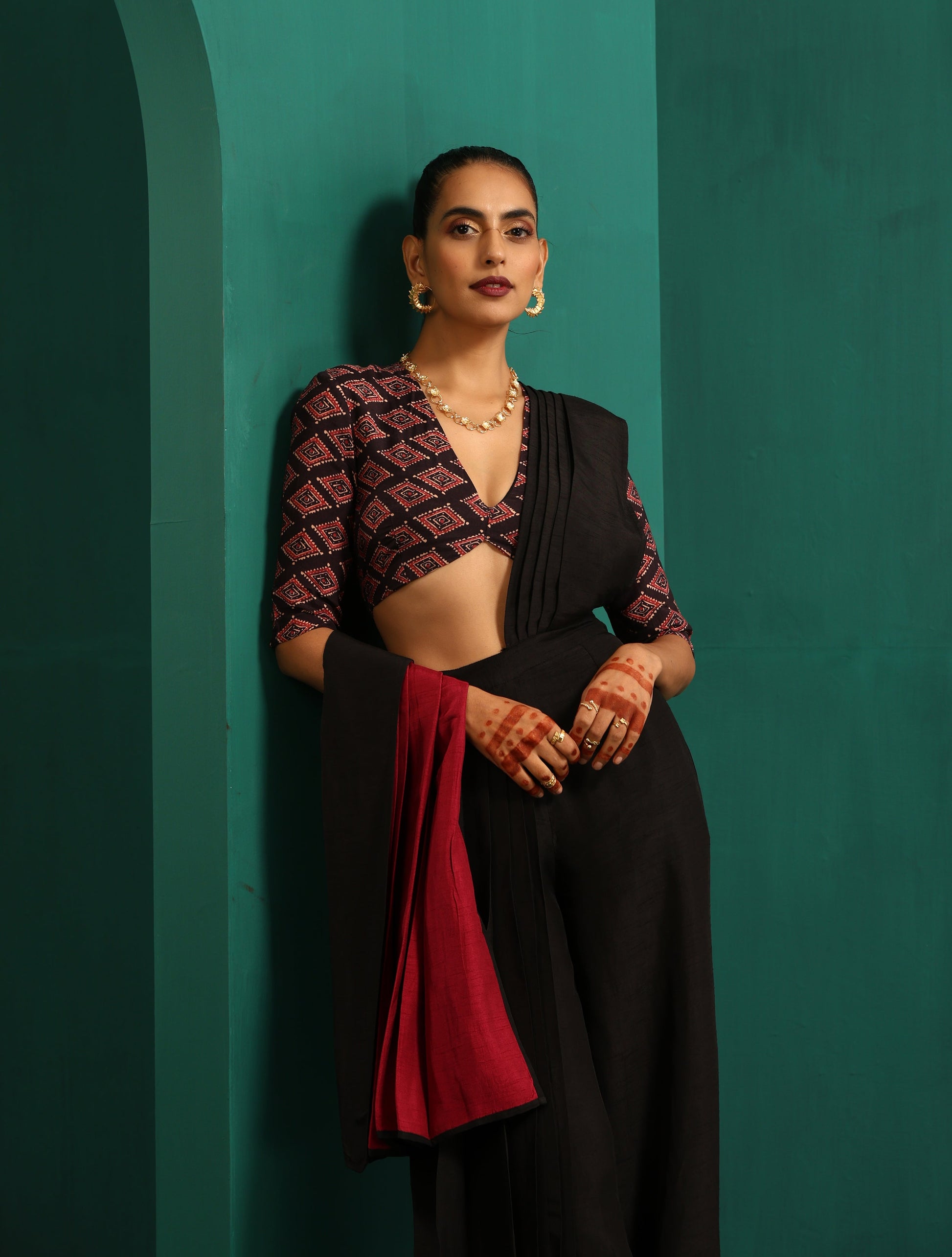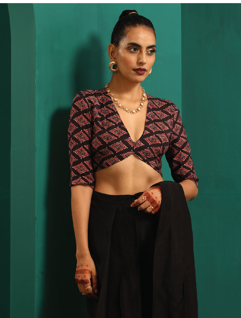 trueBrowns Black Muslin Silk Diamond Printed Deep V-Neck Blouse