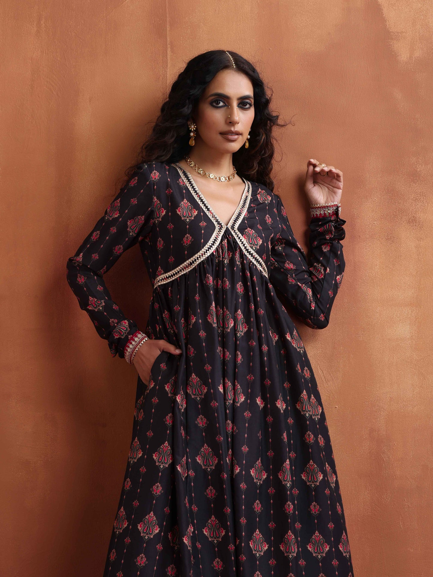 trueBrowns Black Print Flared Anarkali Kurta Set