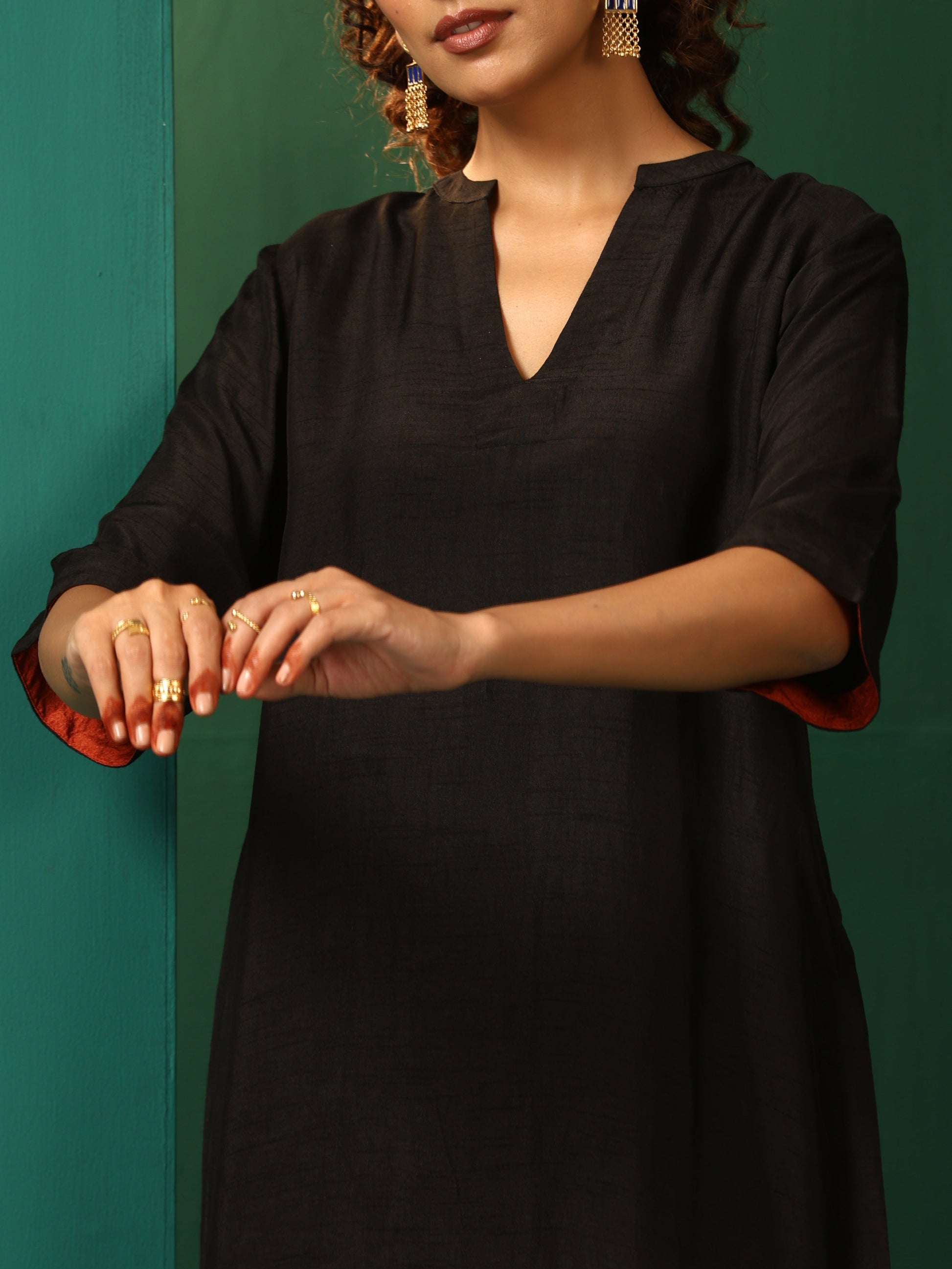 - Silk Blend Flared Kurta with back yoke gathers and high-low hemline. Paired with elasticated waist pant. Style with pair of mules to complete the look.