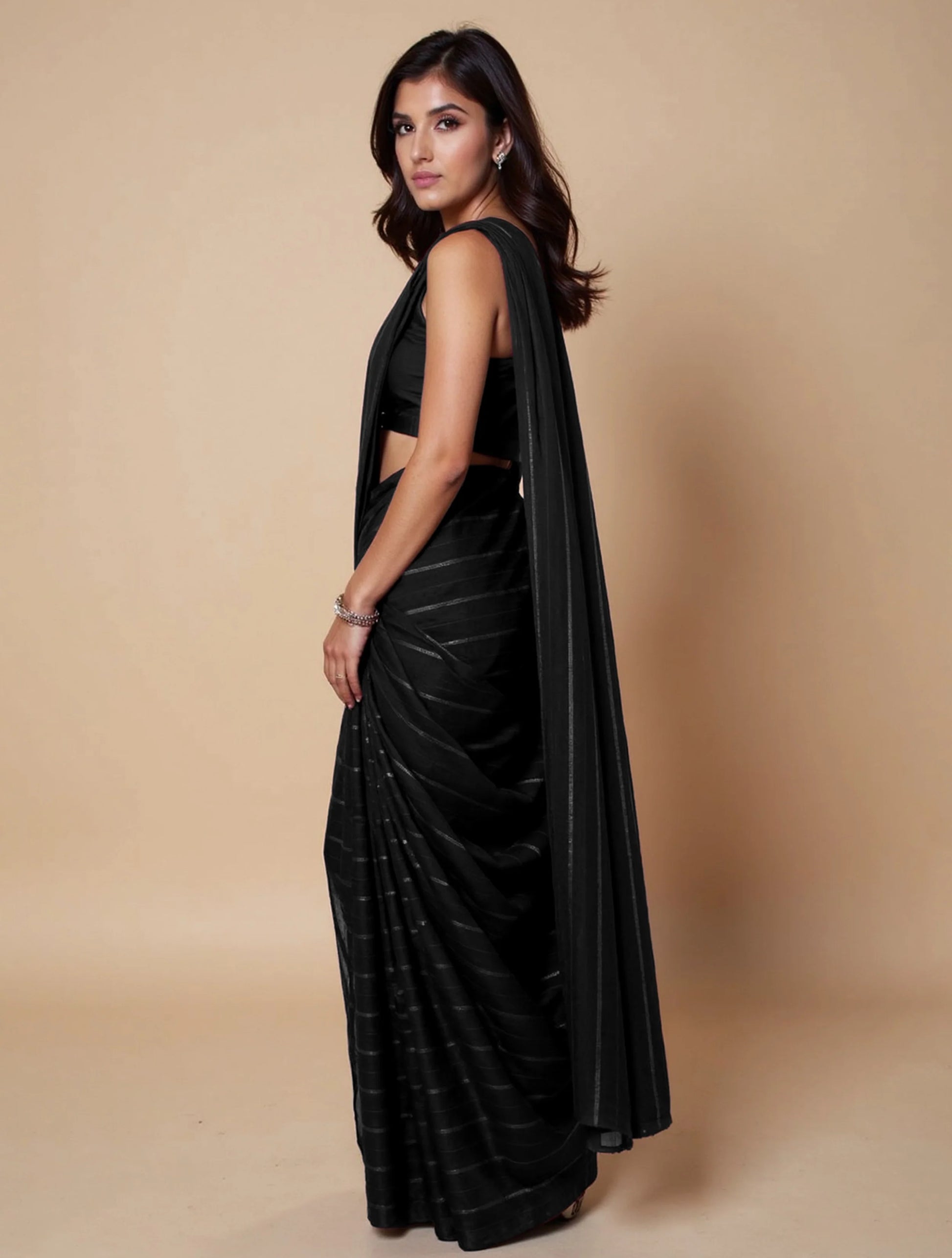 trueBrowns Black Stripe Saree With Unstitched Blouse
