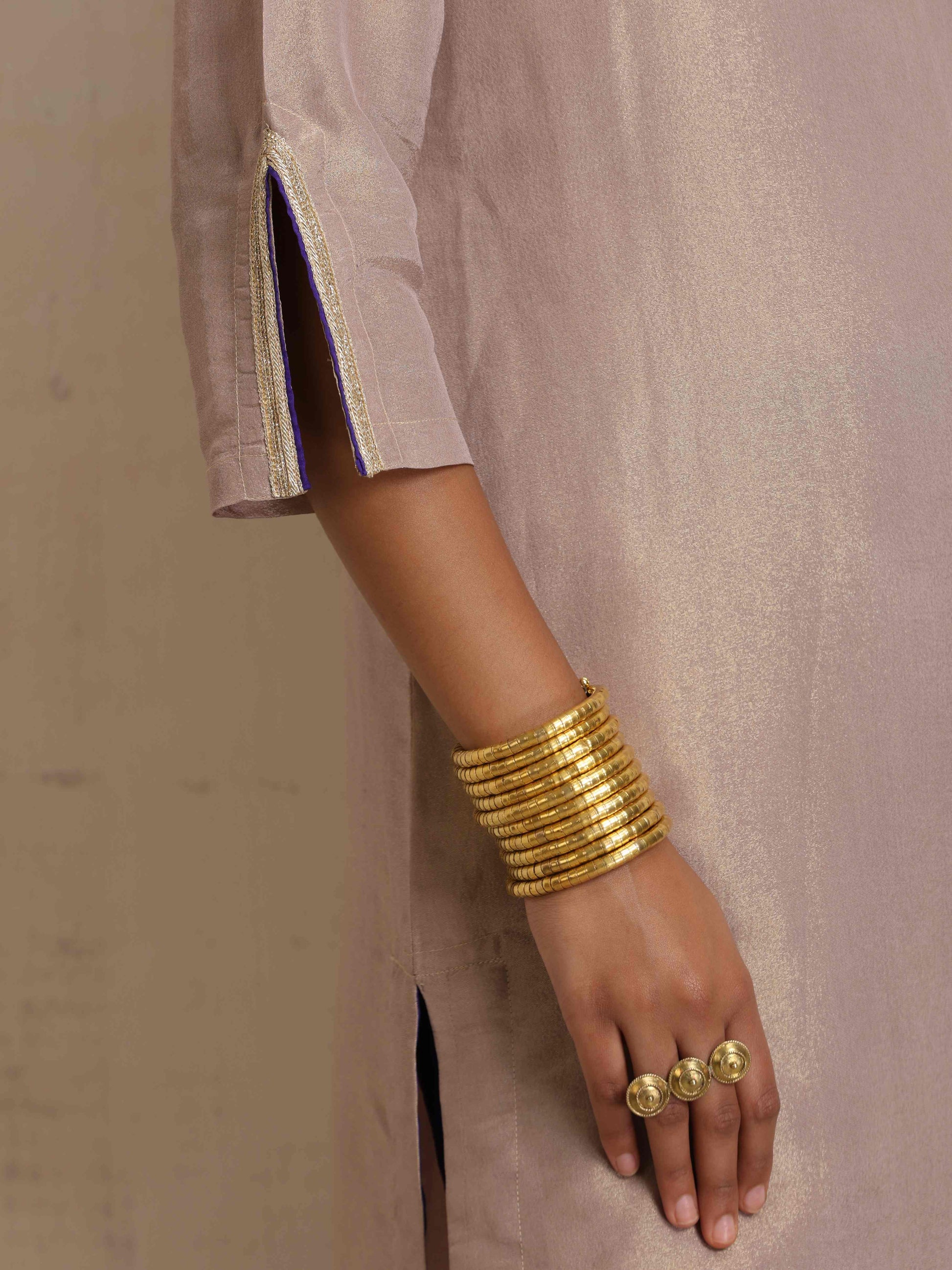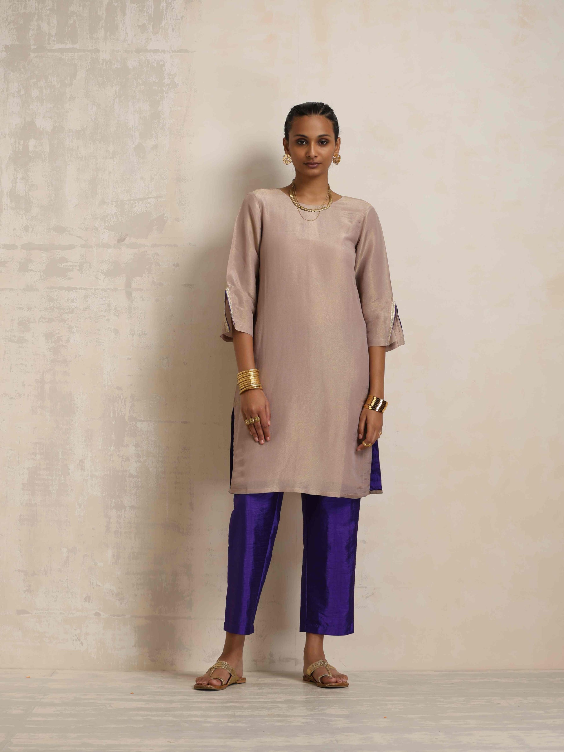 - Elevate your style with this lilac tissue kurta which has slit sleeves paired perfectly with purple silk blend elasticated waist pants.