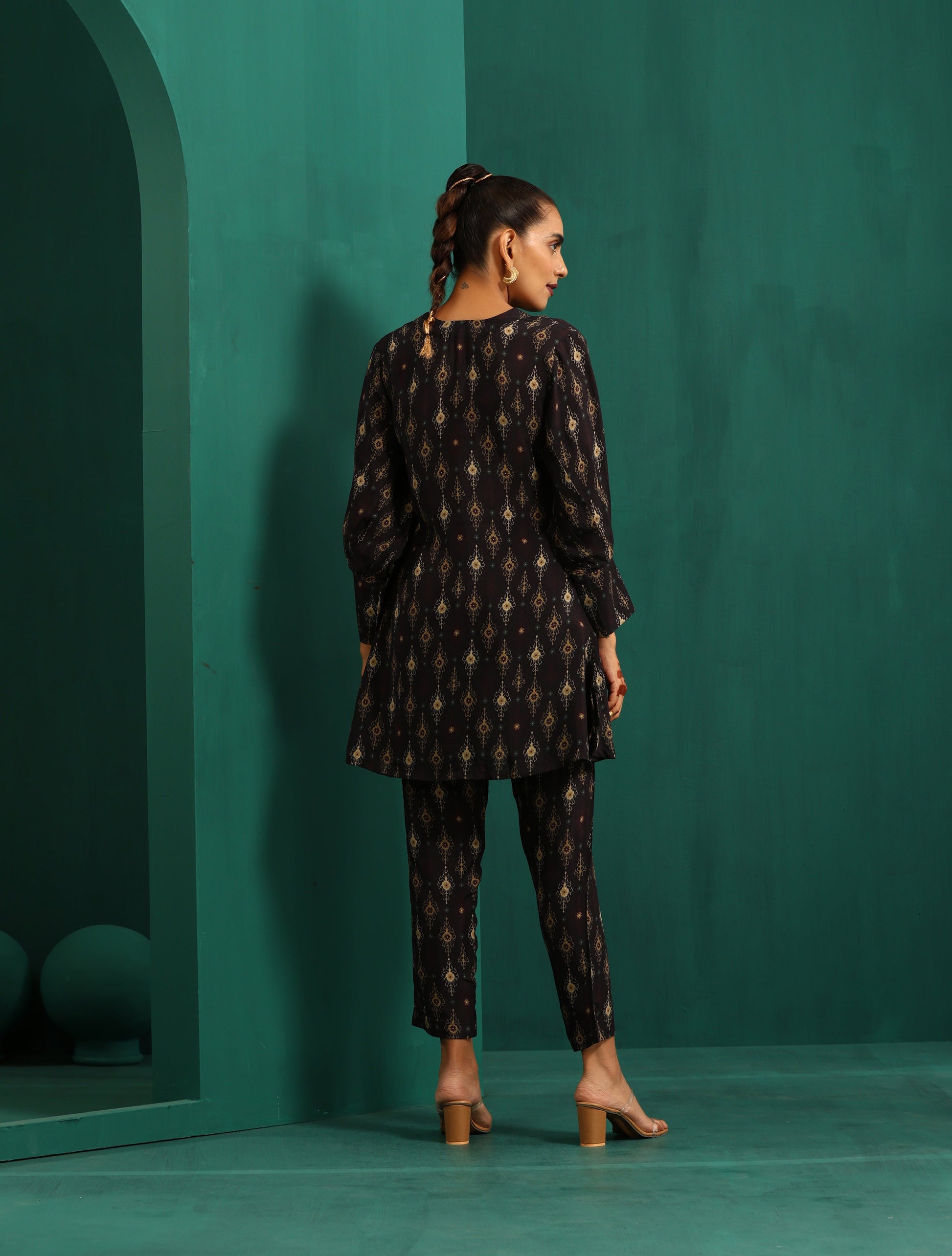 trueBrowns Black Tonal Ikat Muslin Silk Printed V-Neck Front Pleat Co-ord Set