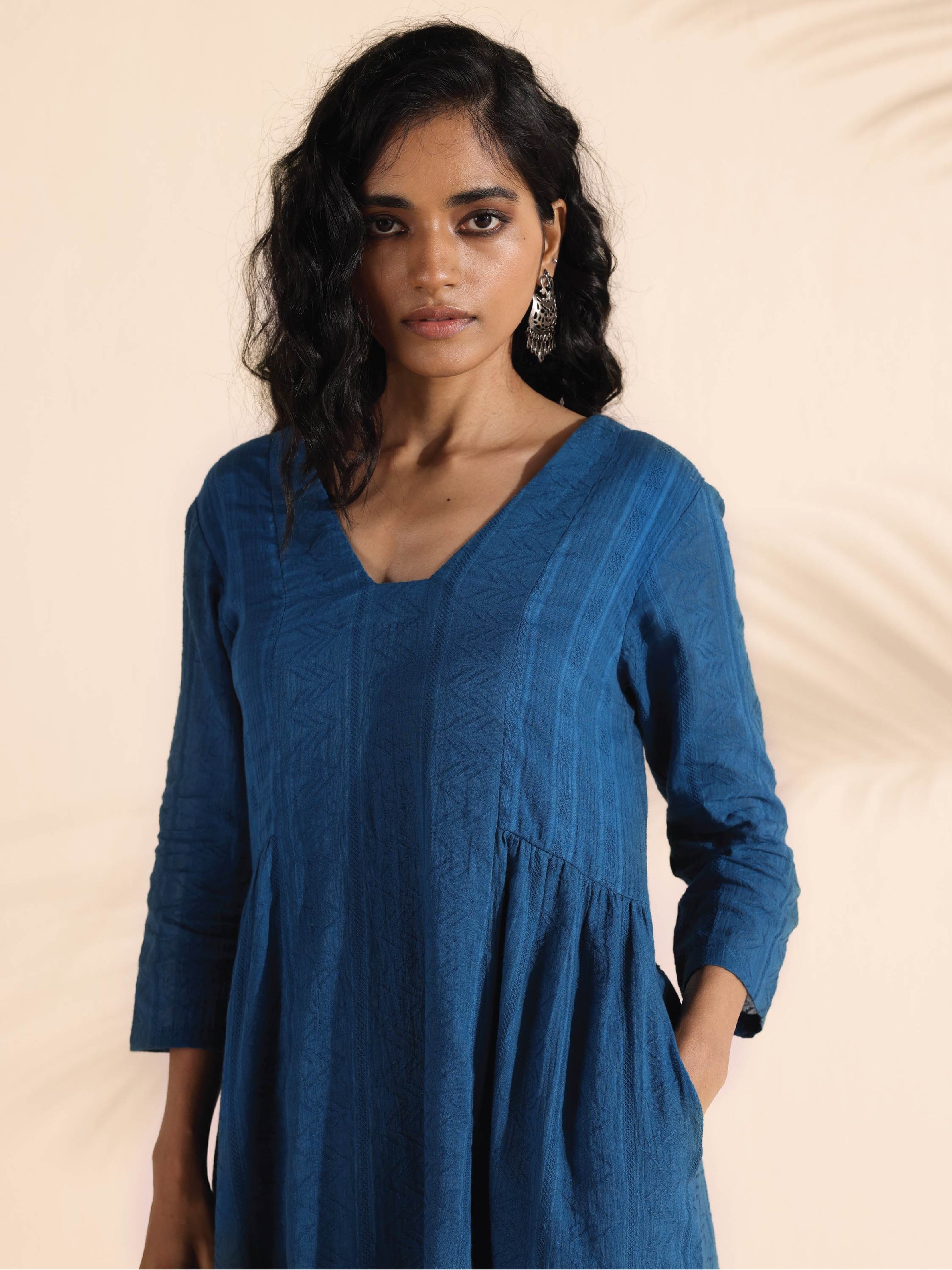 trueBrowns Blue Cotton Dobby Flared Kurta Pant Set