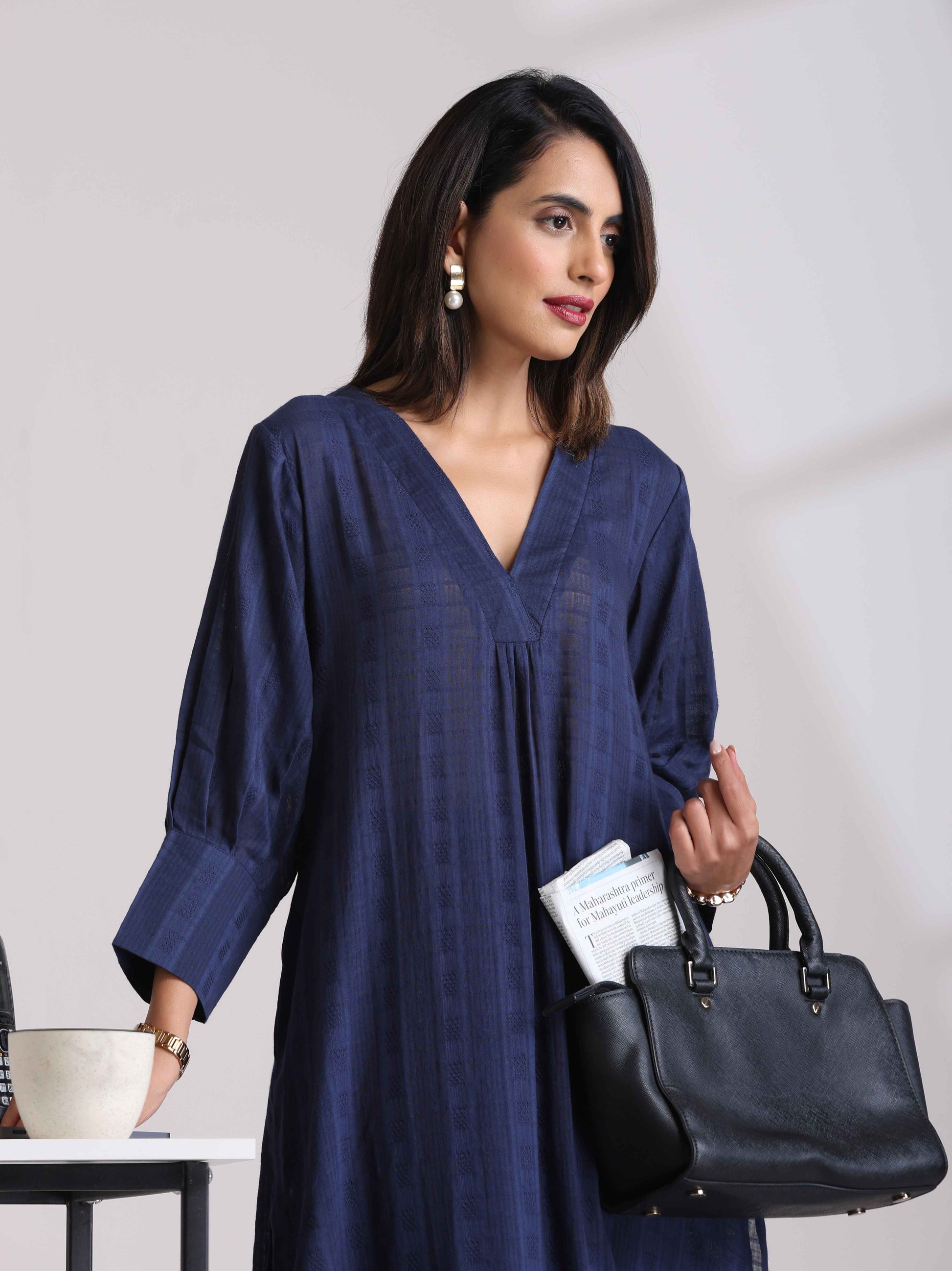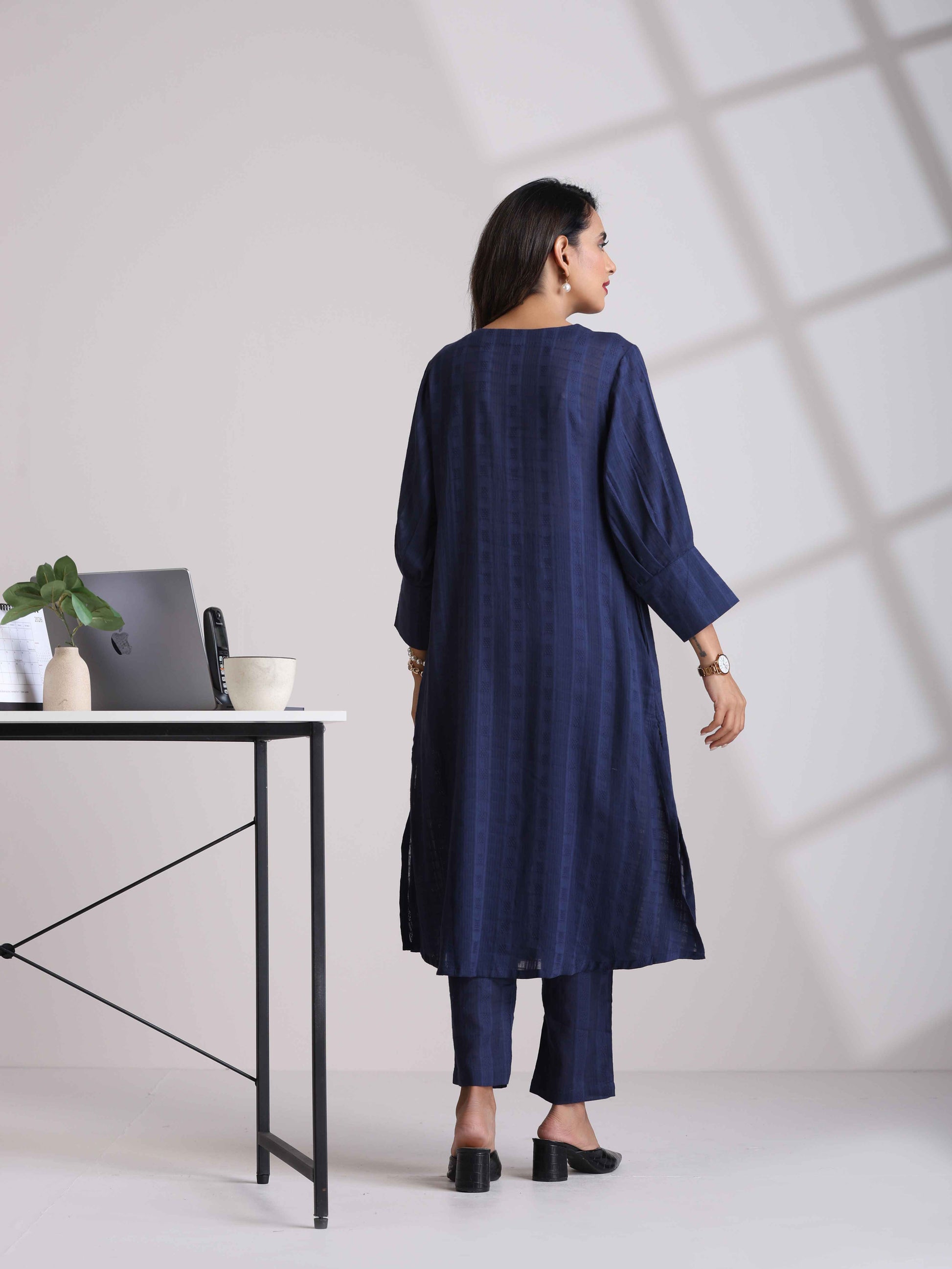 - Cotton Dobby Kurta with V-neckline, neck gathers and puff sleeves with broad cuff. Paired with elasticated waist pant.