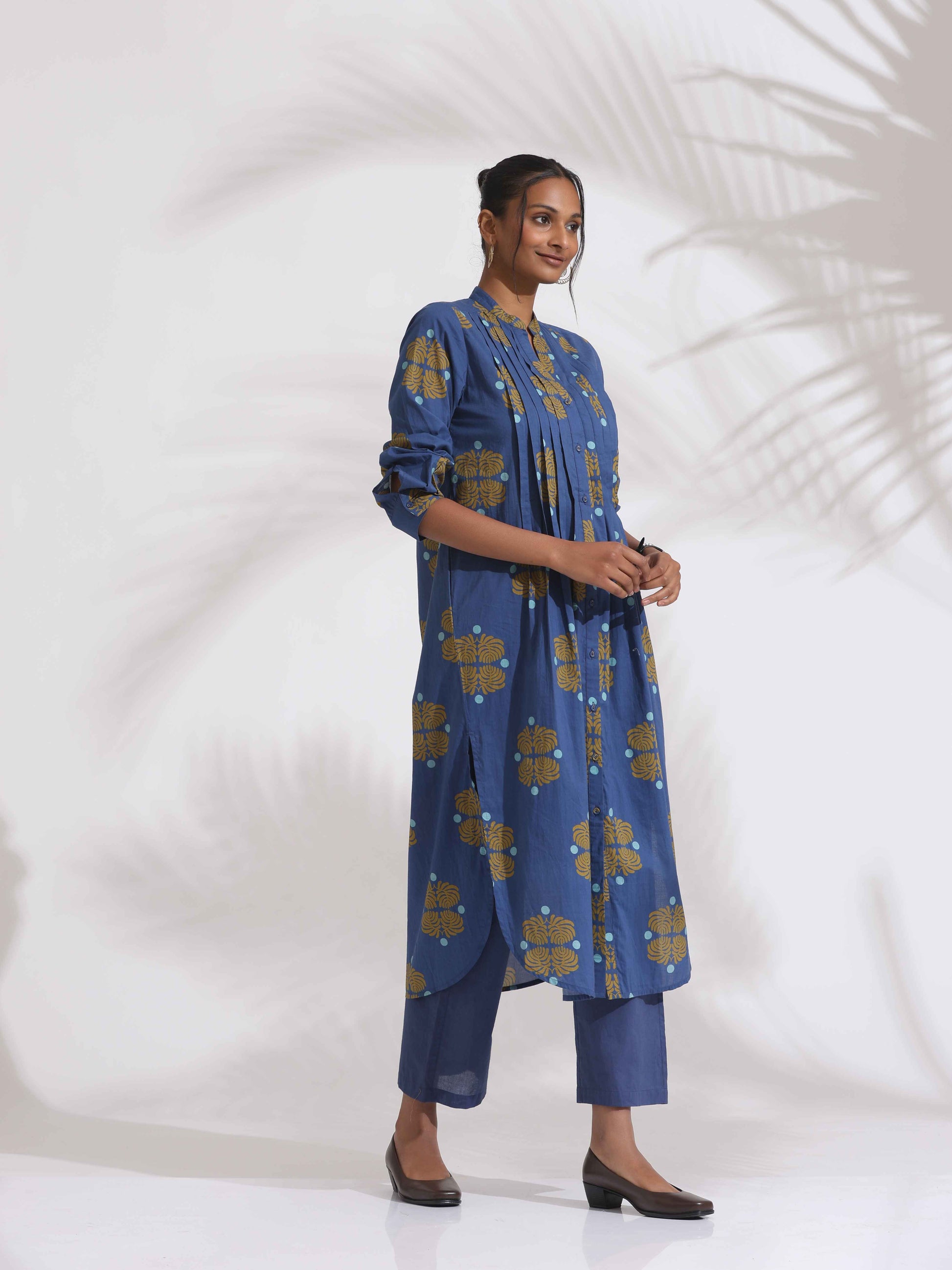 trueBrowns Blue Cotton Print Pleated Kurta Set