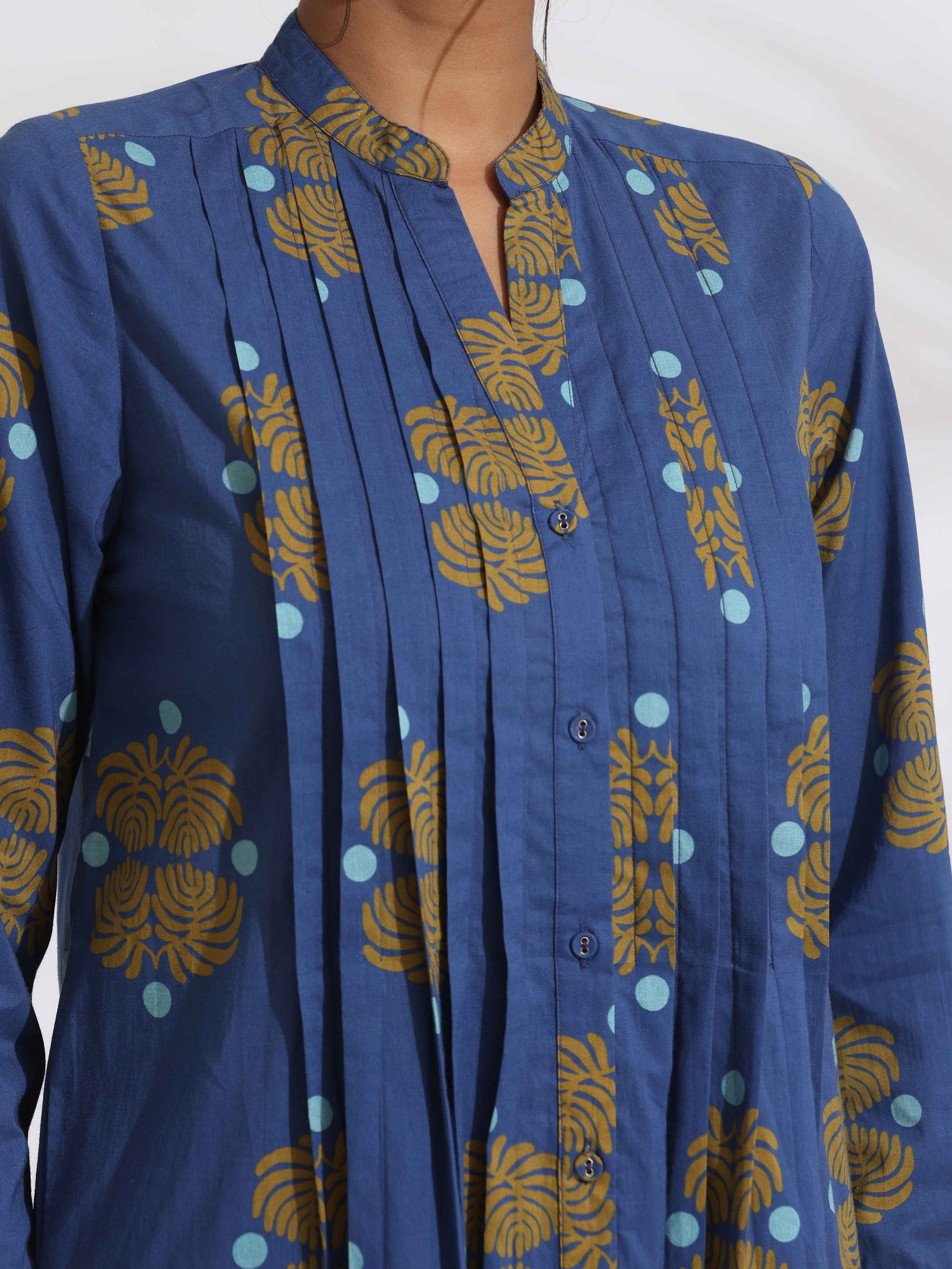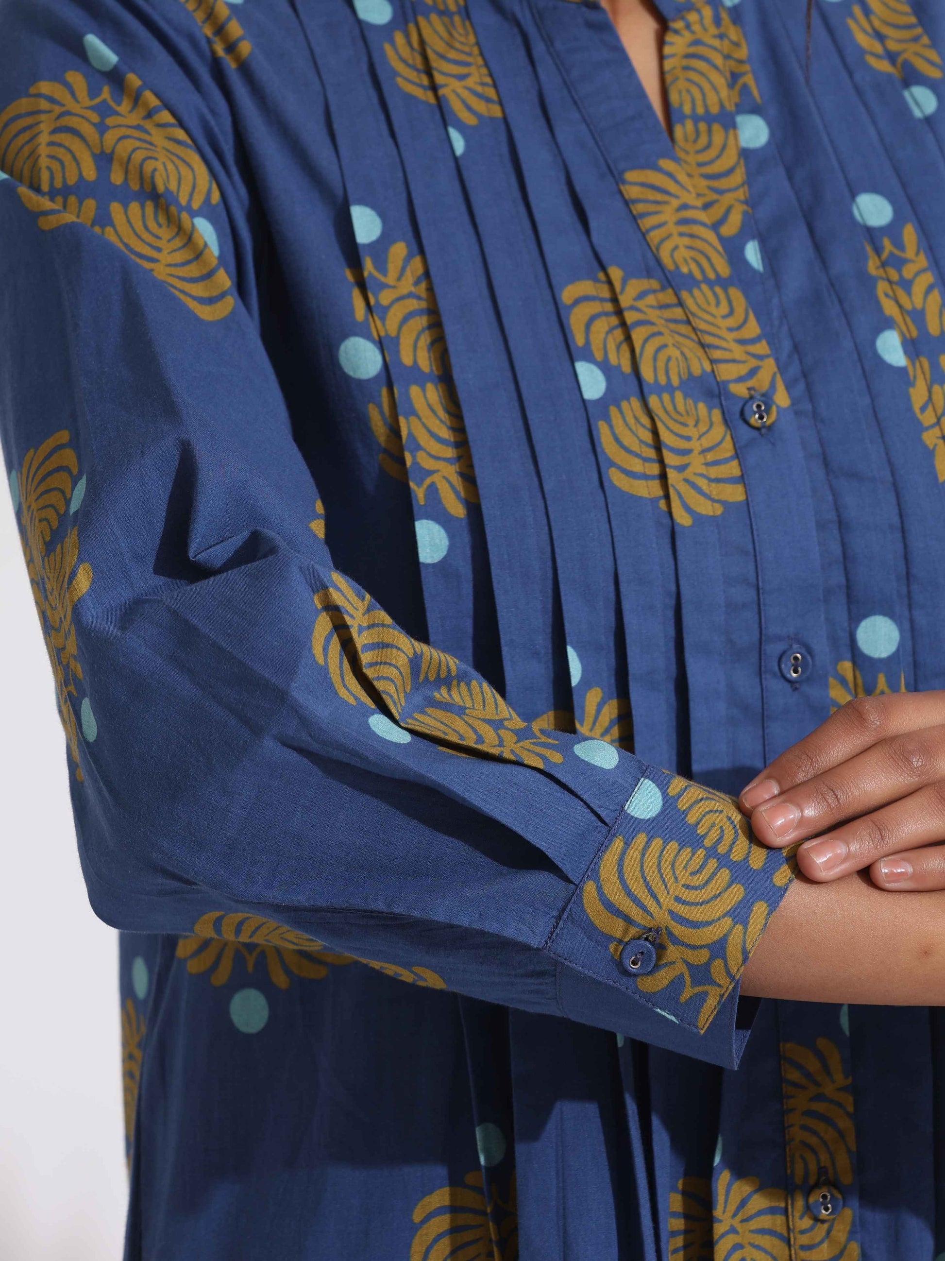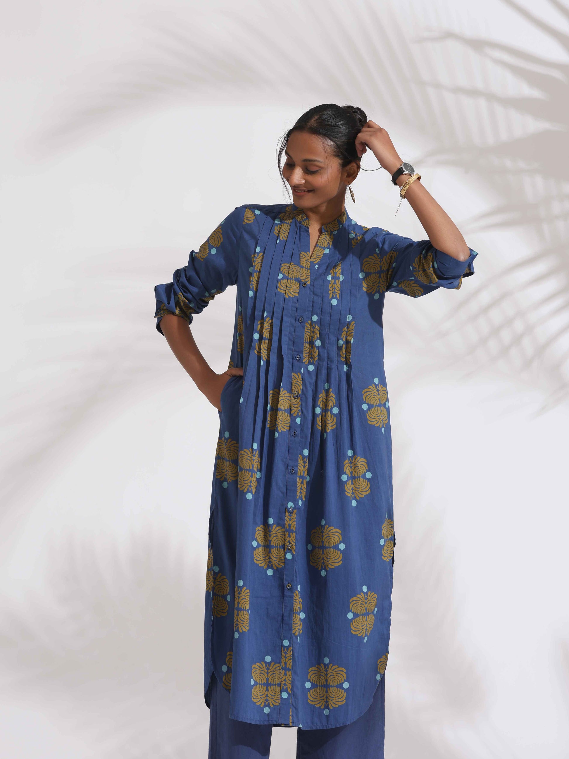 - Elevate your style with this stunning blue cotton print pleated kurta, paired with elegant blue cotton pants. This ensemble is the epitome of style and comfort, offering the perfect fusion of contemporary elegance and effortless ease. Whether you're attending a chic gathering or a semi-formal event, this set promises to turn heads with its refined beauty and flattering silhouette.