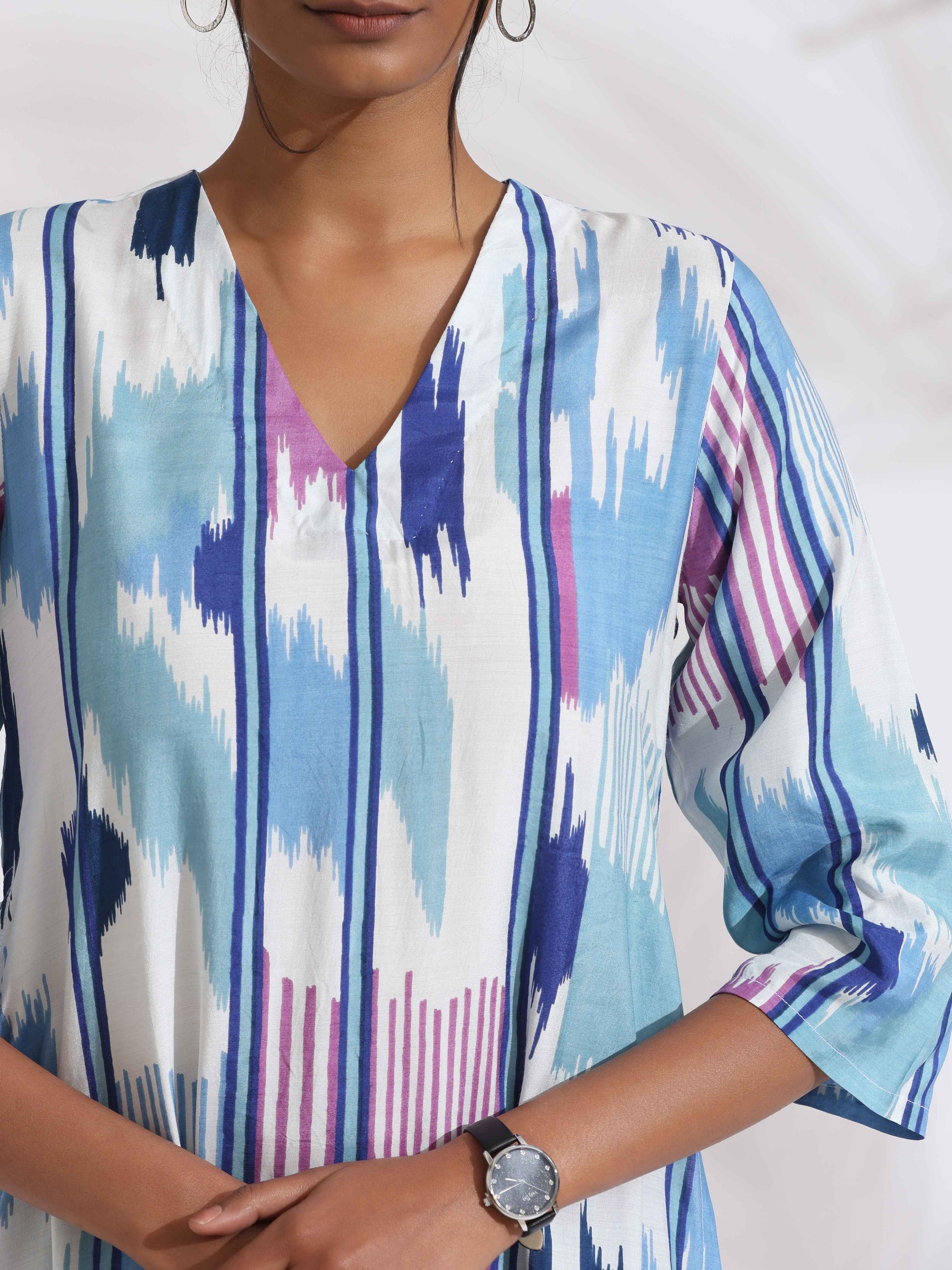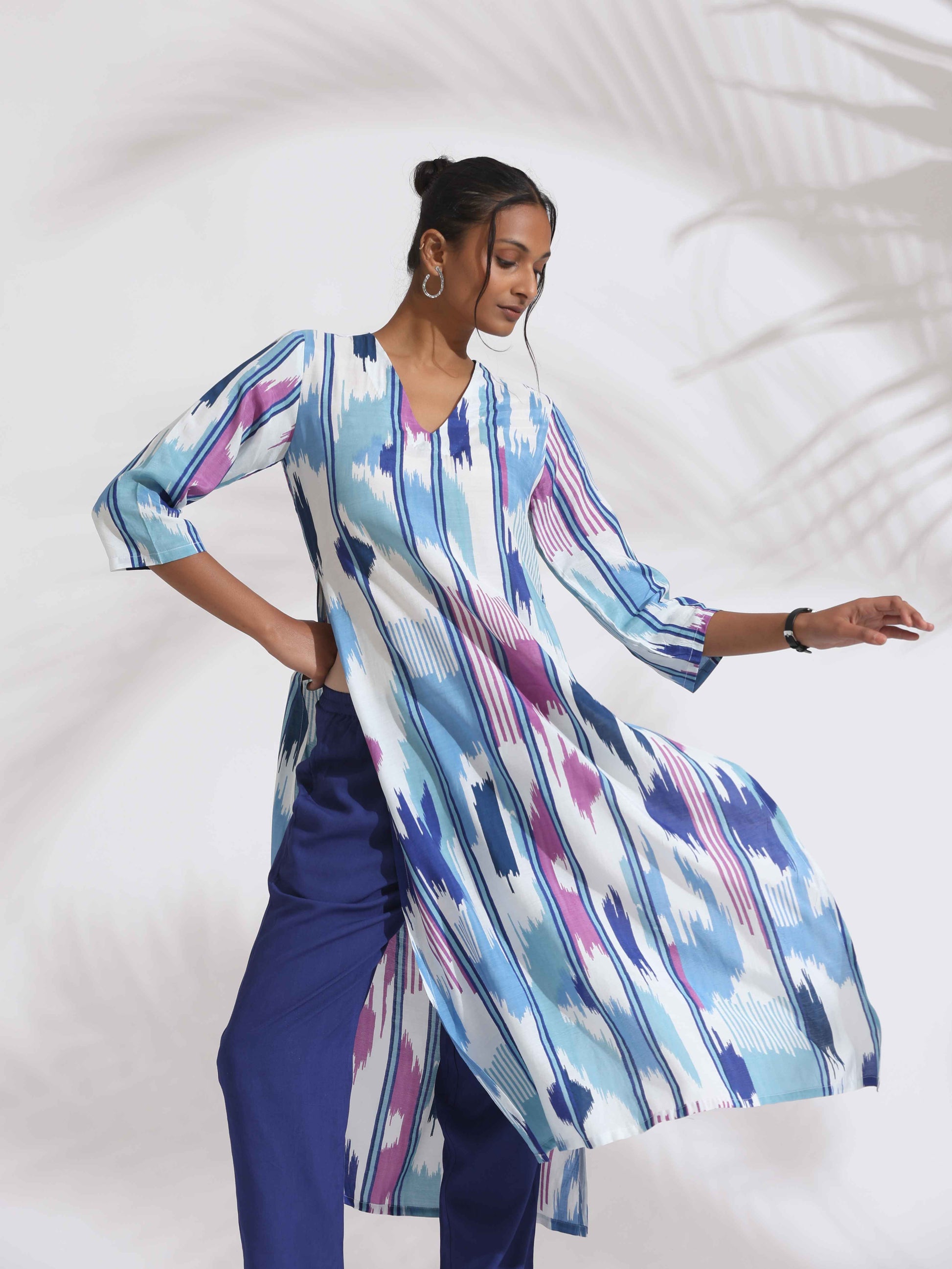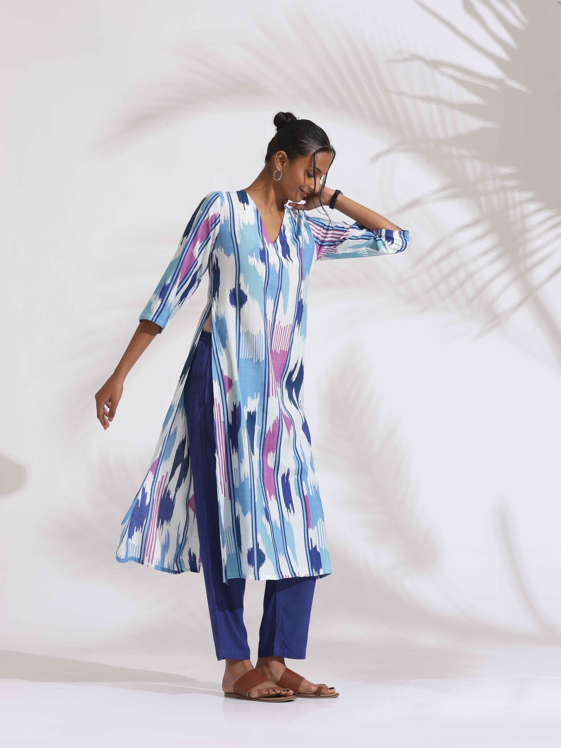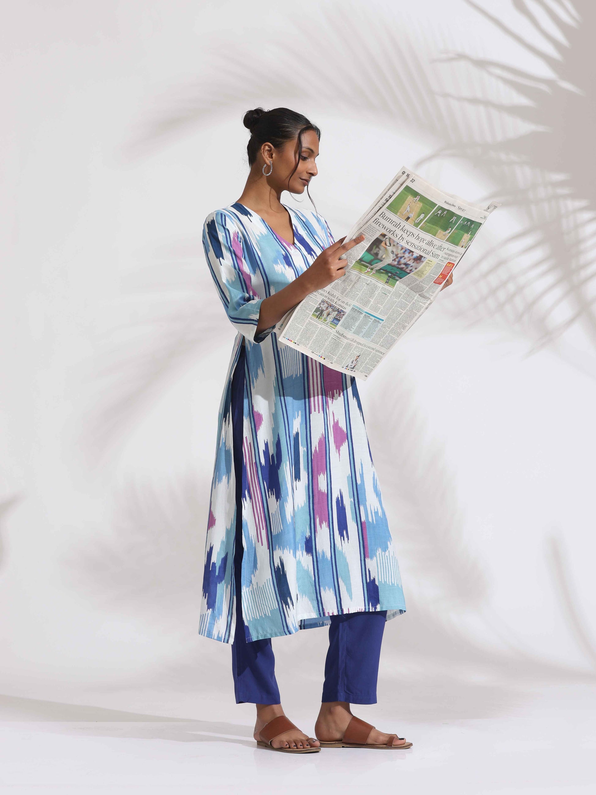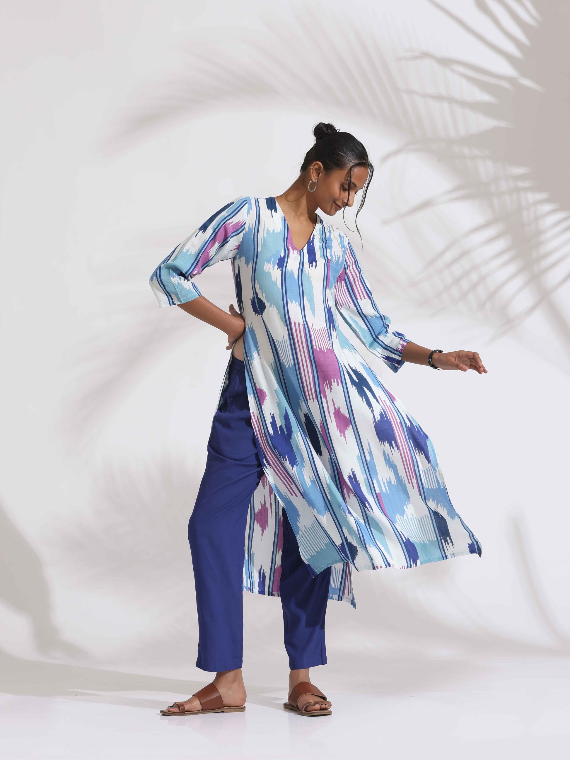 - Elevate your style with this ikat print kurta, featuring a V- neckline and high slit for a modern touch. Paired perfectly with blue muslin pants. It’s the perfect blend of elegance and comfort, ideal for both casual and semi-formal occasions.