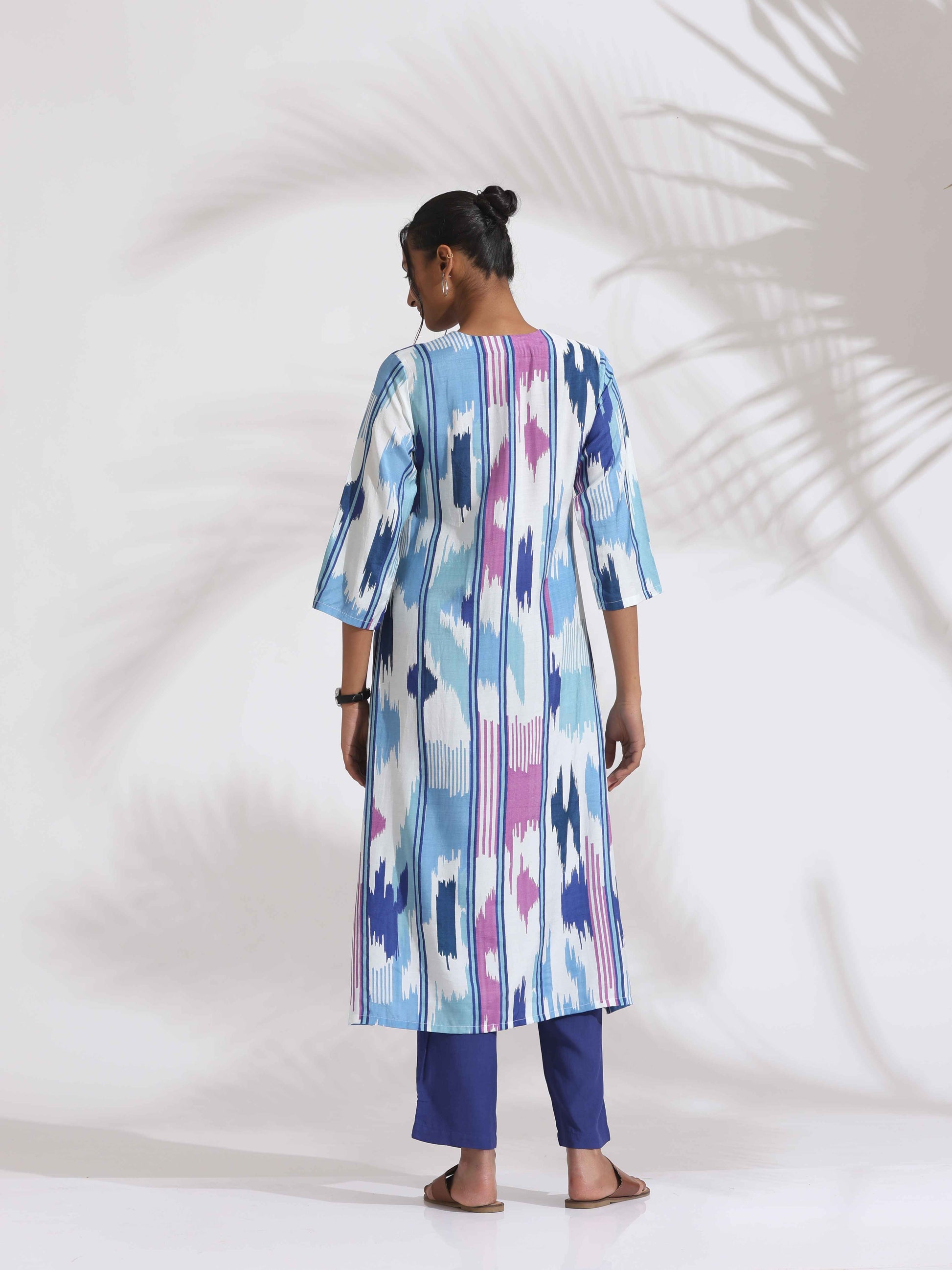 trueBrowns Blue Ikat Print Muslin Kurta Set