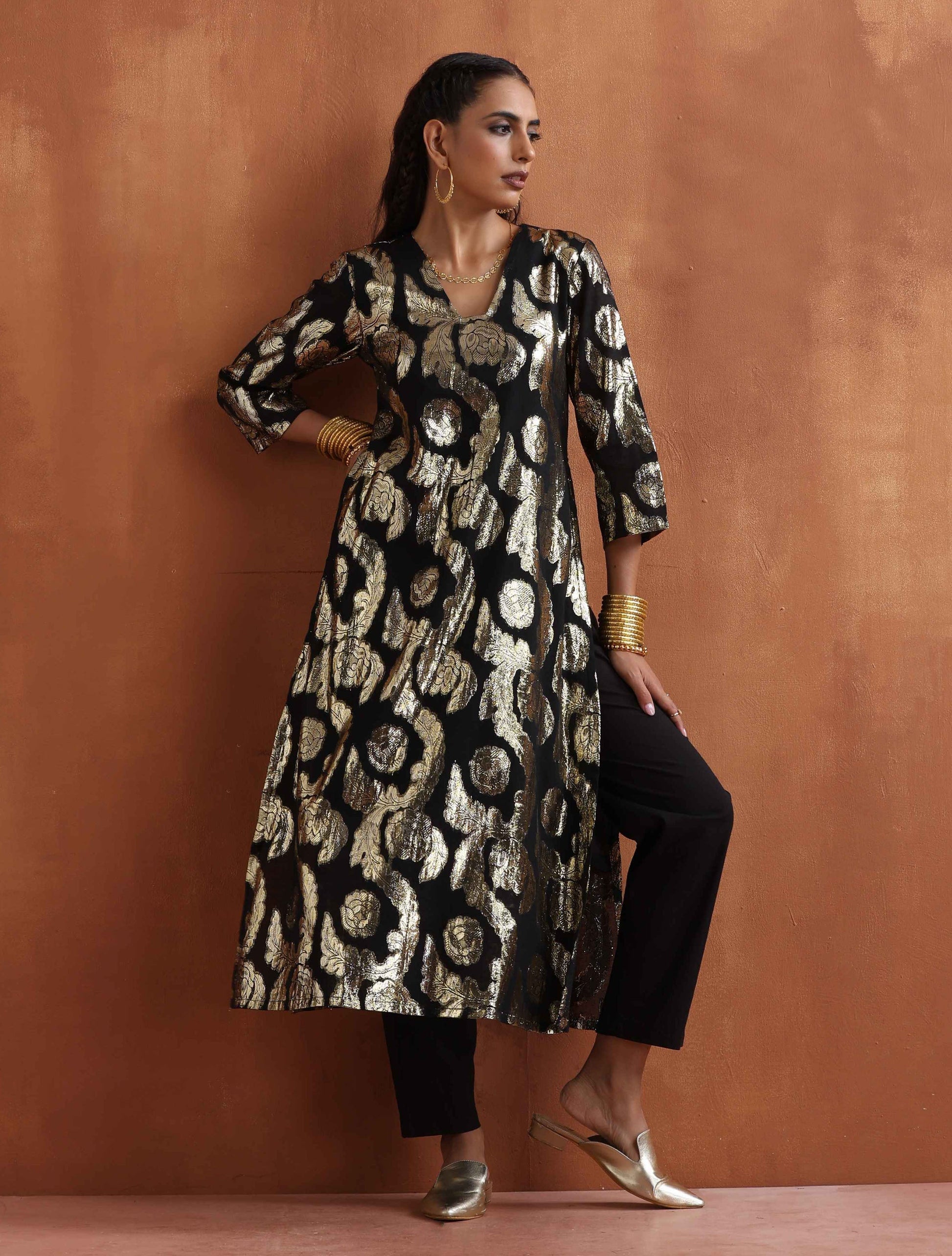 - Elevate your style with this black metallic high slit kurta paired with black pant, it's an ideal blend of elegance and comfort.