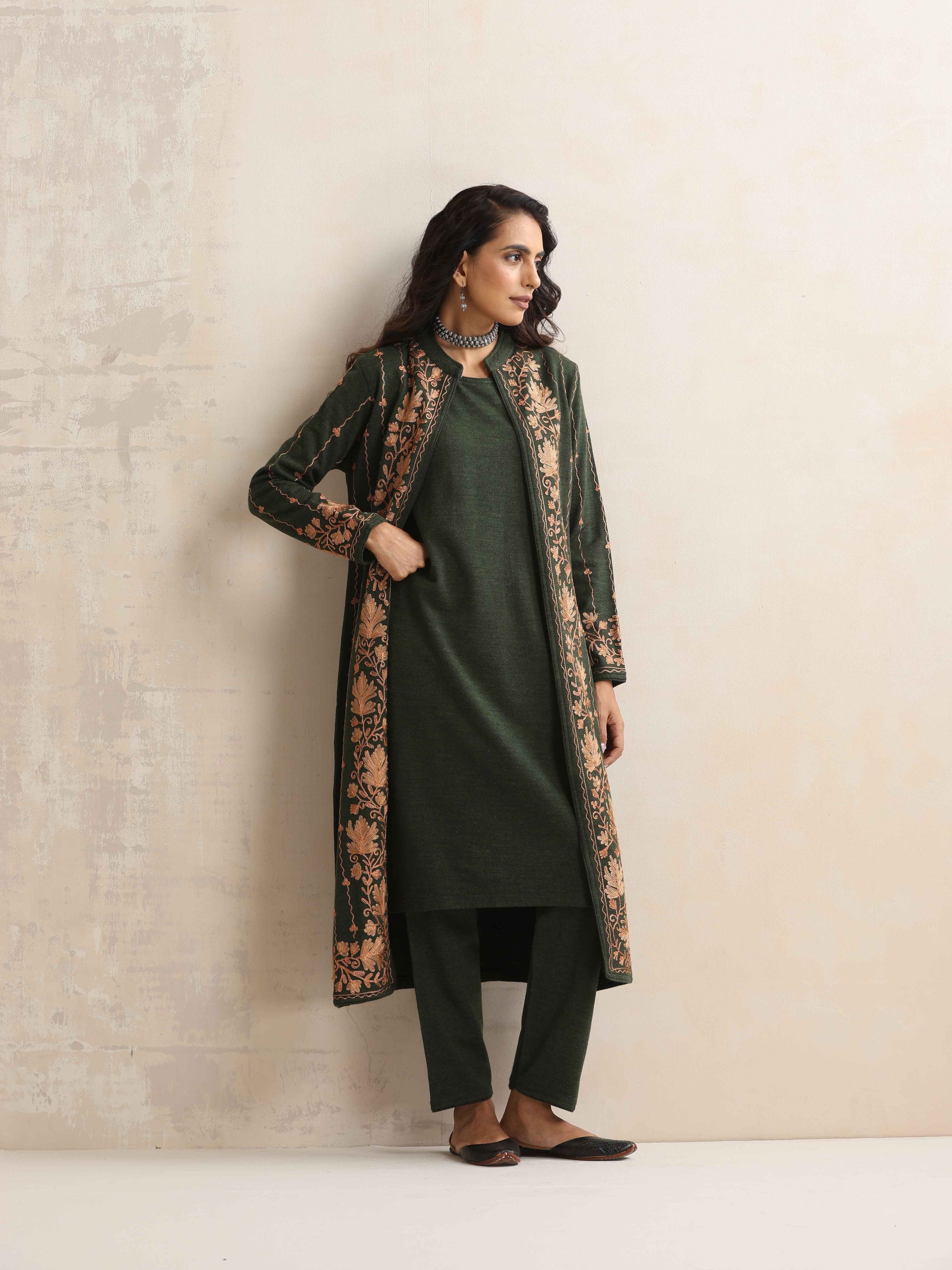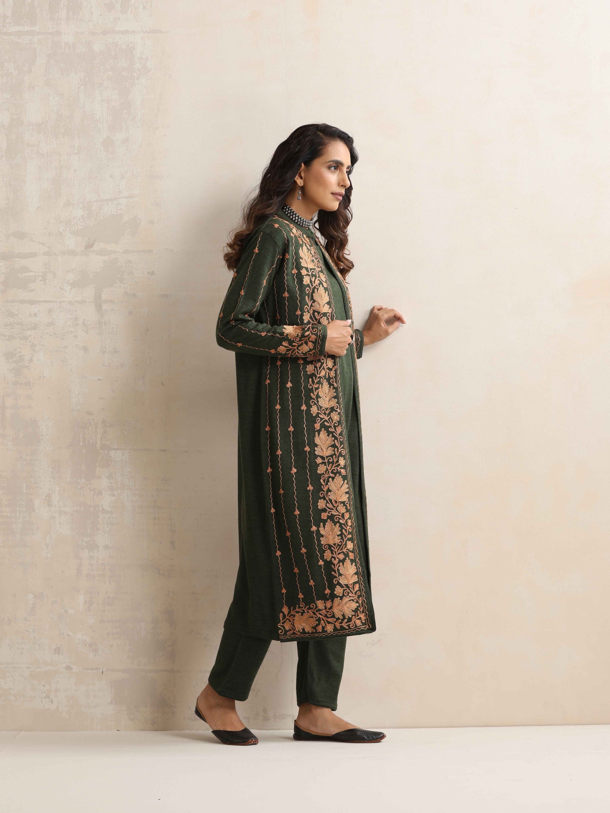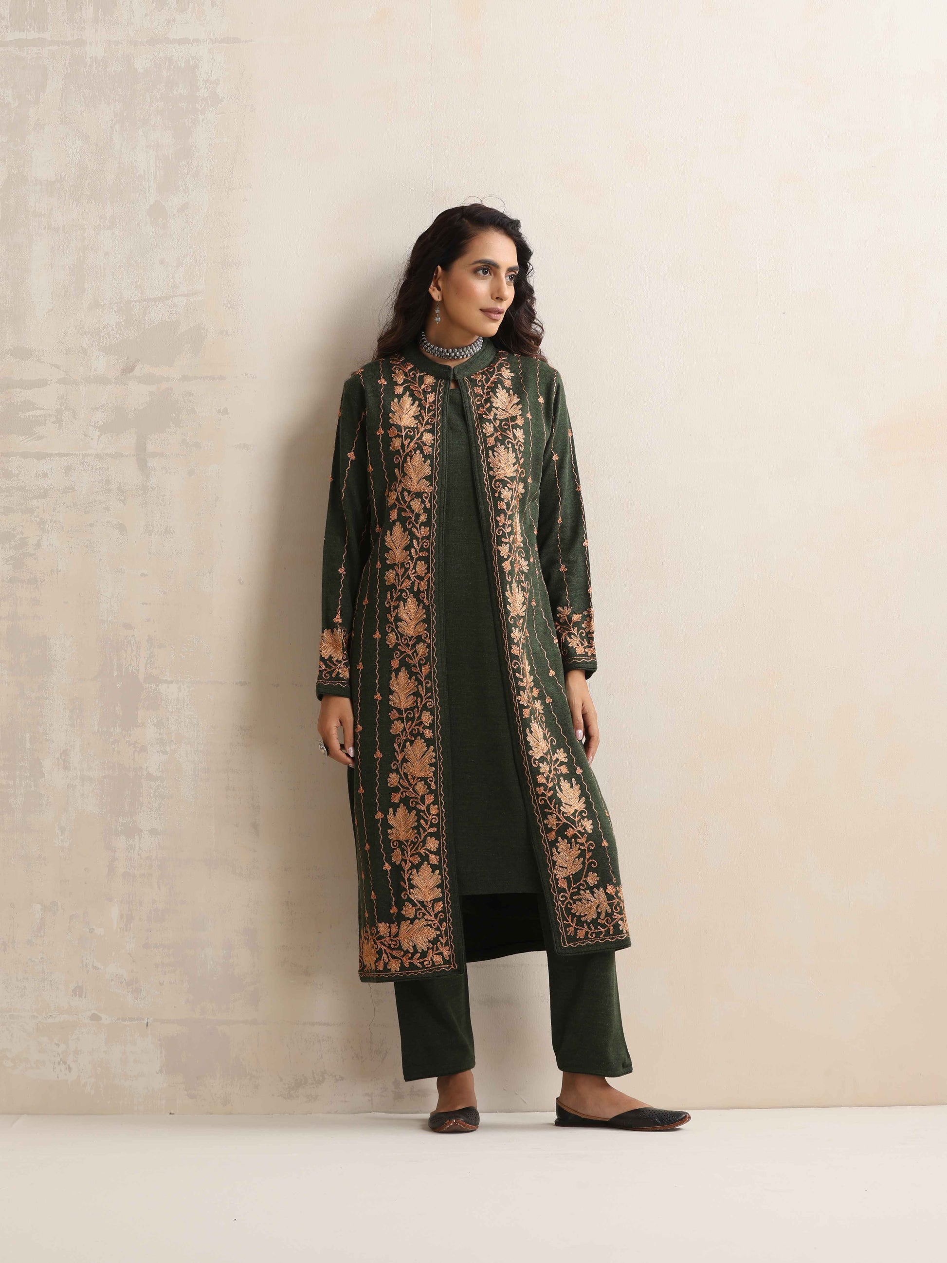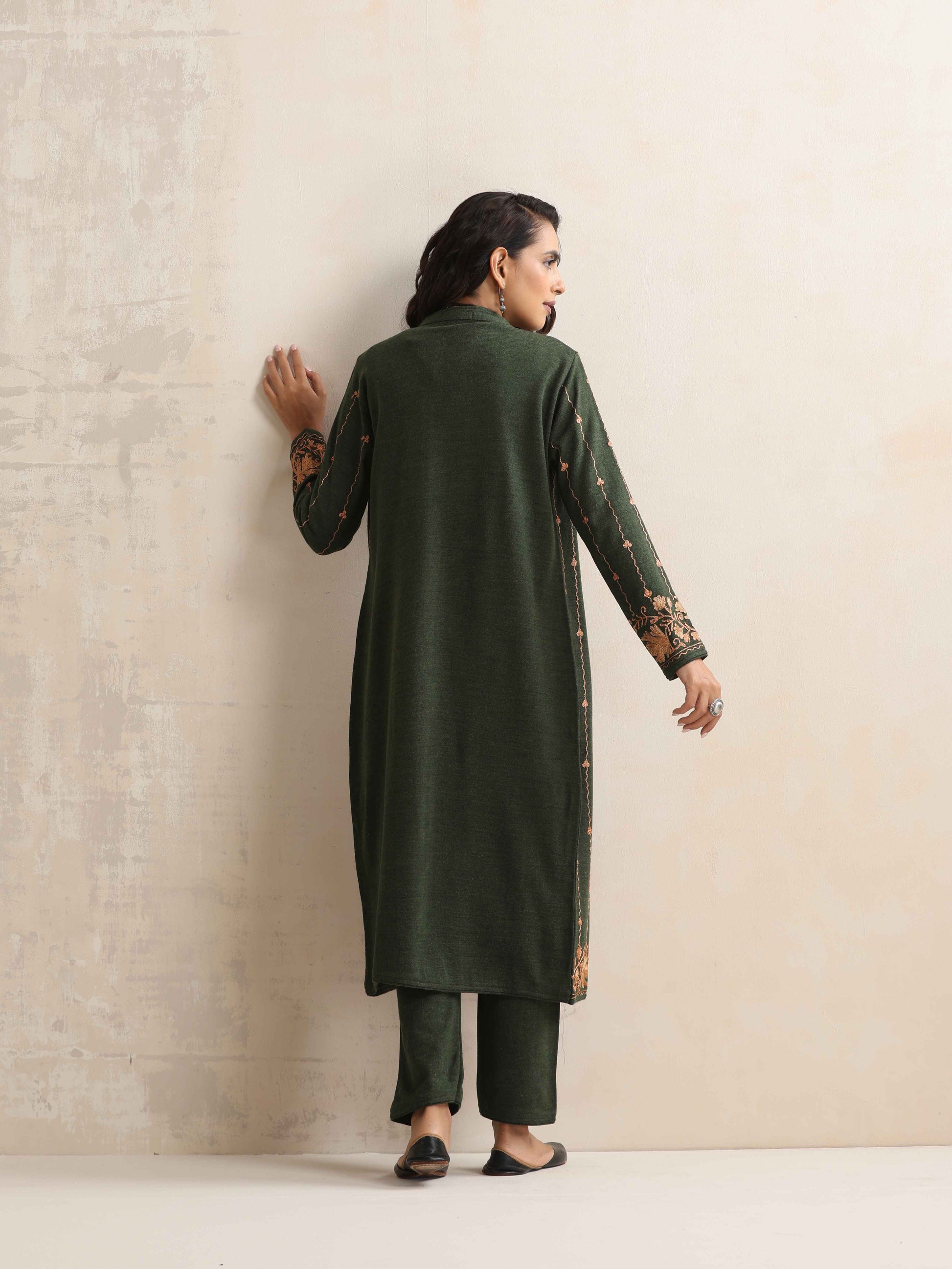 trueBrowns Green Kashmiri Woollen Jacket 3pc Set