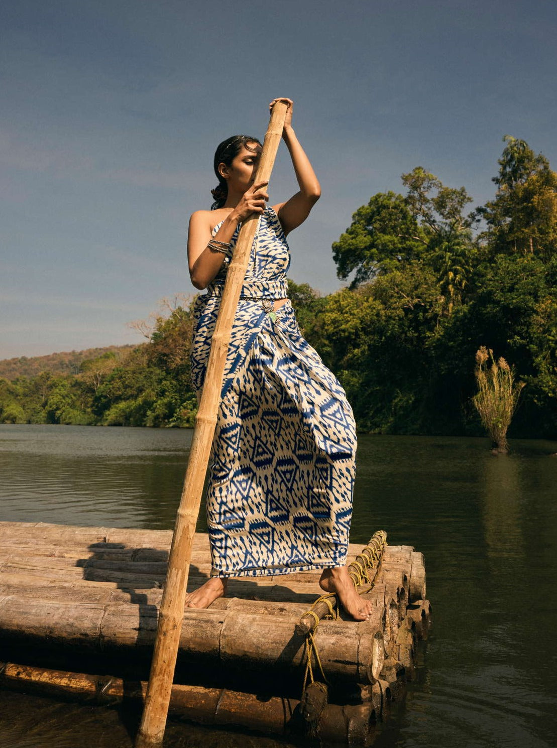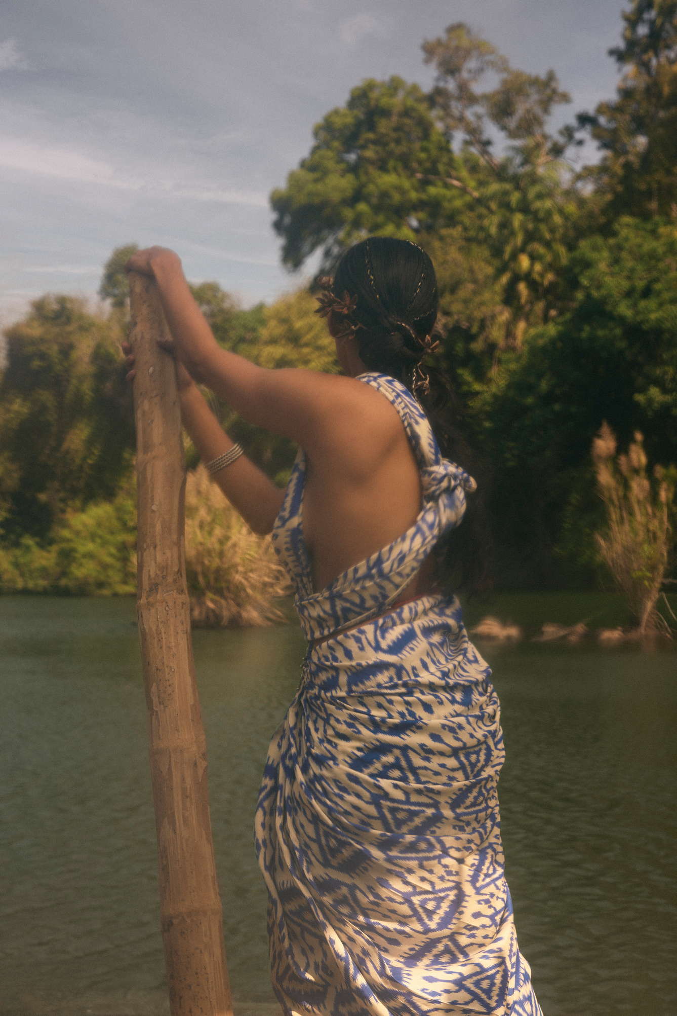 - Muslin Ikat Diamond Printed pre-stitched saree with solid Muslin Silk.