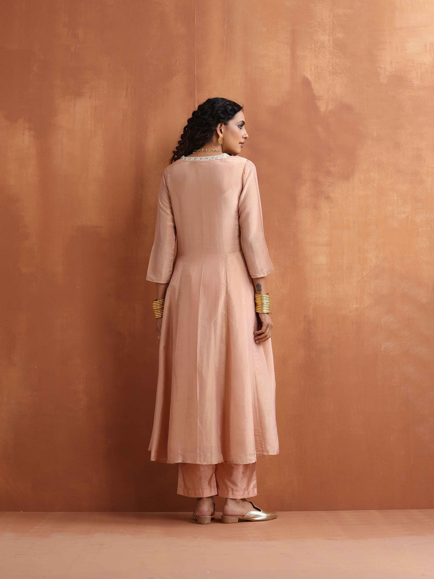 - Elevate your style with this blush tissue flared anarkali kurta paired perfectly with blush silk blend elasticated waist pants