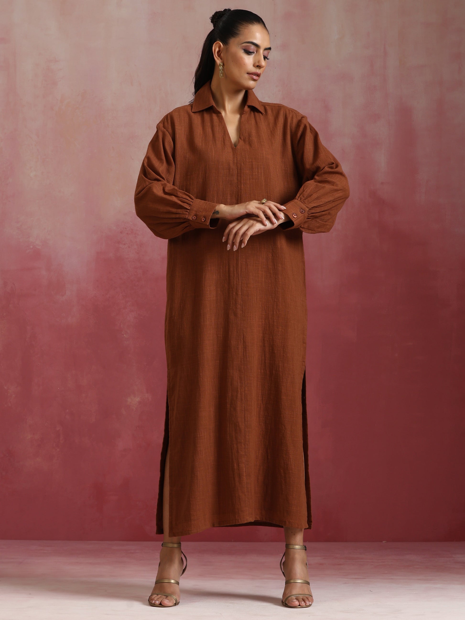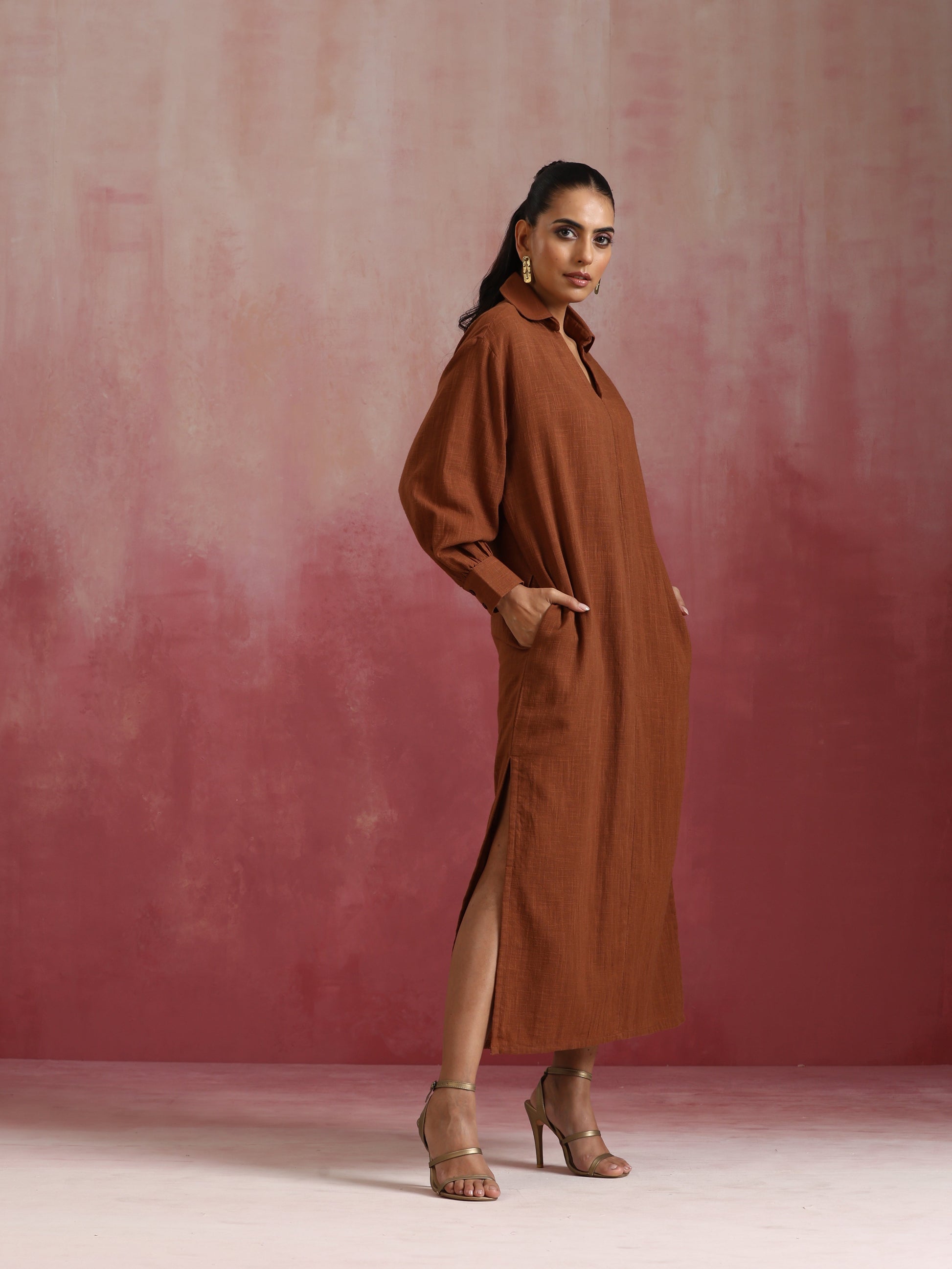 Elevate your style with this brown cotton dobby dress. It's an ideal blend of elegance and comfort.