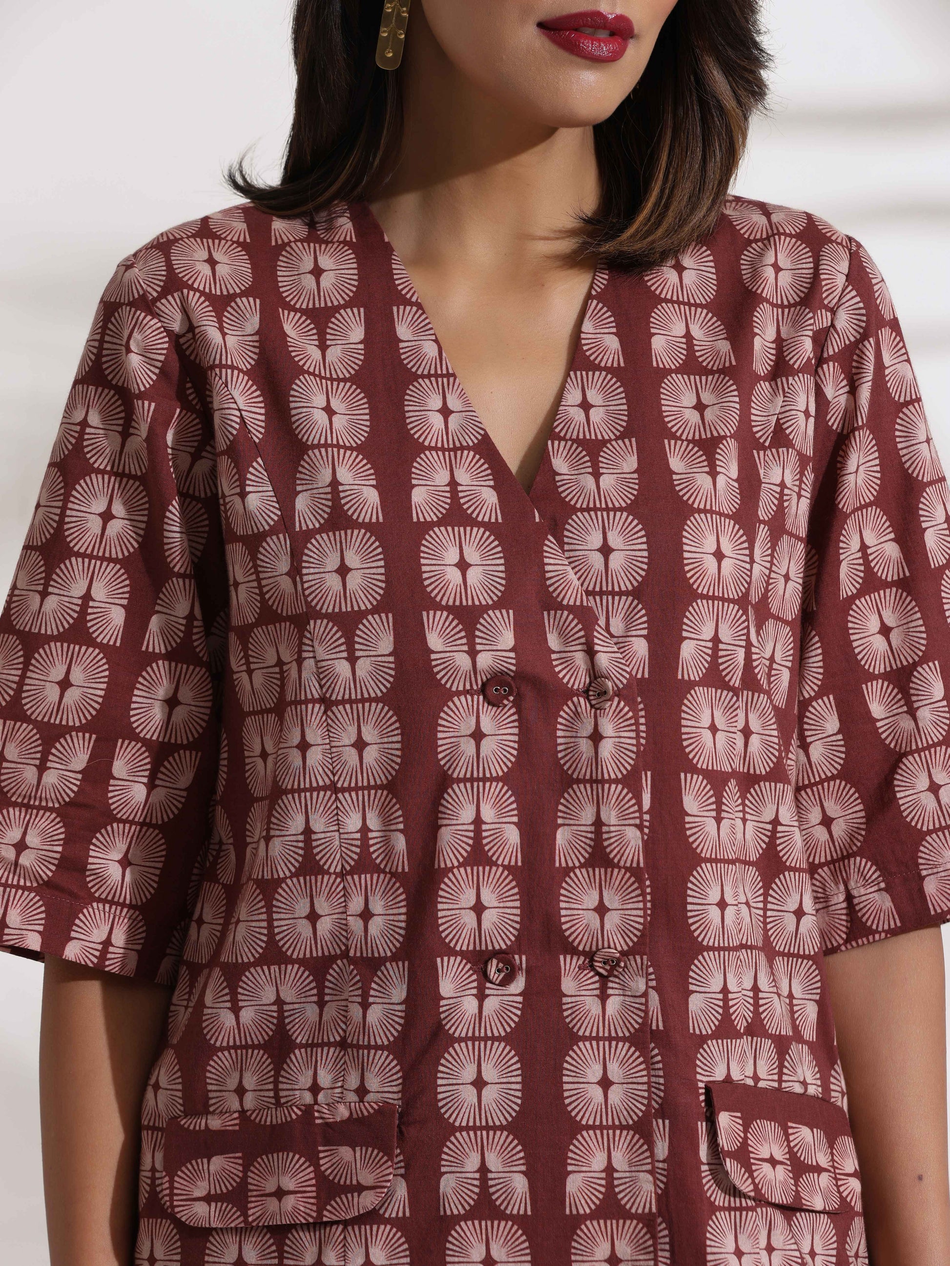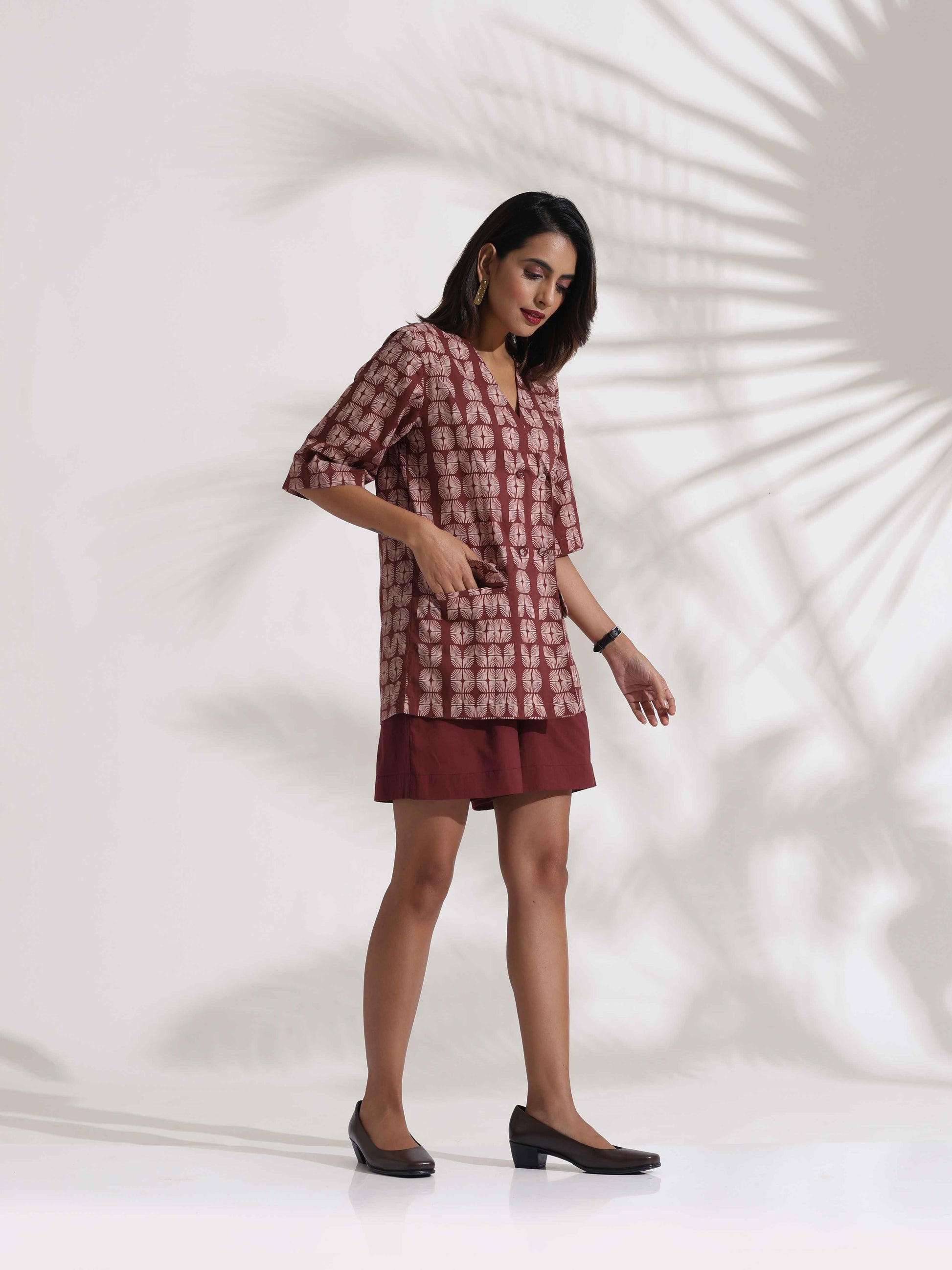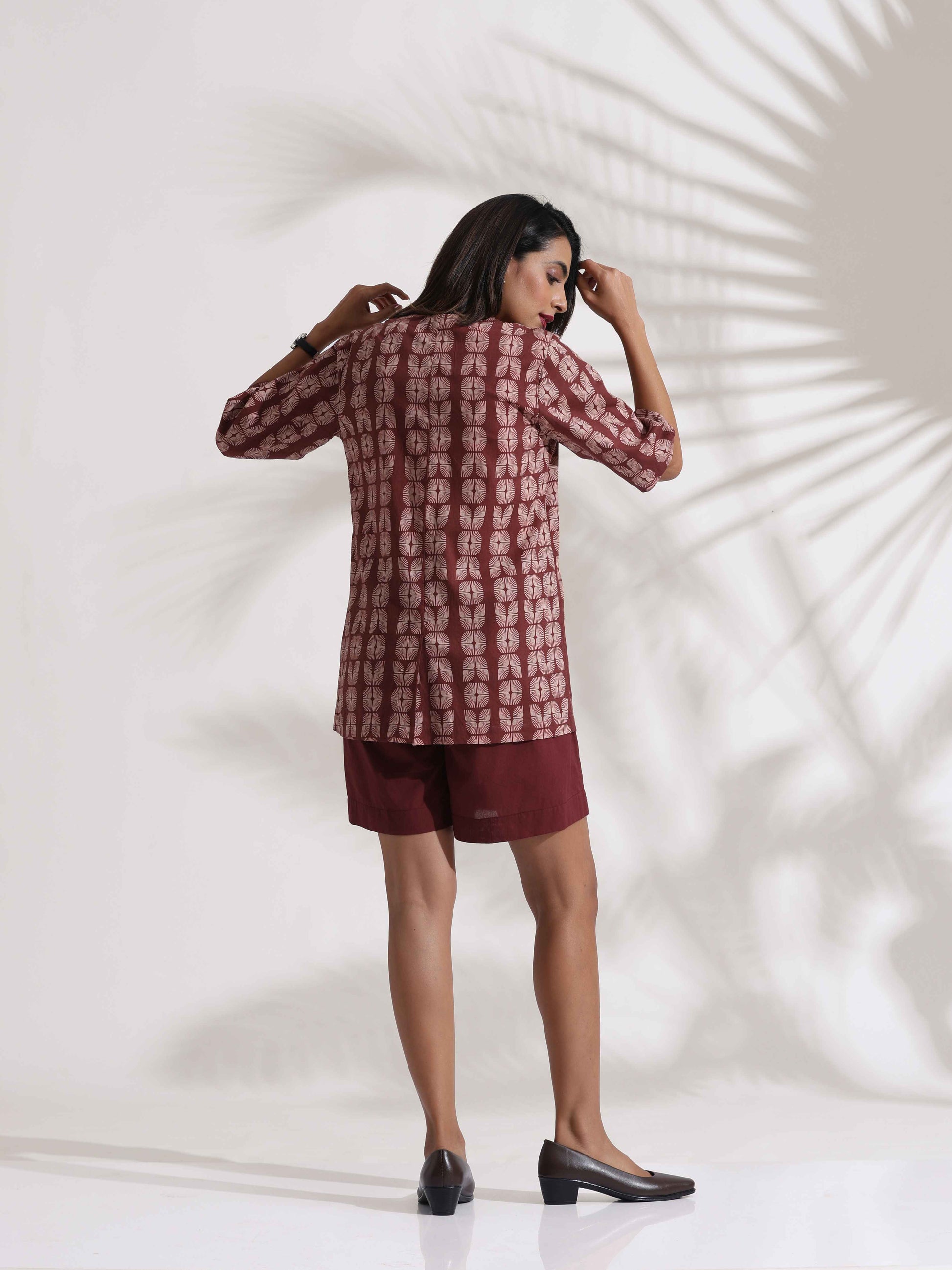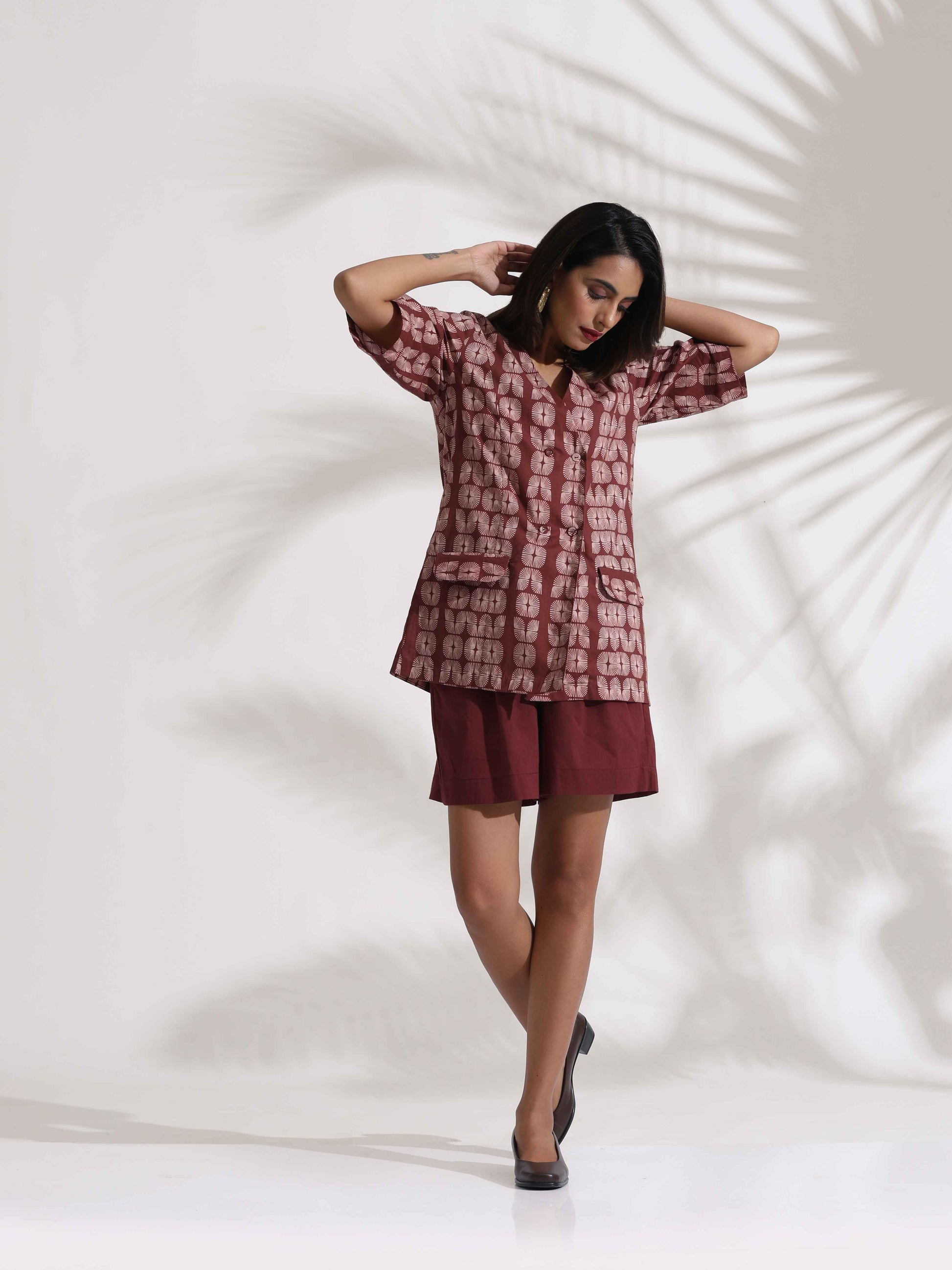- Elevate your style with this brown cotton printed double-breasted jacket top, paired with brown shorts. This chic ensemble offers the perfect blend of elegance and comfort, making it a versatile choice for both casual and semi-formal occasions.