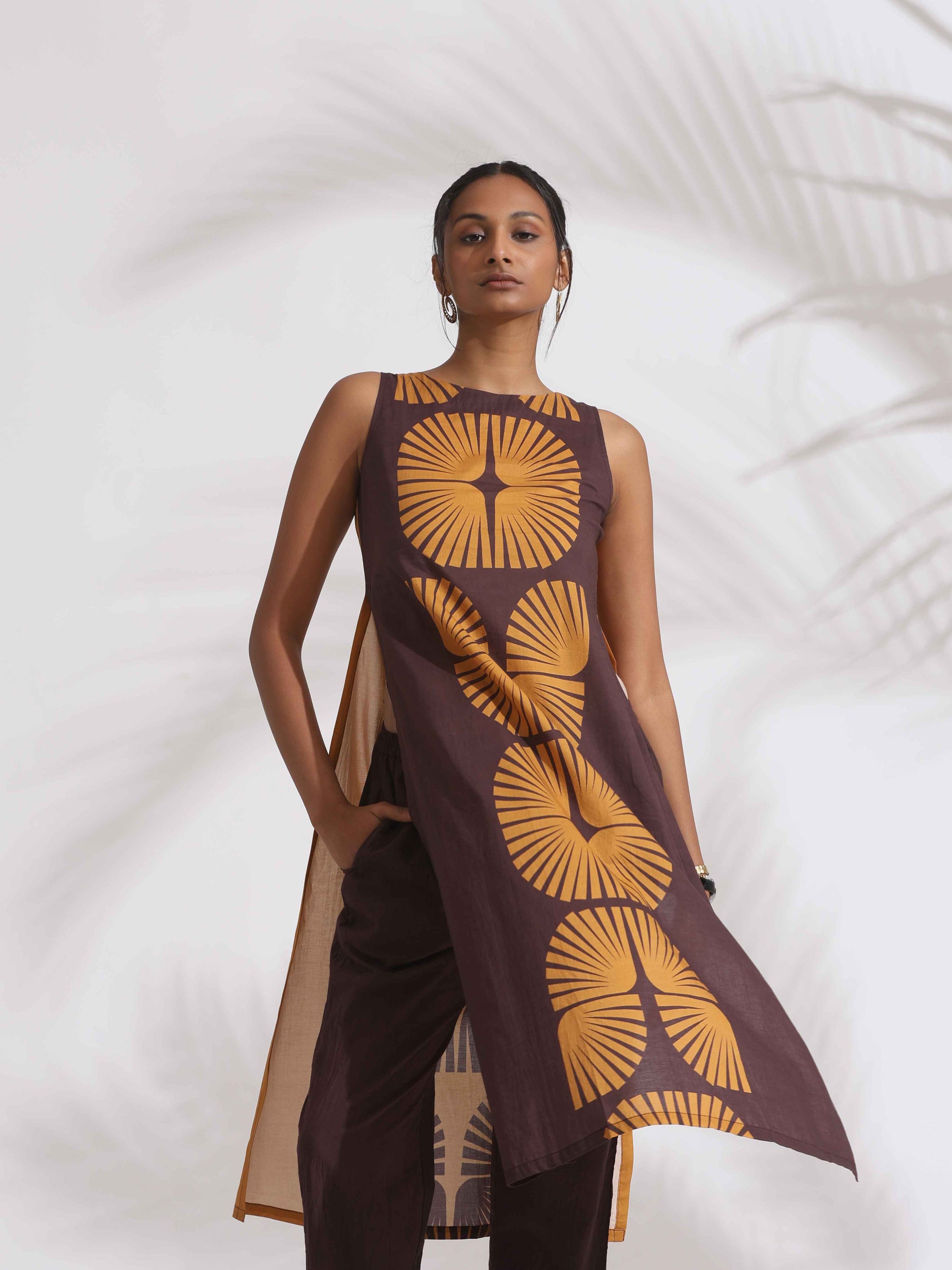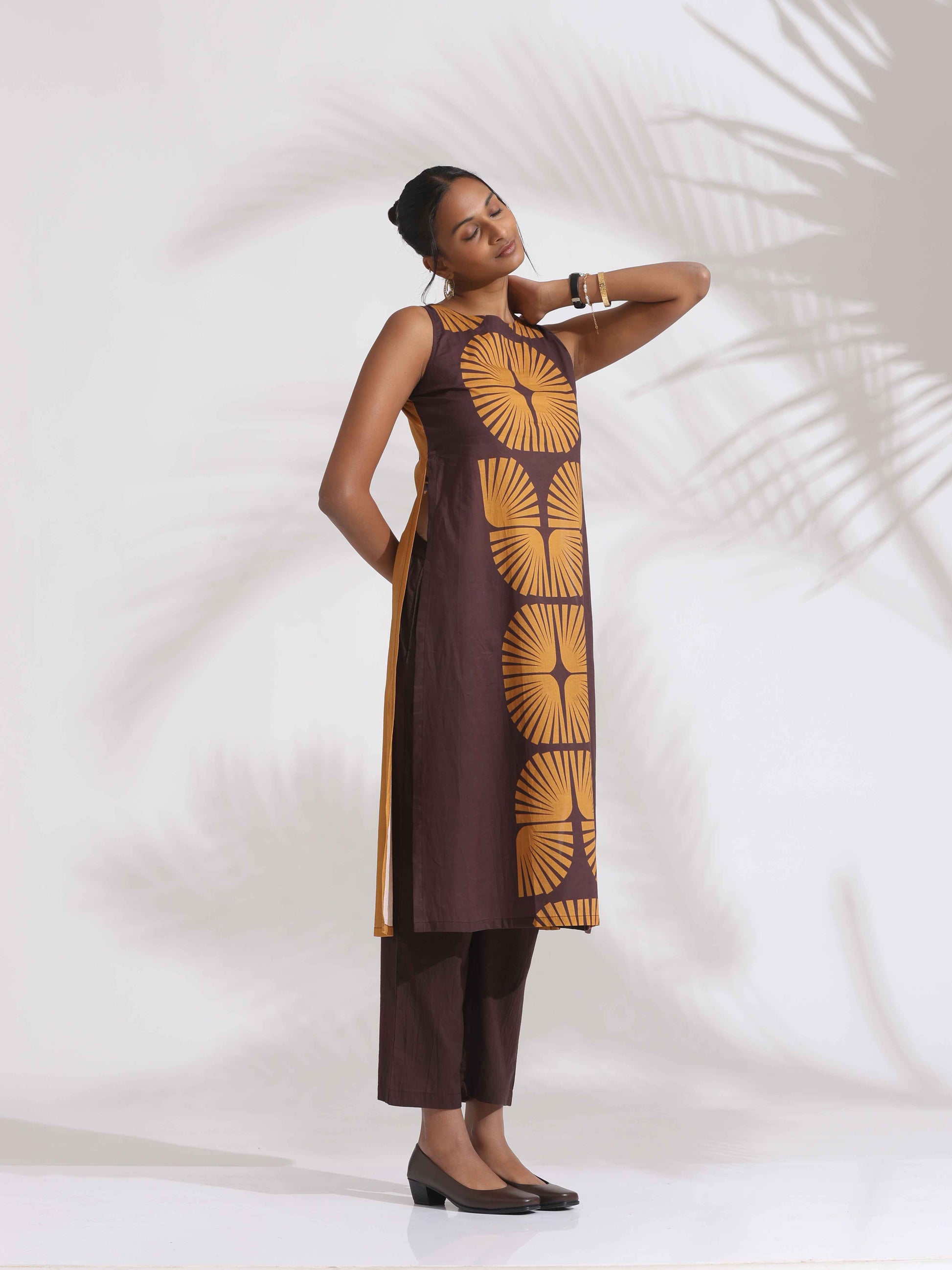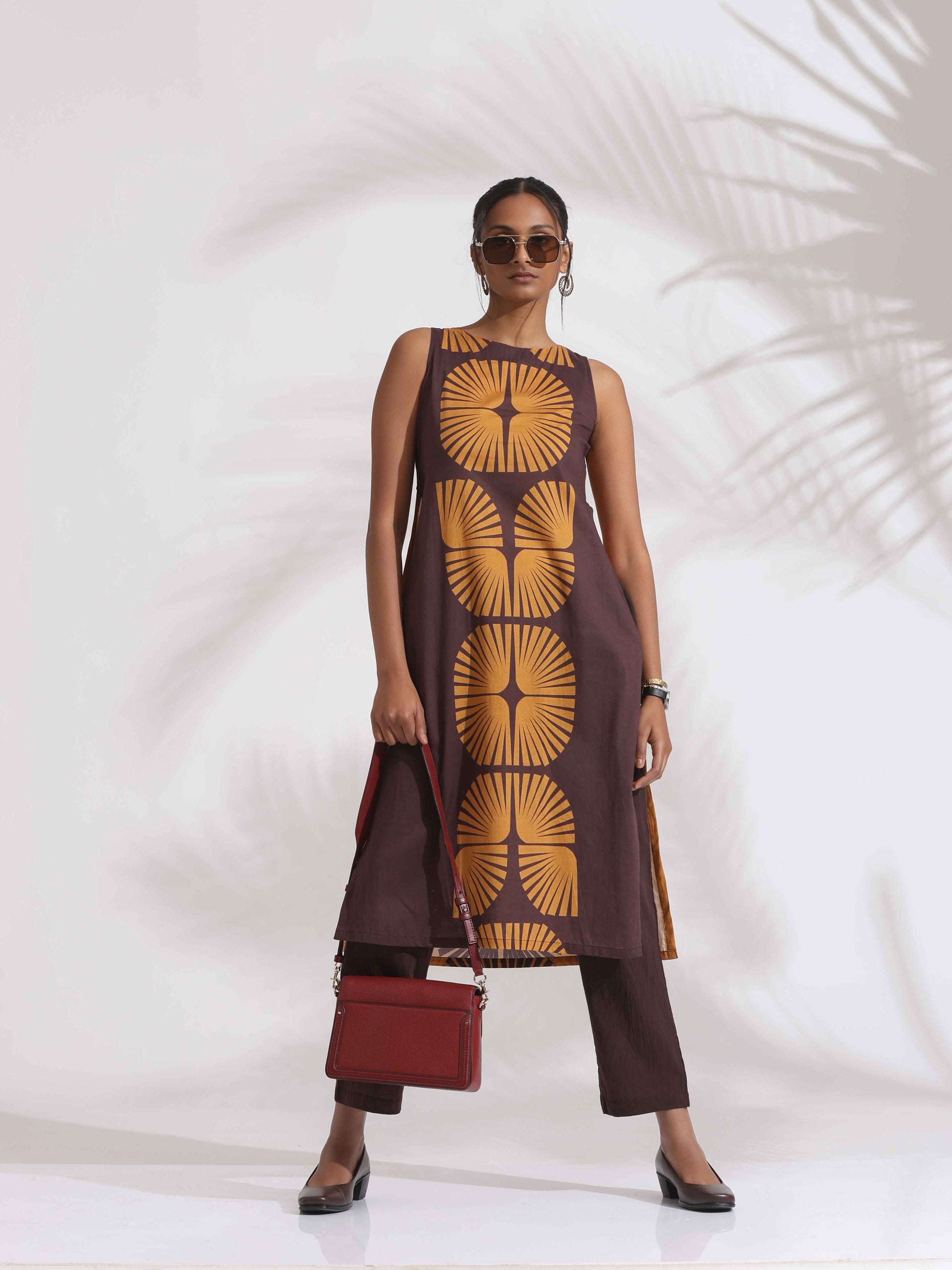 - Step into effortless elegance with this brown cotton geometric print sleeveless kurta, featuring contrasting color patterns on the front and back, paired flawlessly with solid brown cotton pants. A perfect fusion of modern style and timeless comfort, this set is the ideal addition to any wardrobe.