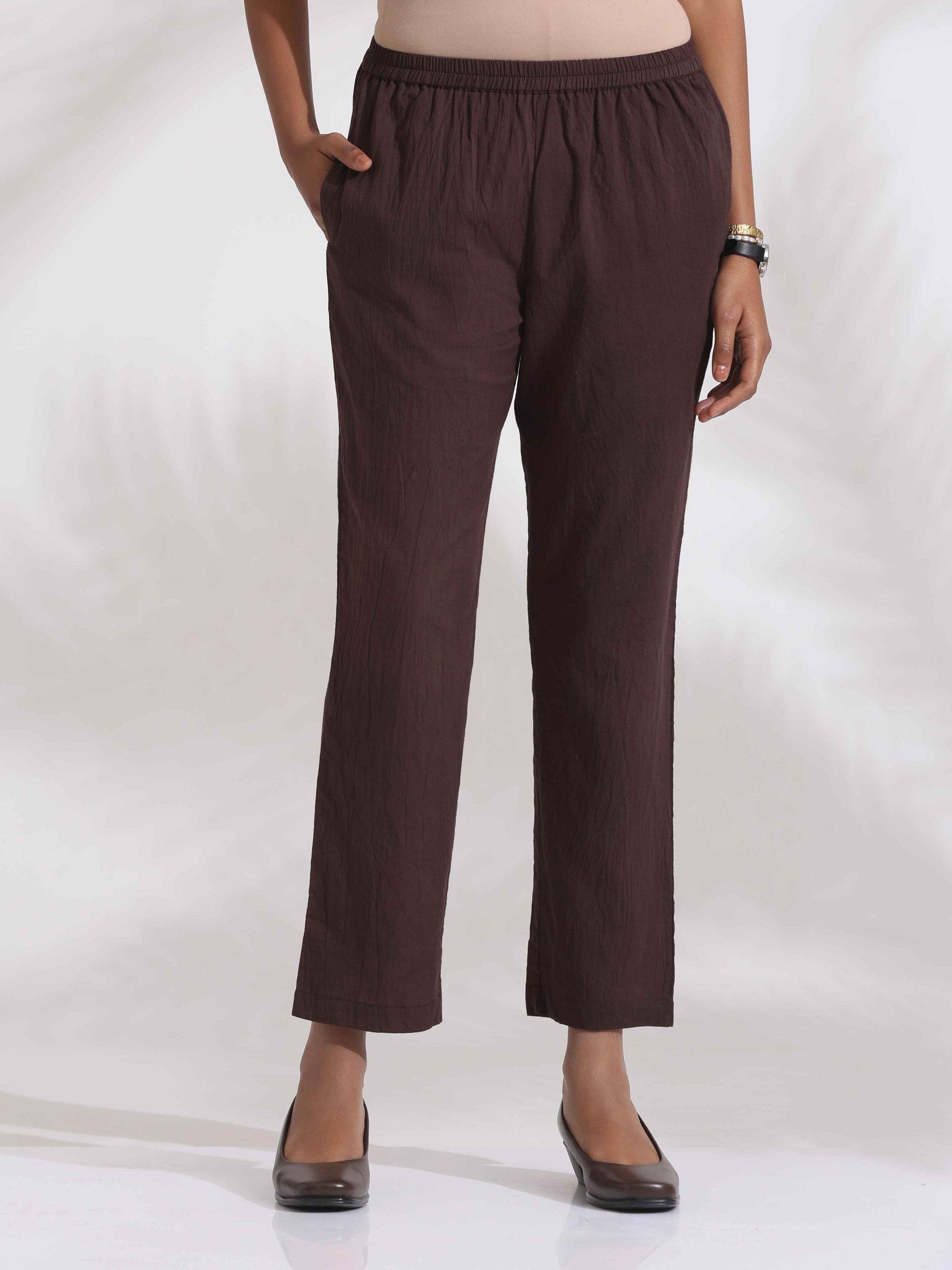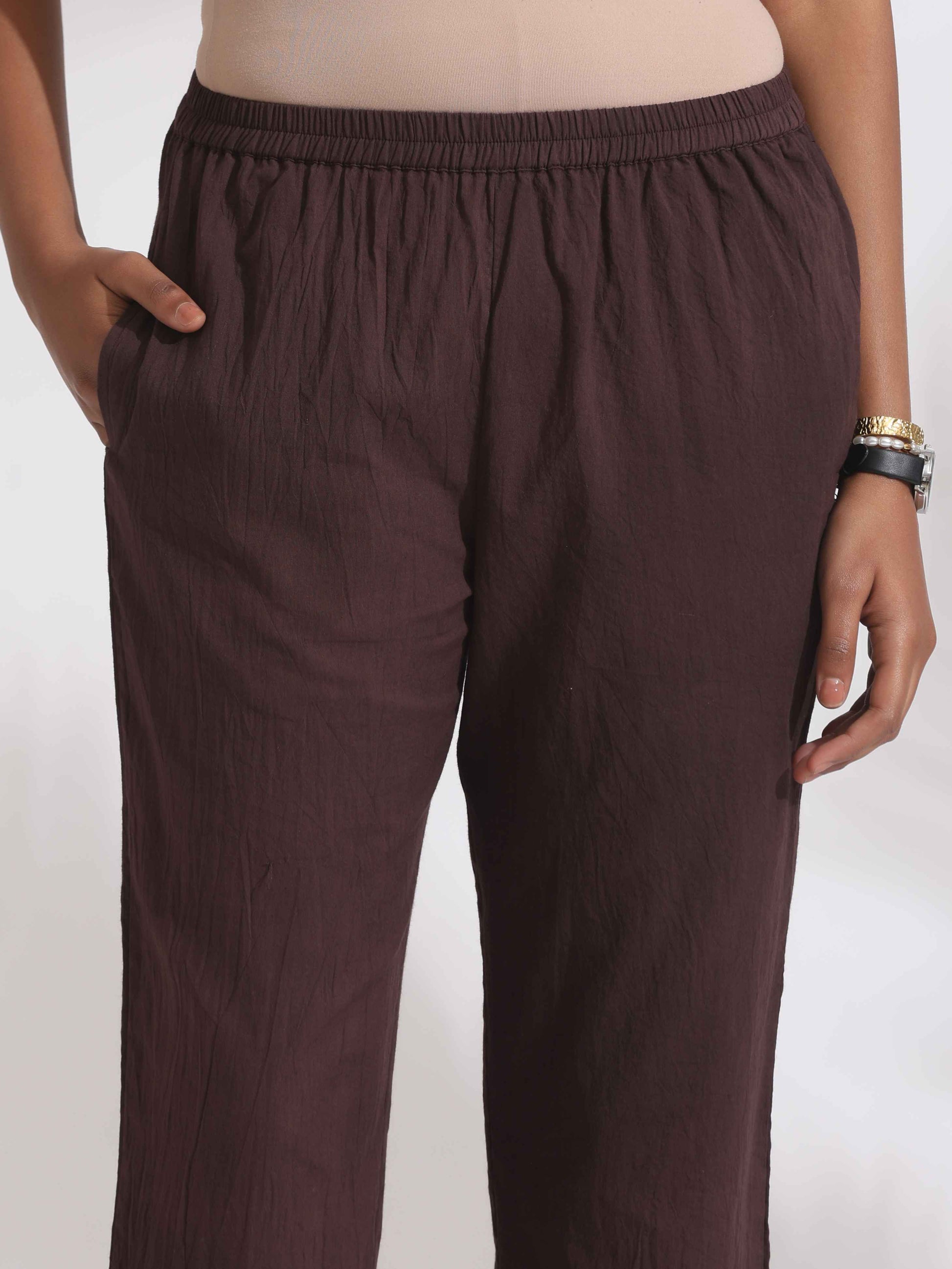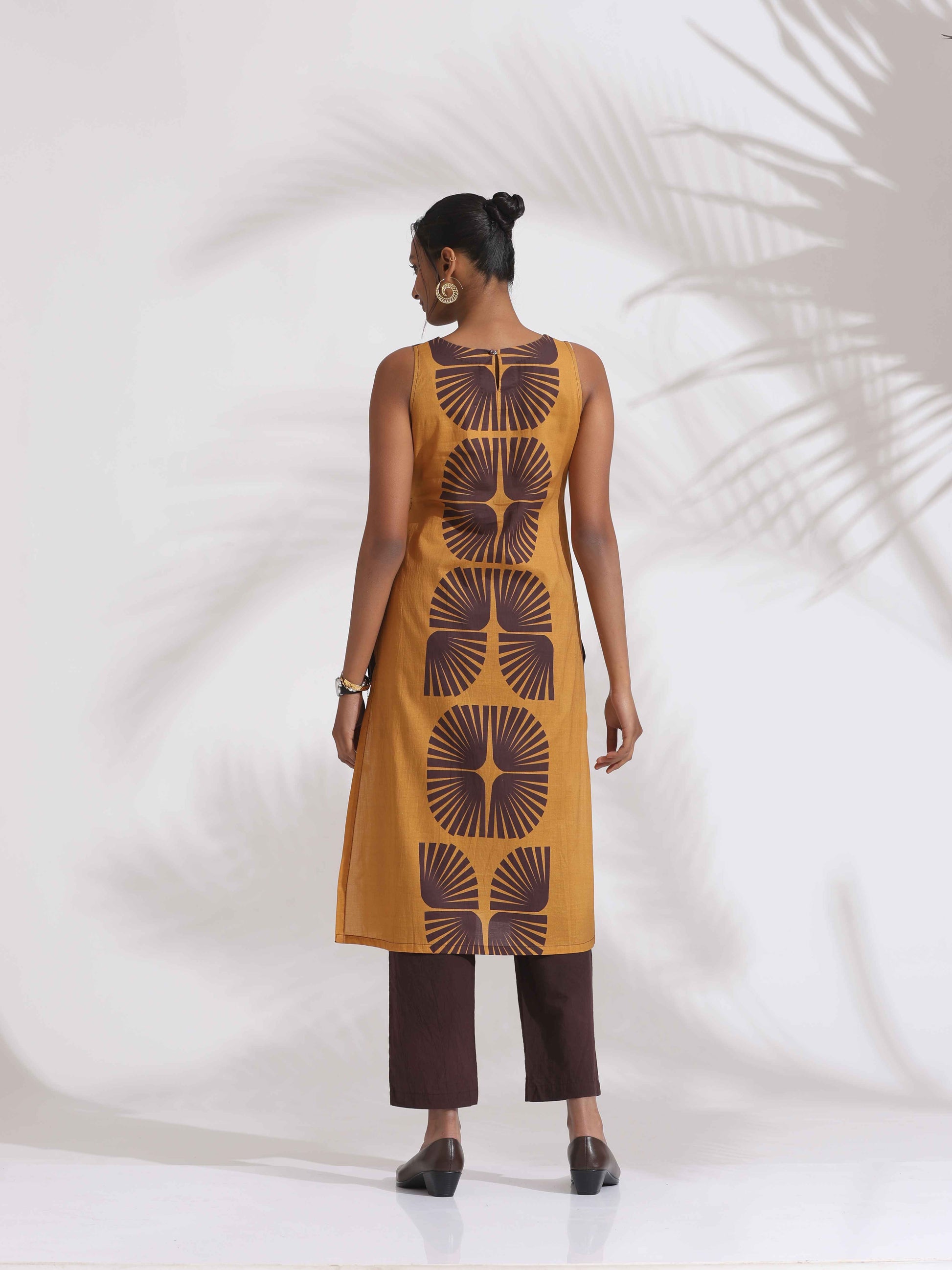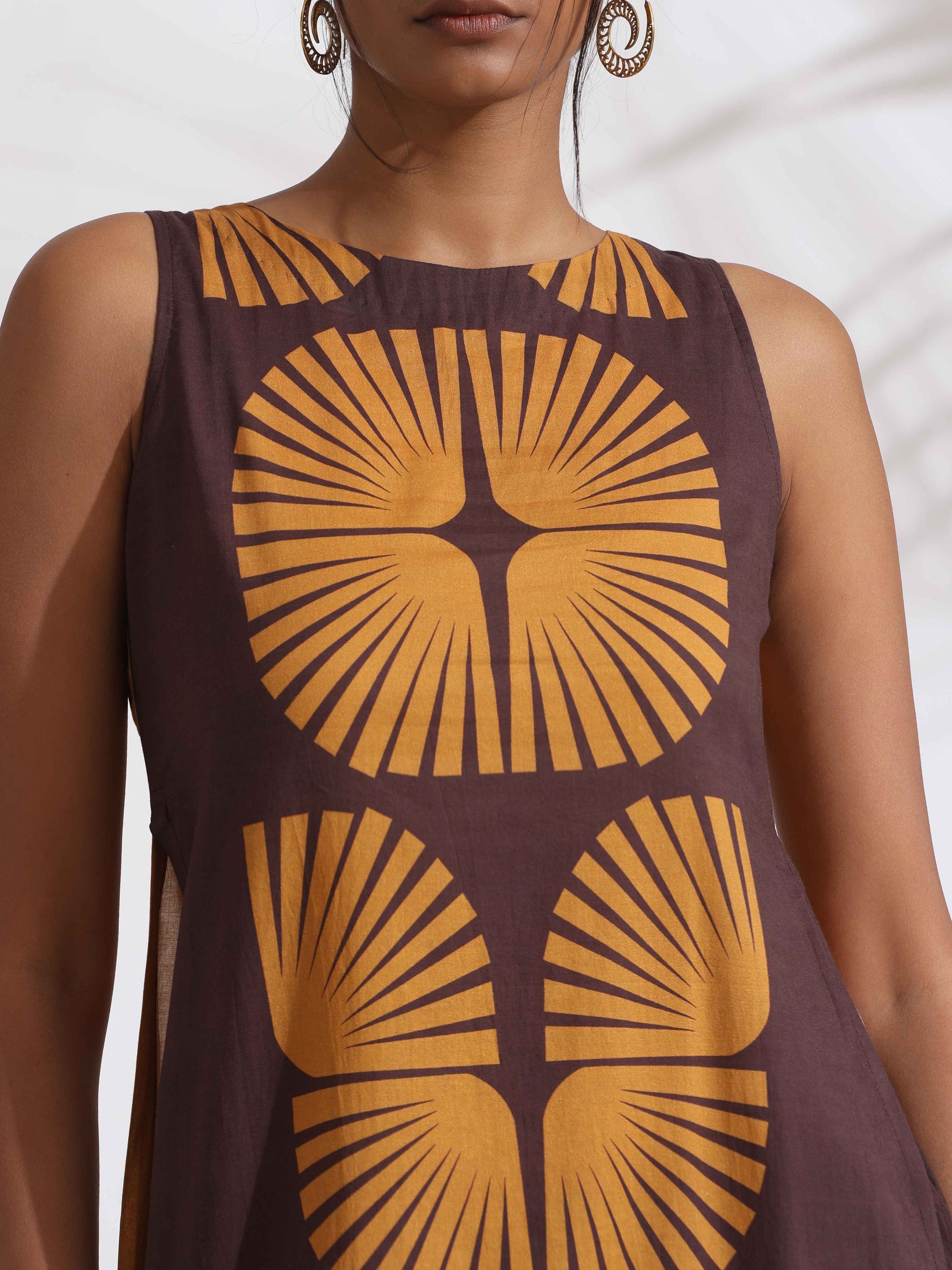 - Step into effortless elegance with this brown cotton geometric print sleeveless kurta, featuring contrasting color patterns on the front and back, paired flawlessly with solid brown cotton pants. A perfect fusion of modern style and timeless comfort, this set is the ideal addition to any wardrobe.