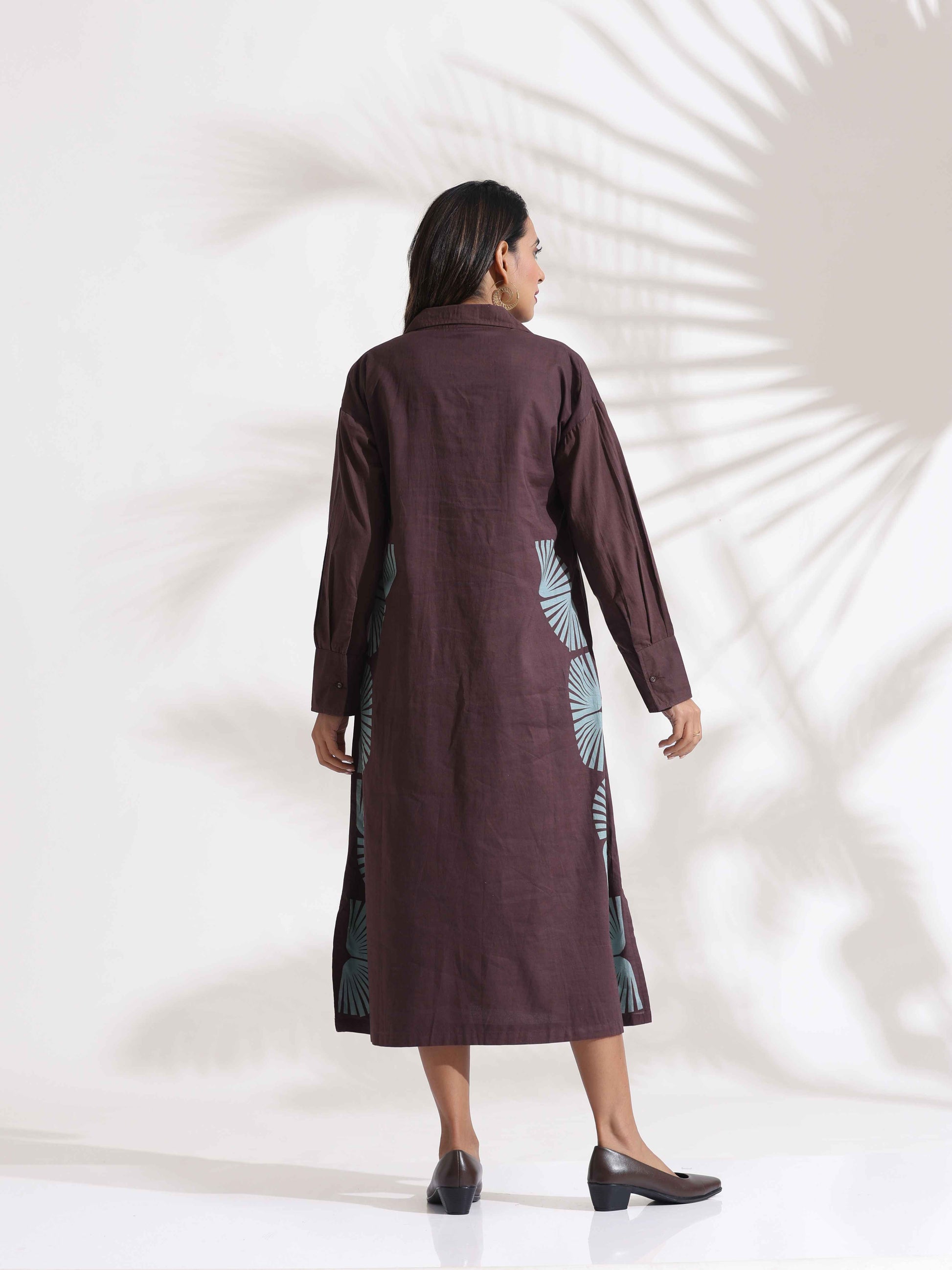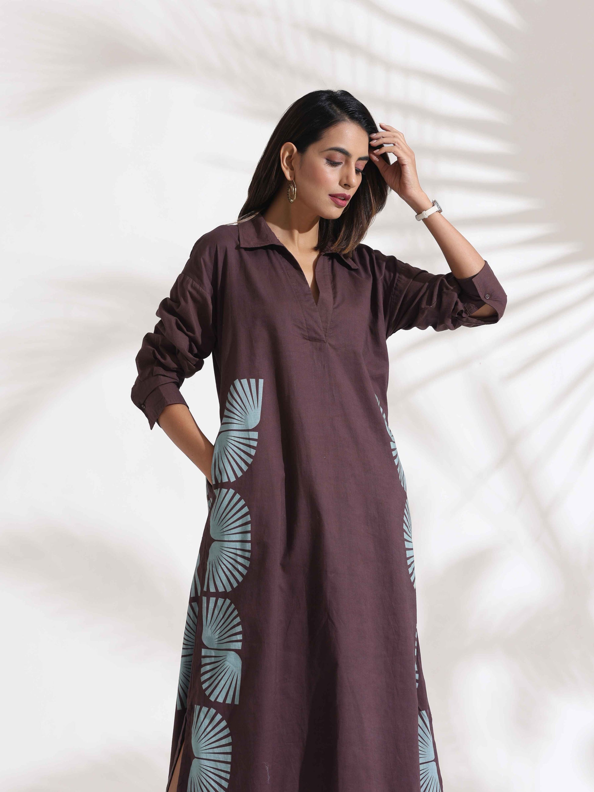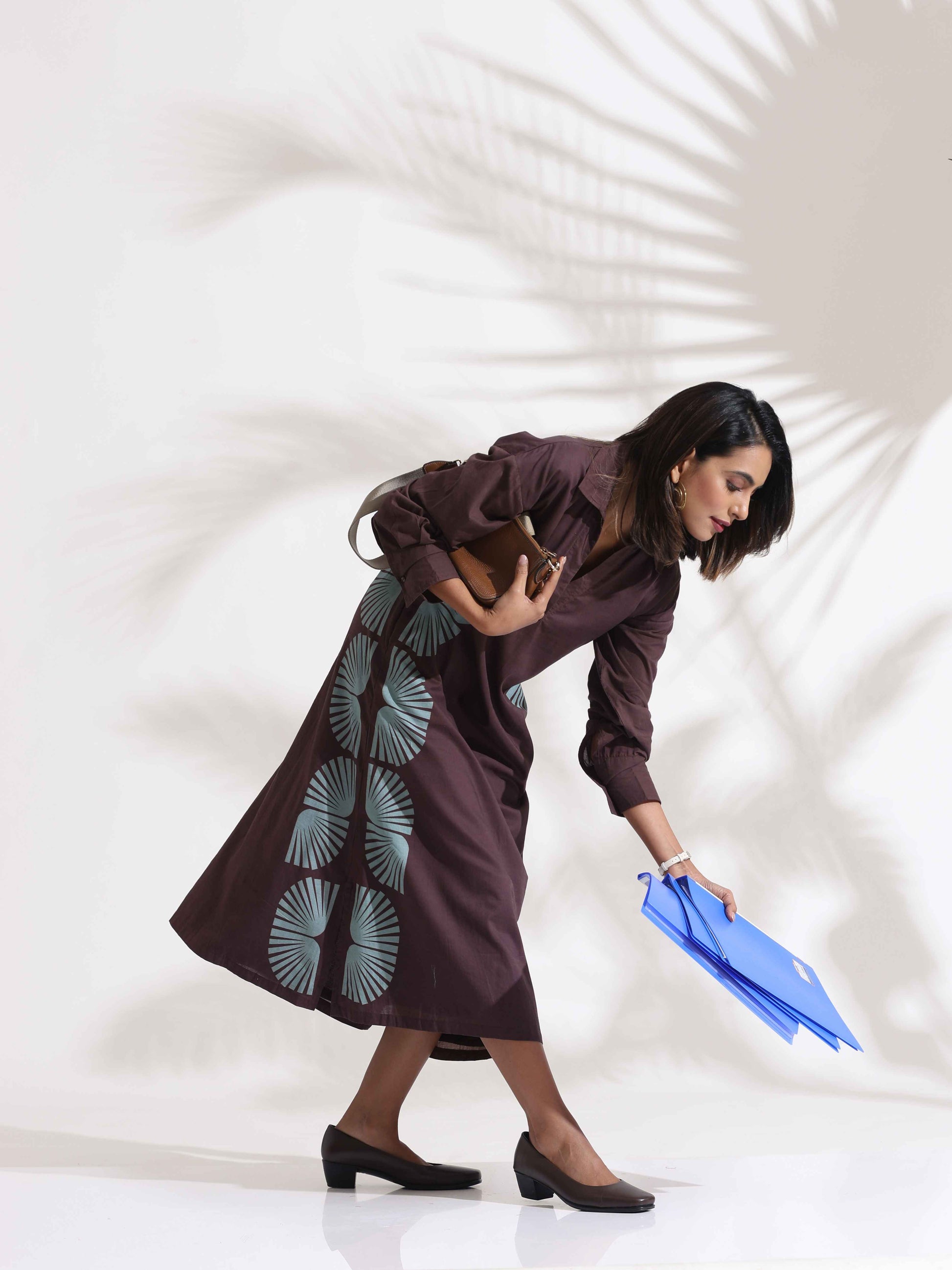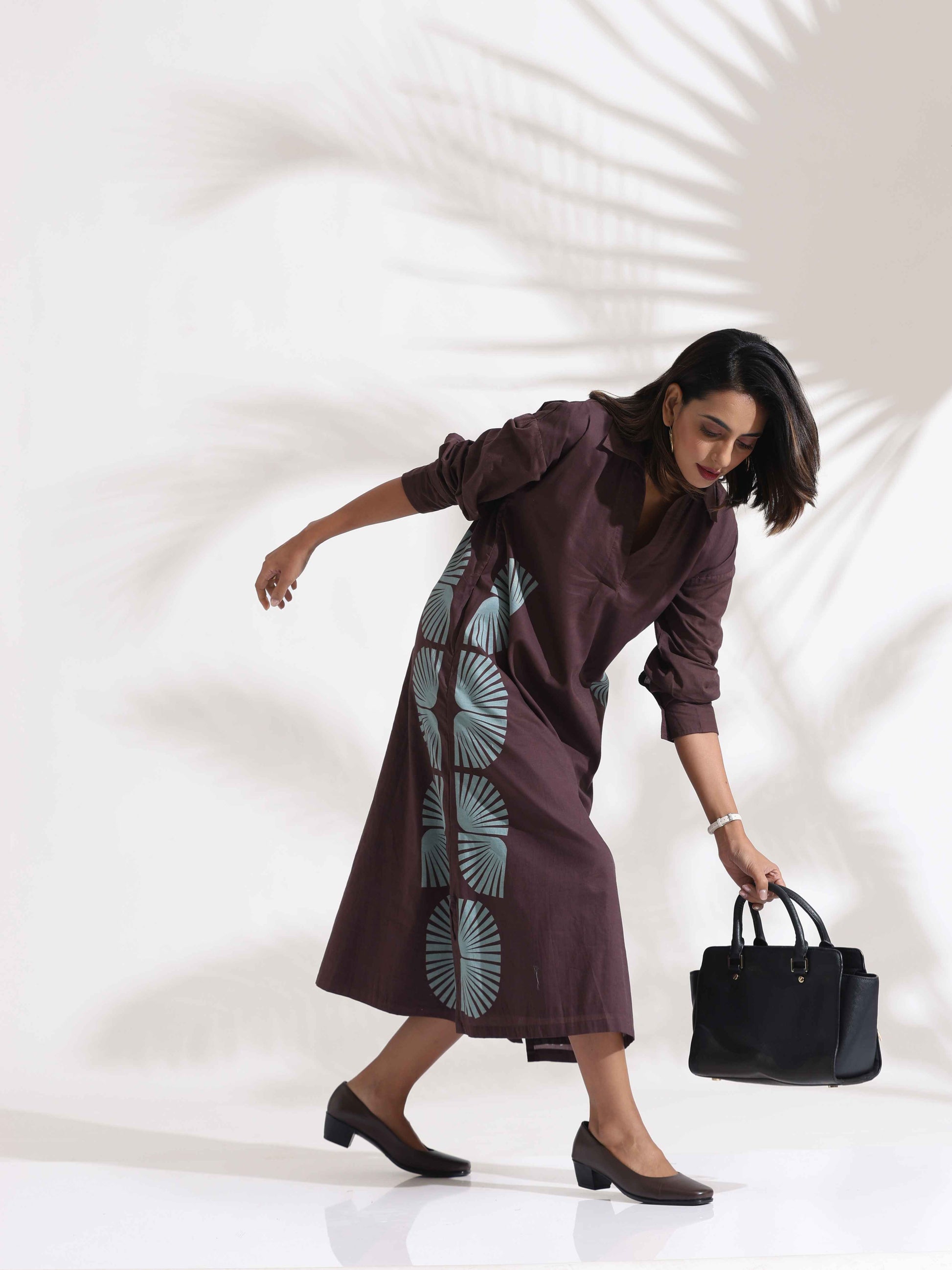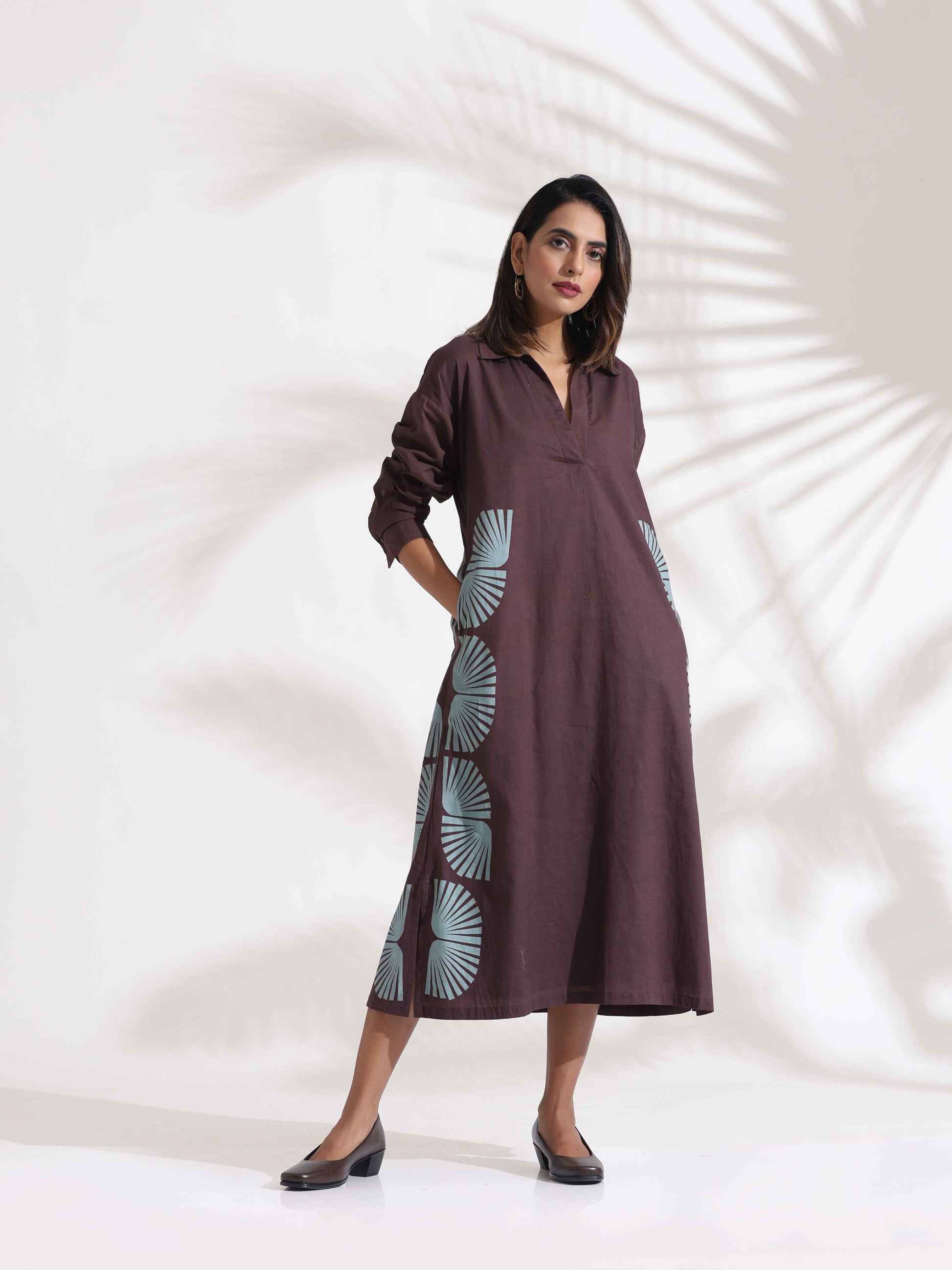 - Elevate your style with this brown printed cotton A- line drop shoulder dress it's an ideal blend of elegance and comfort.