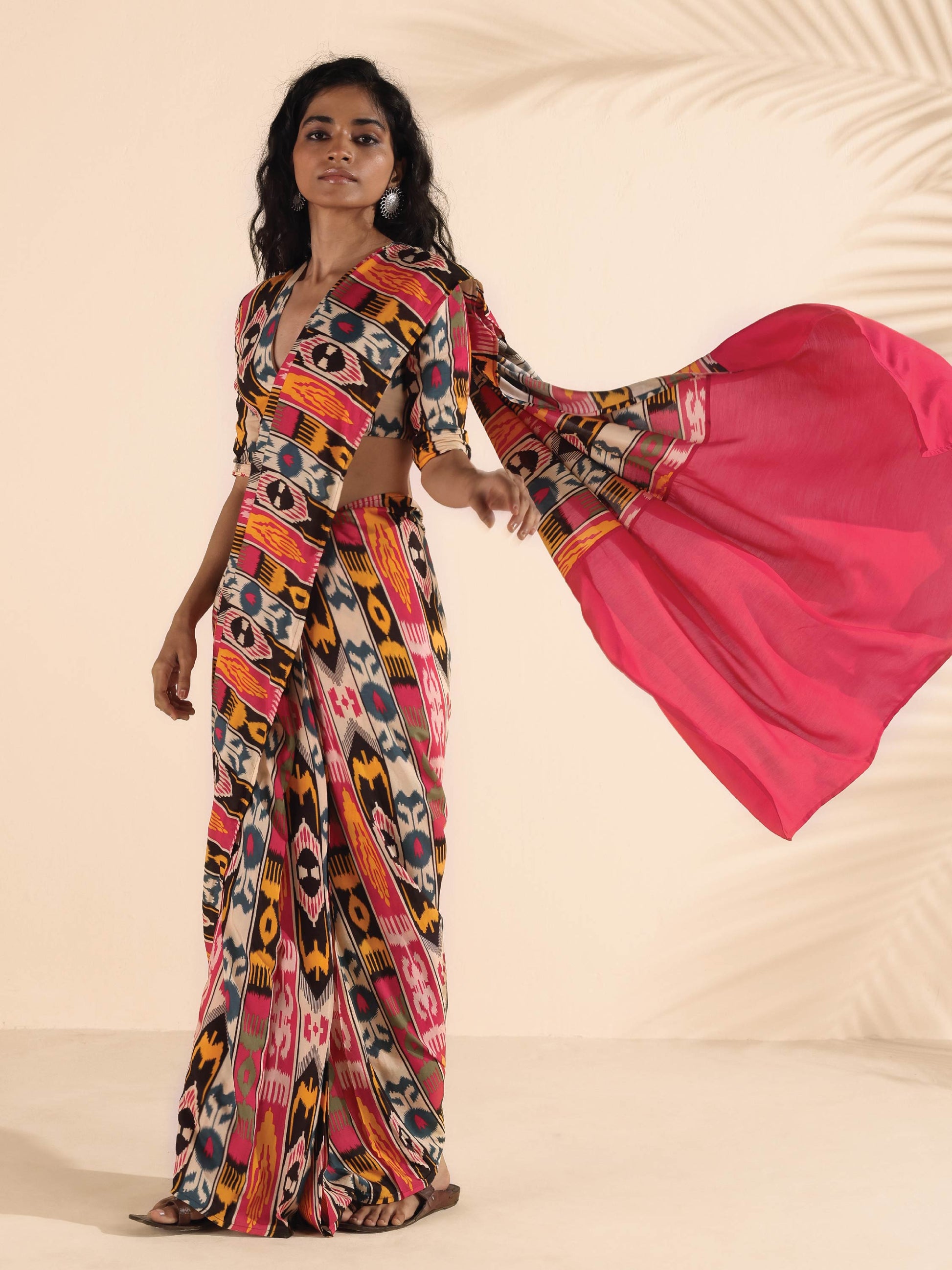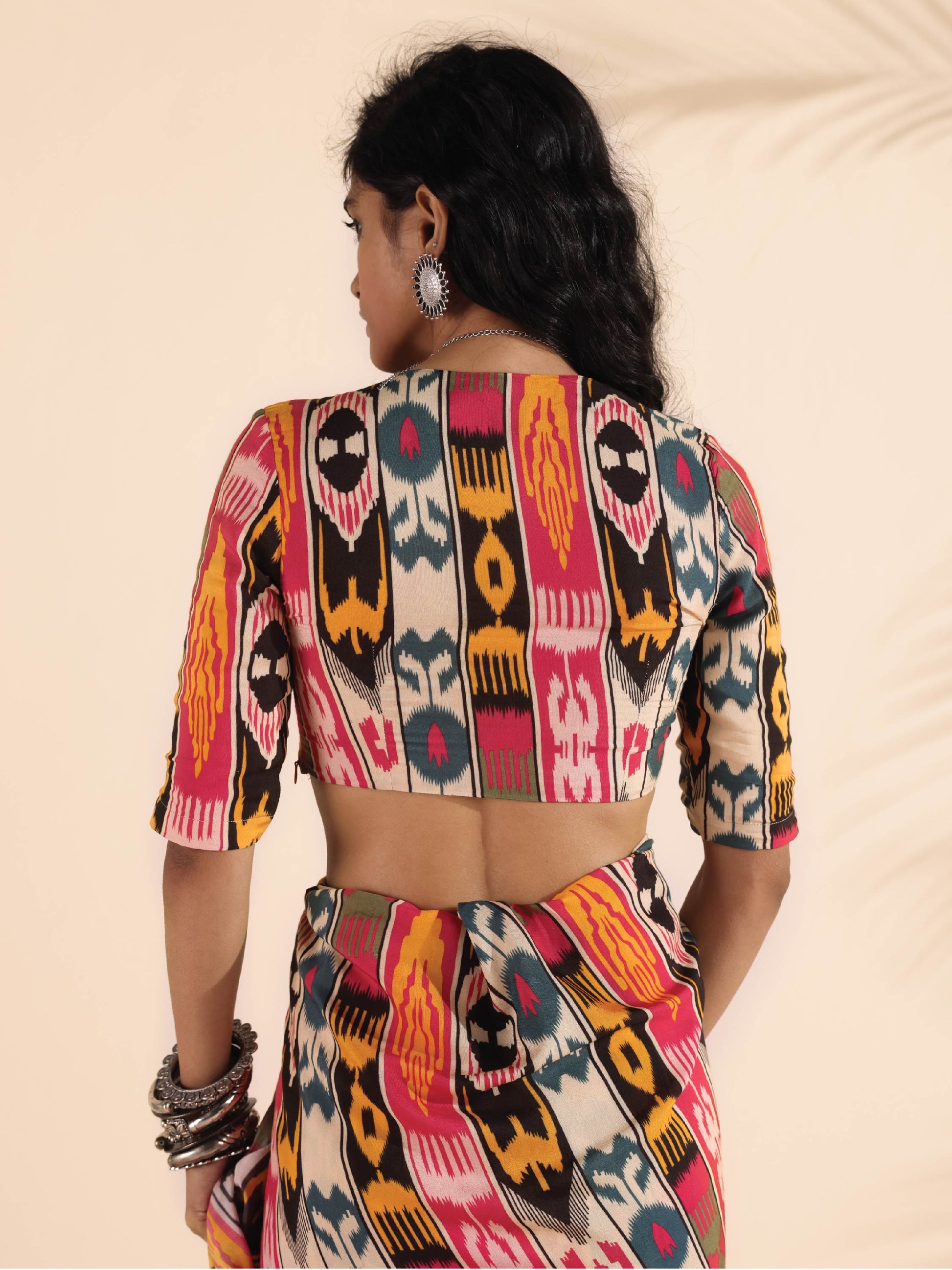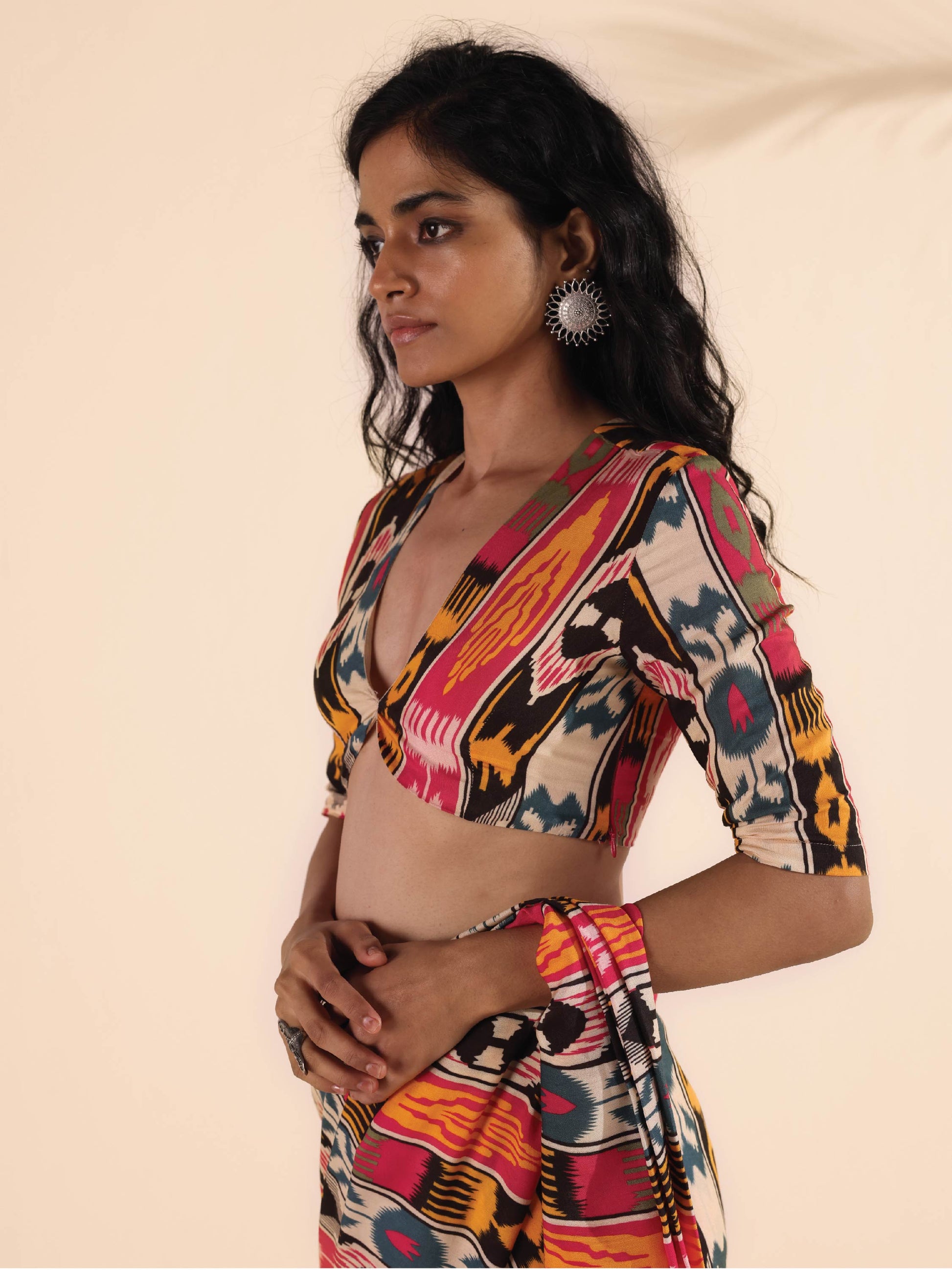 - Muslin Ikat Printed Top Choli with V neckline and waist band in flared fit.