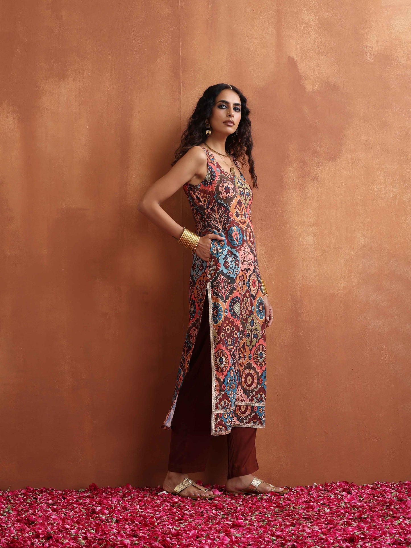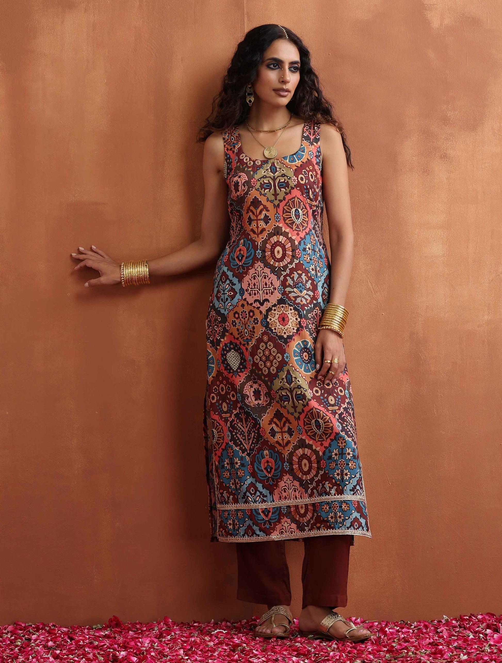 - Elevate your style with this cola geometric floral print straight kurta paired with cola pant.