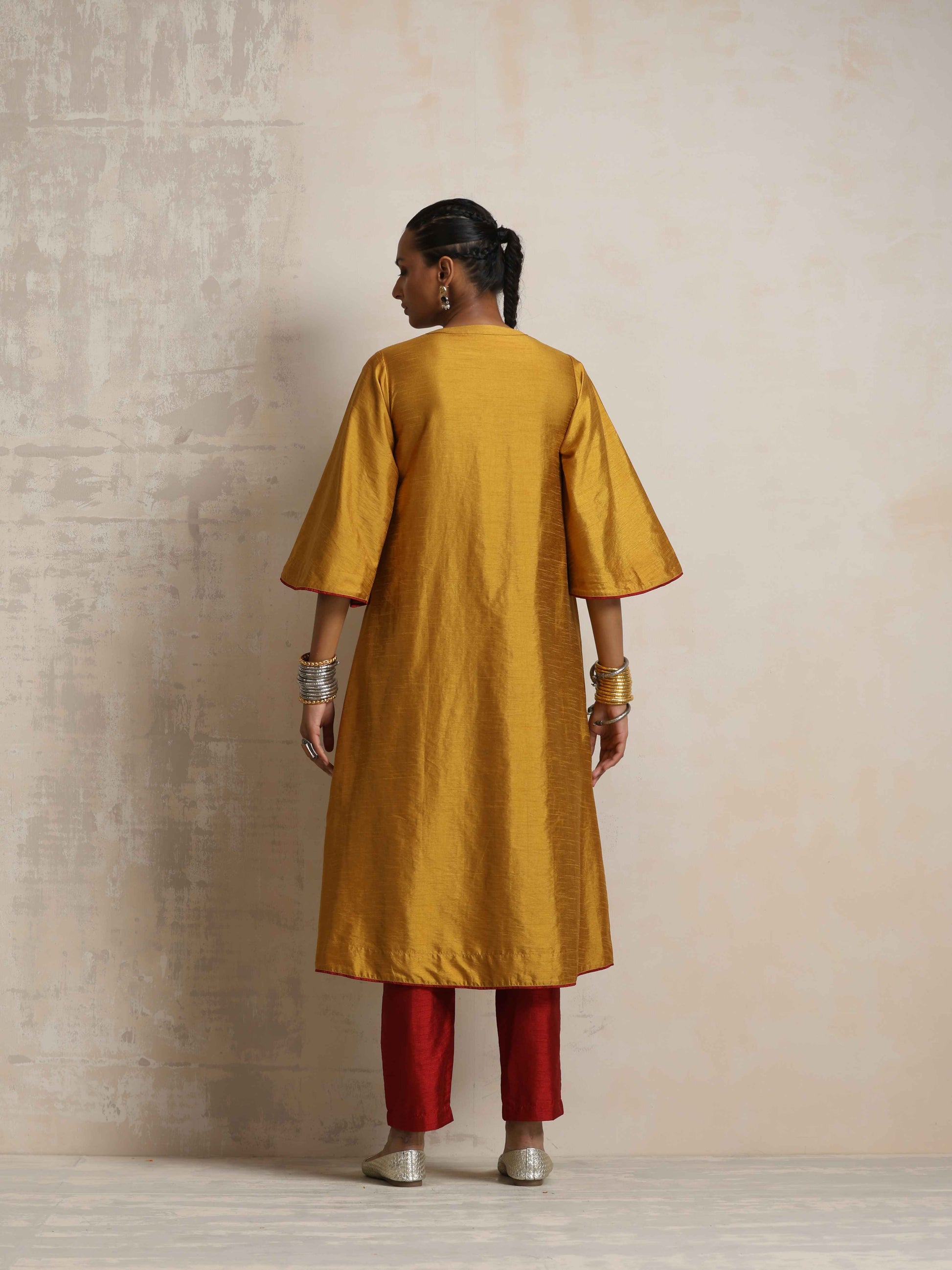 - Elevate your style with this gold silk blend kurta paired perfectly with red silk blend elasticated waist pants.