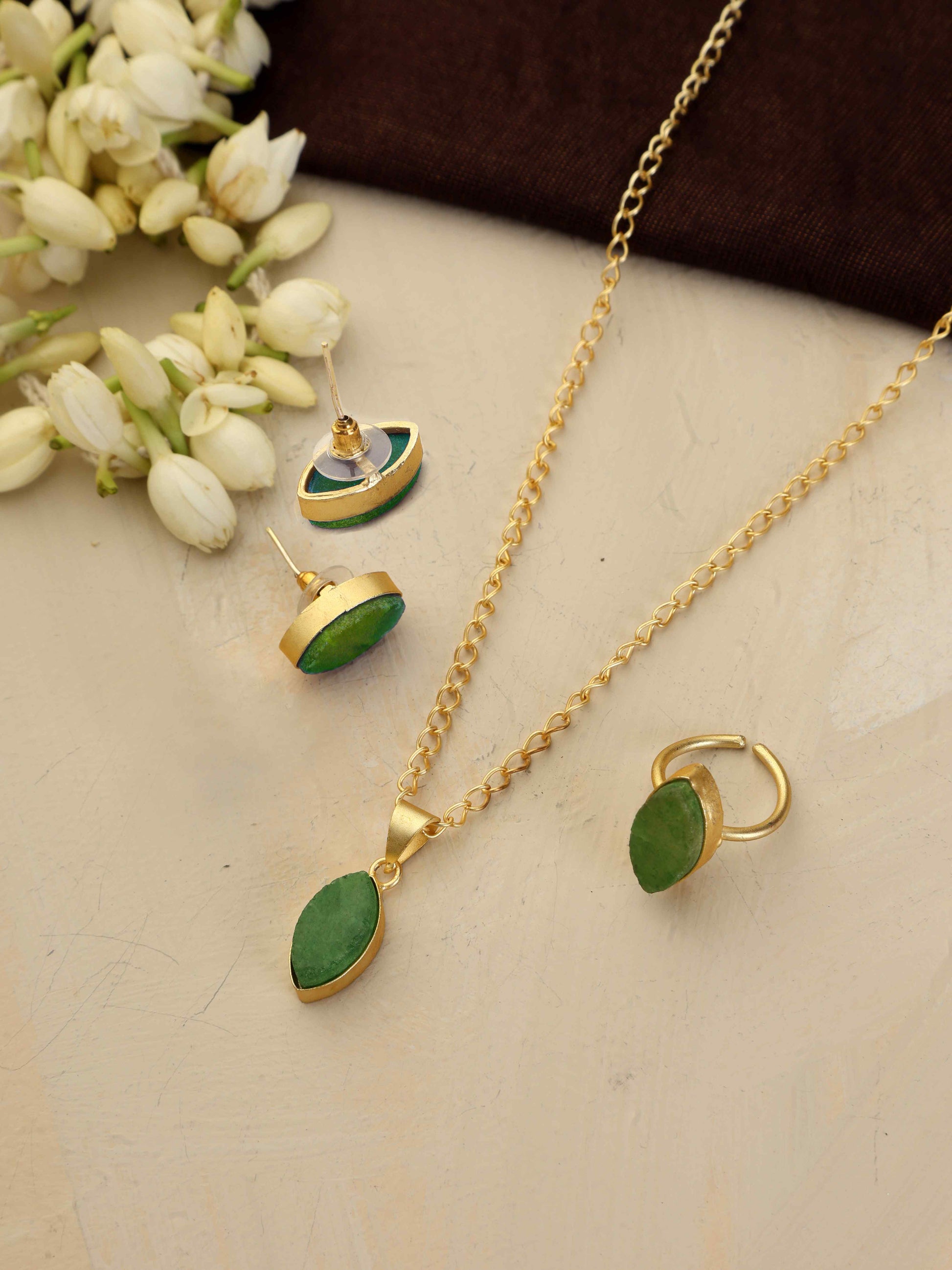 - Gold green natural stone pendant set with adjustable slip-on closure, paired with stone earring and ring.