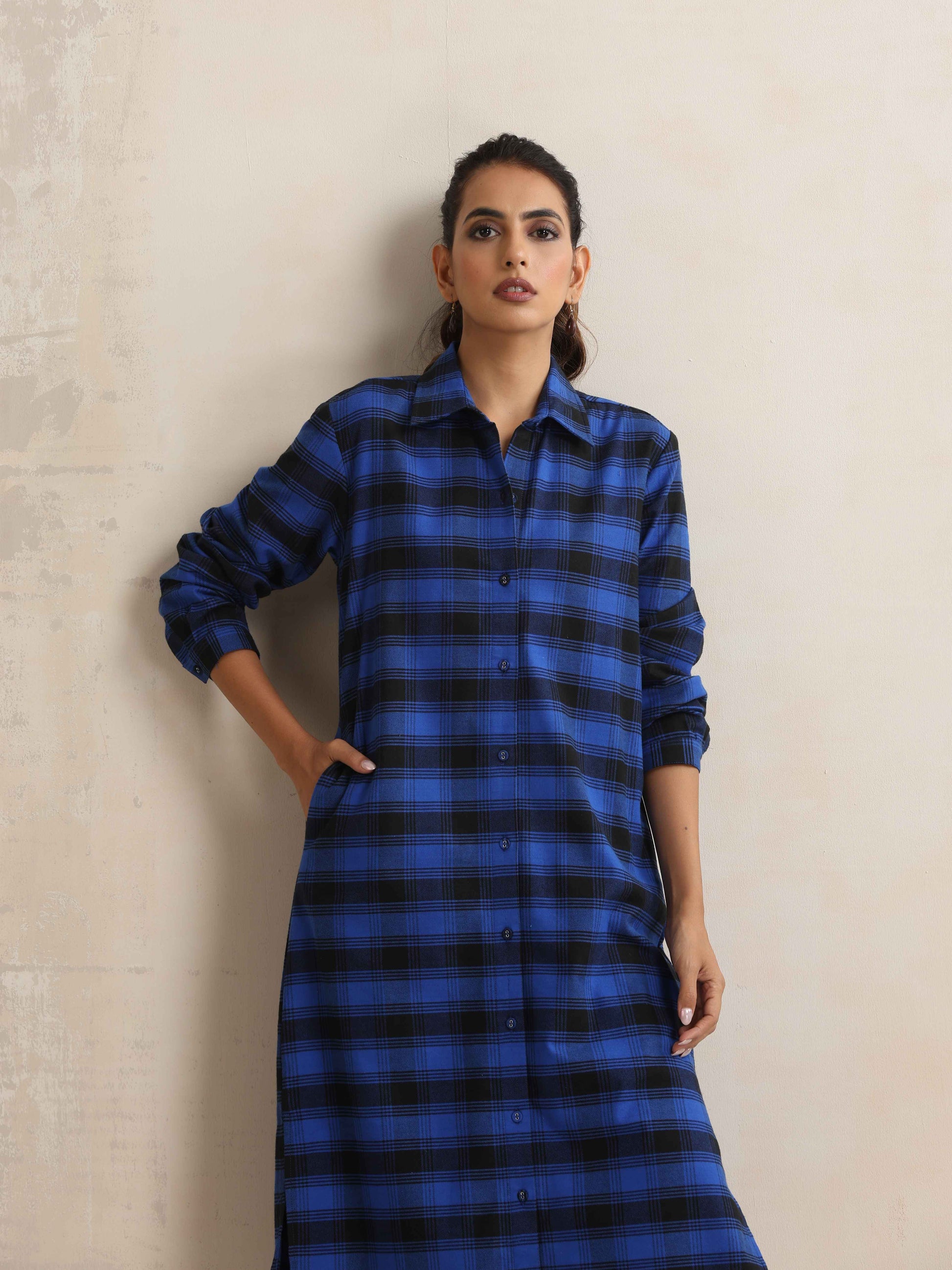 - Elevate your style with this blue check winter shirt dress, it's an ideal blend of elegance and comfort.