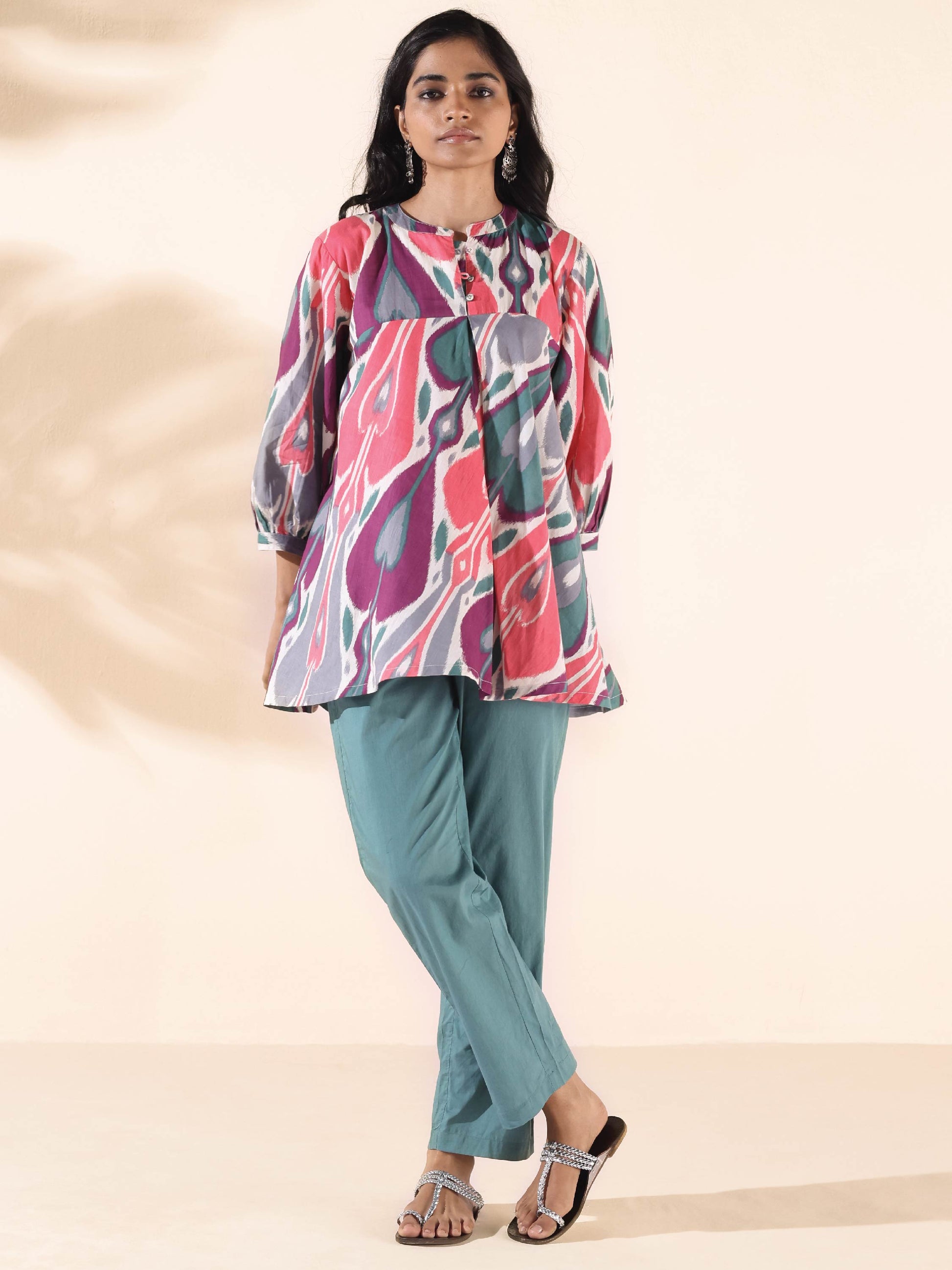 - Cotton Ikat Paan Printed Co-ord Set with yoke, front pleat detail, gathered sleeve and chinese collar. Paired with solid half elasticated waist pant. S