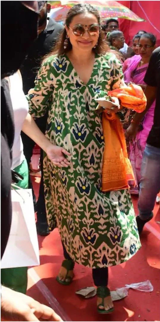 - Cotton Ikat Floral Printed Kurta with gathered yoke, has flared sleeves and pockets. Paired with Cotton Ikat Printed elasticated waist pant.