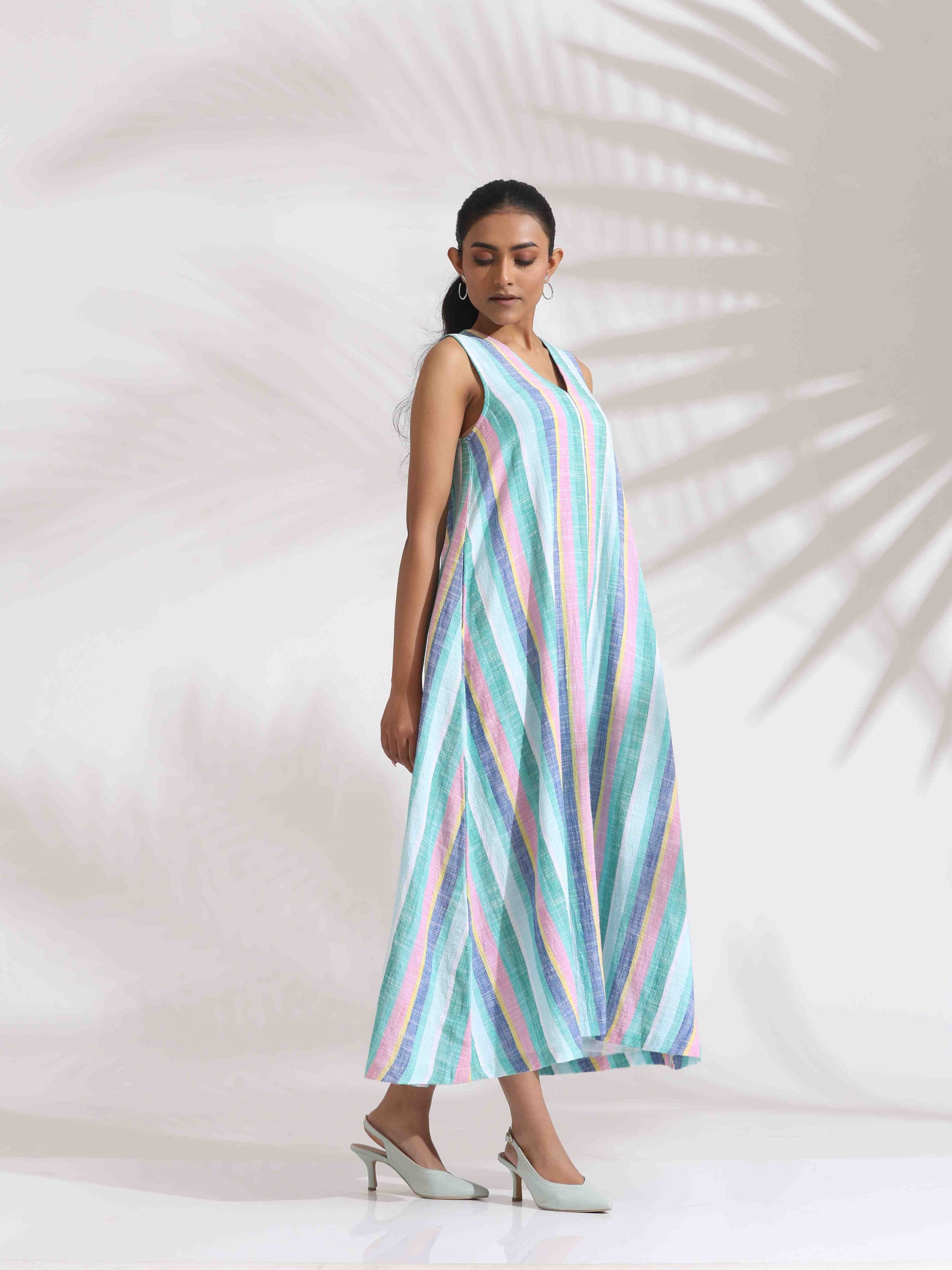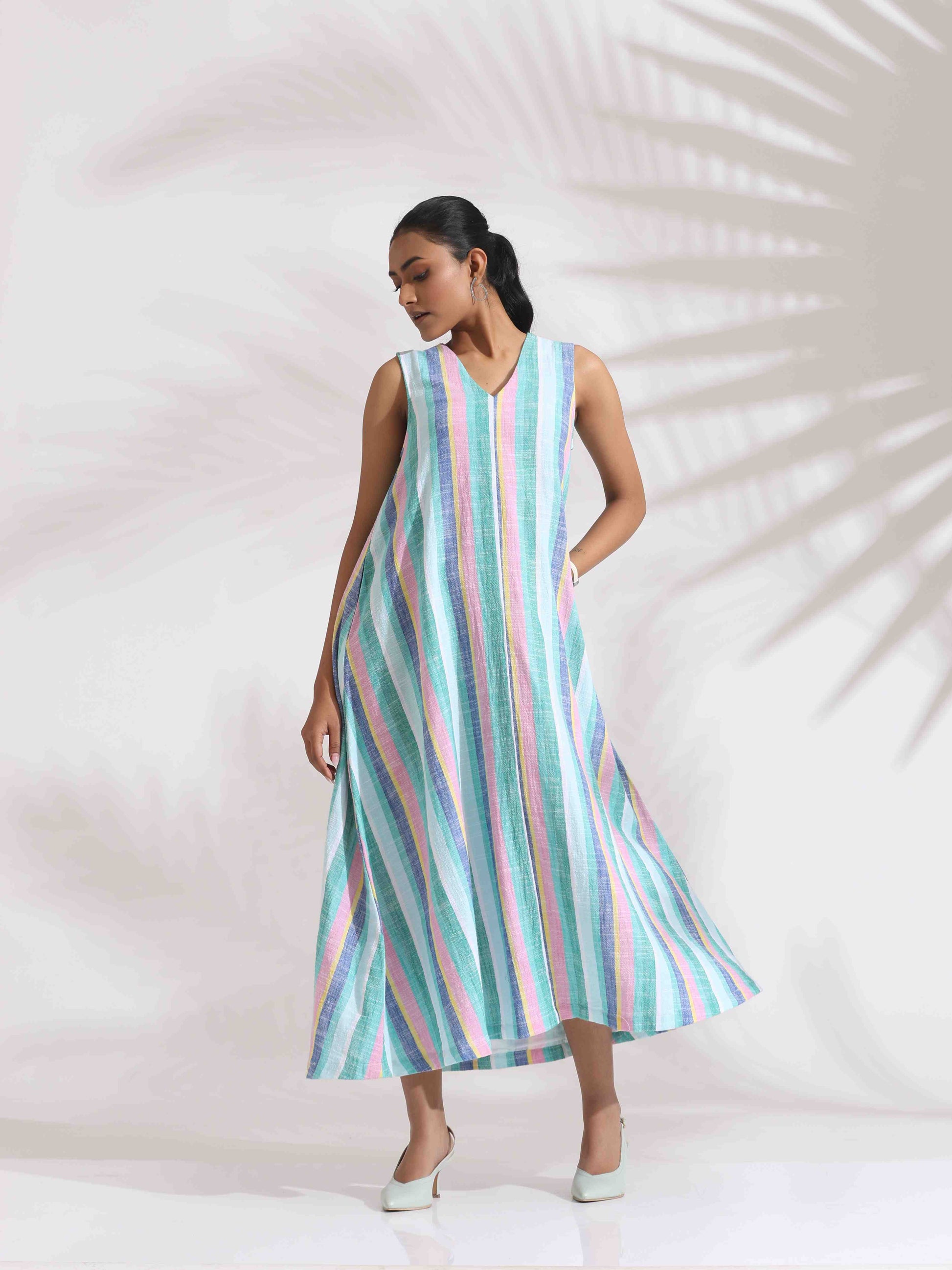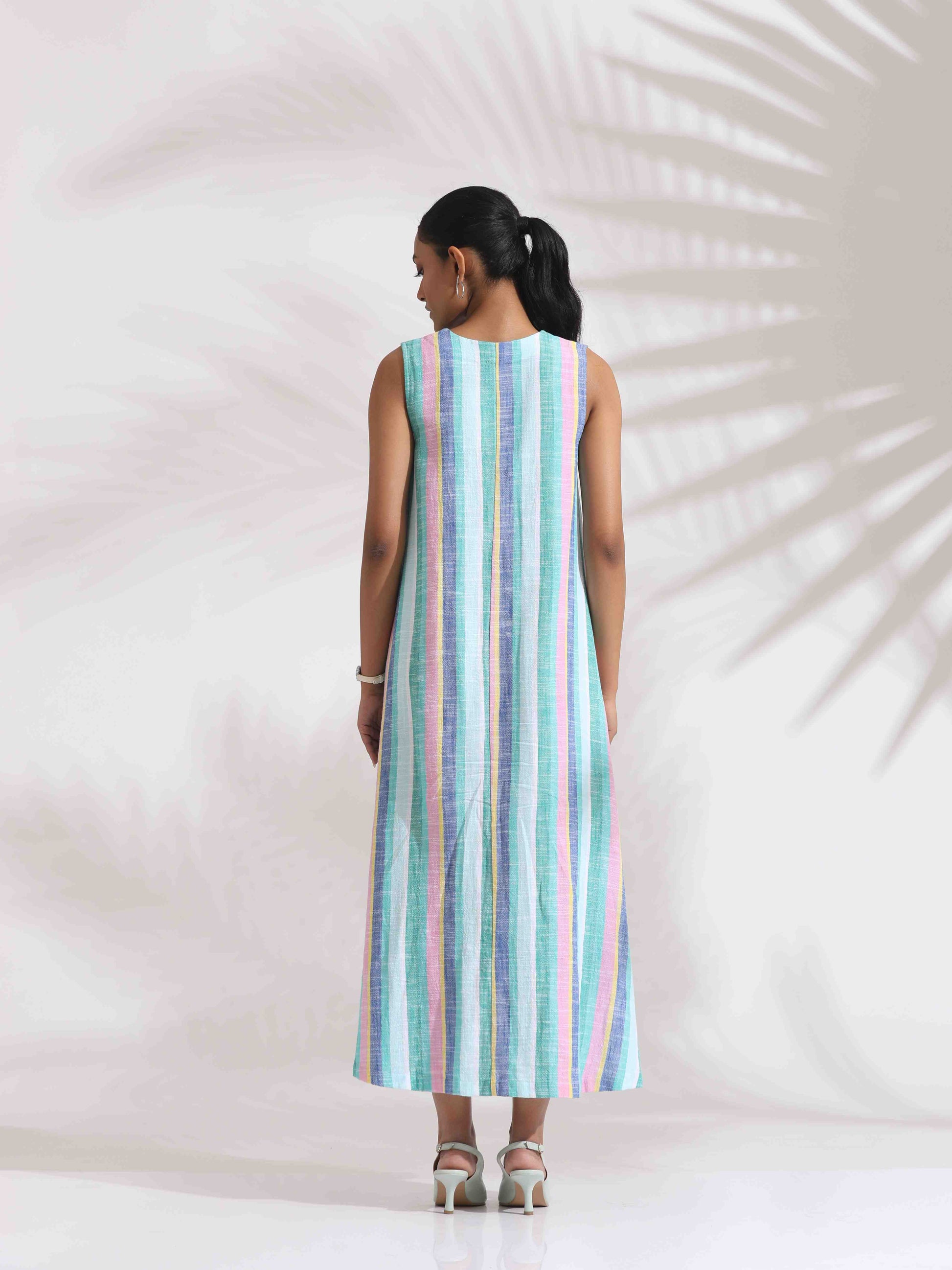 - Elevate your style with this green cotton multi stripe flared dress , it's an ideal blend of elegance and comfort.