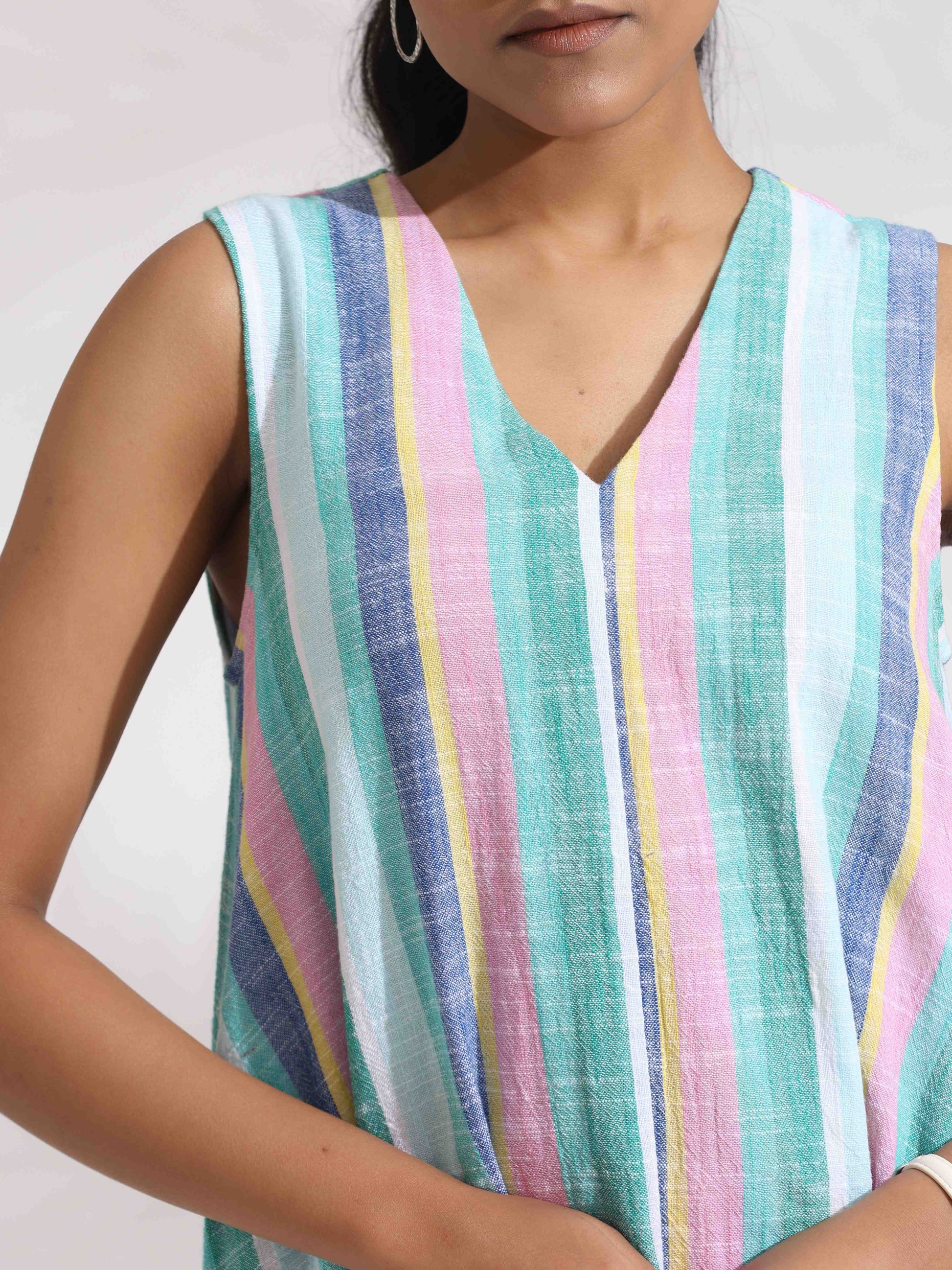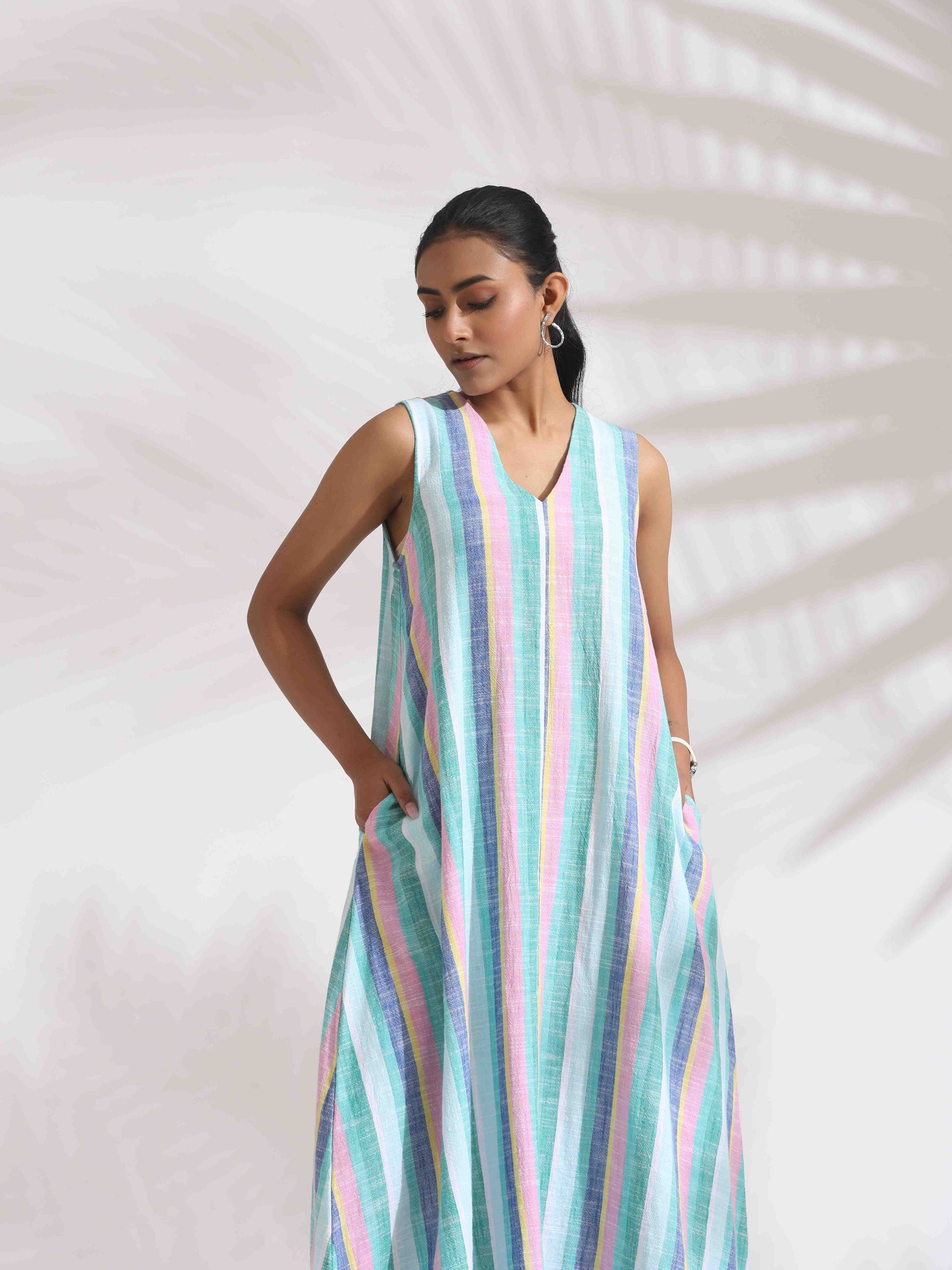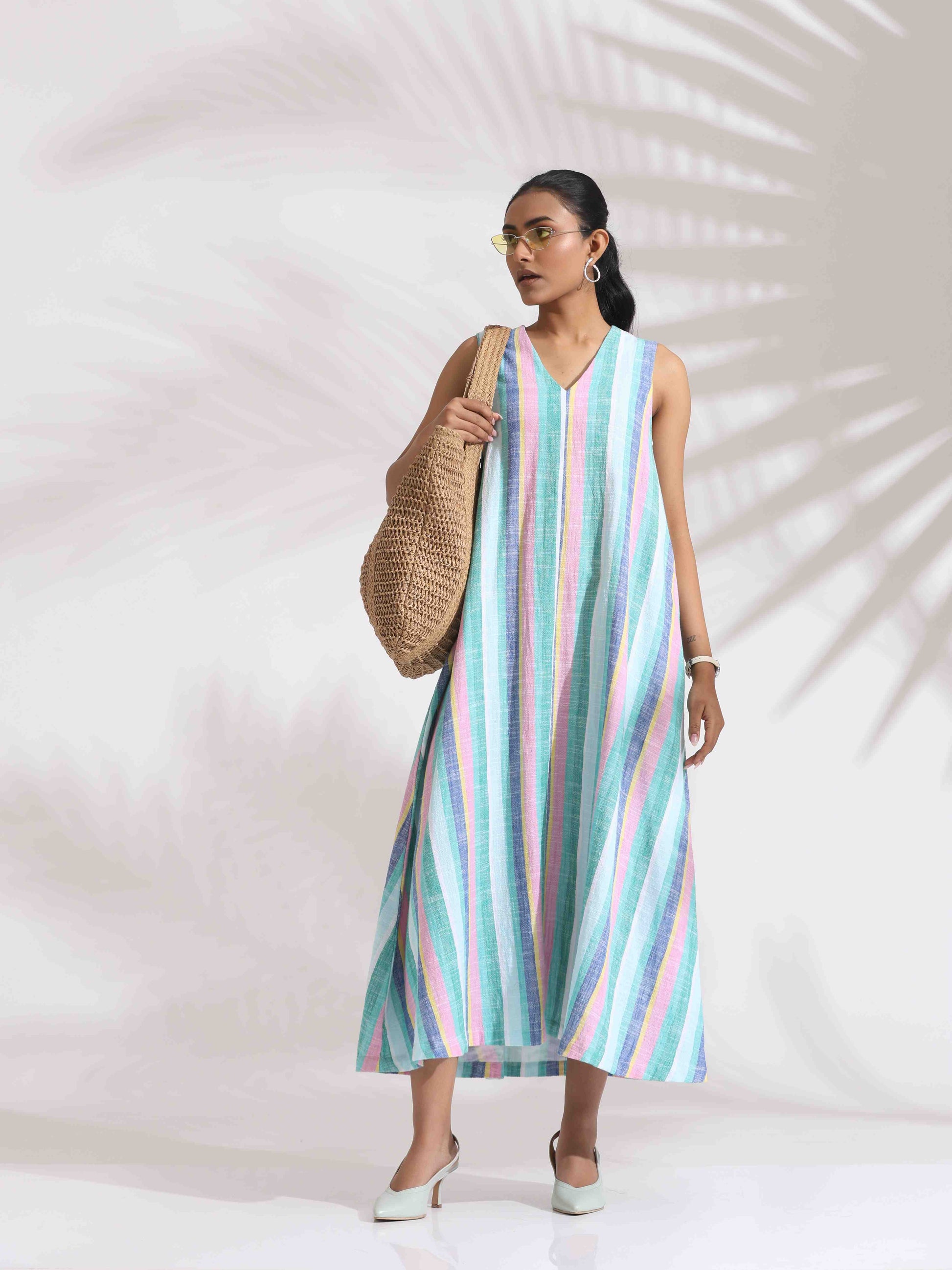 - Elevate your style with this green cotton multi stripe flared dress , it's an ideal blend of elegance and comfort.