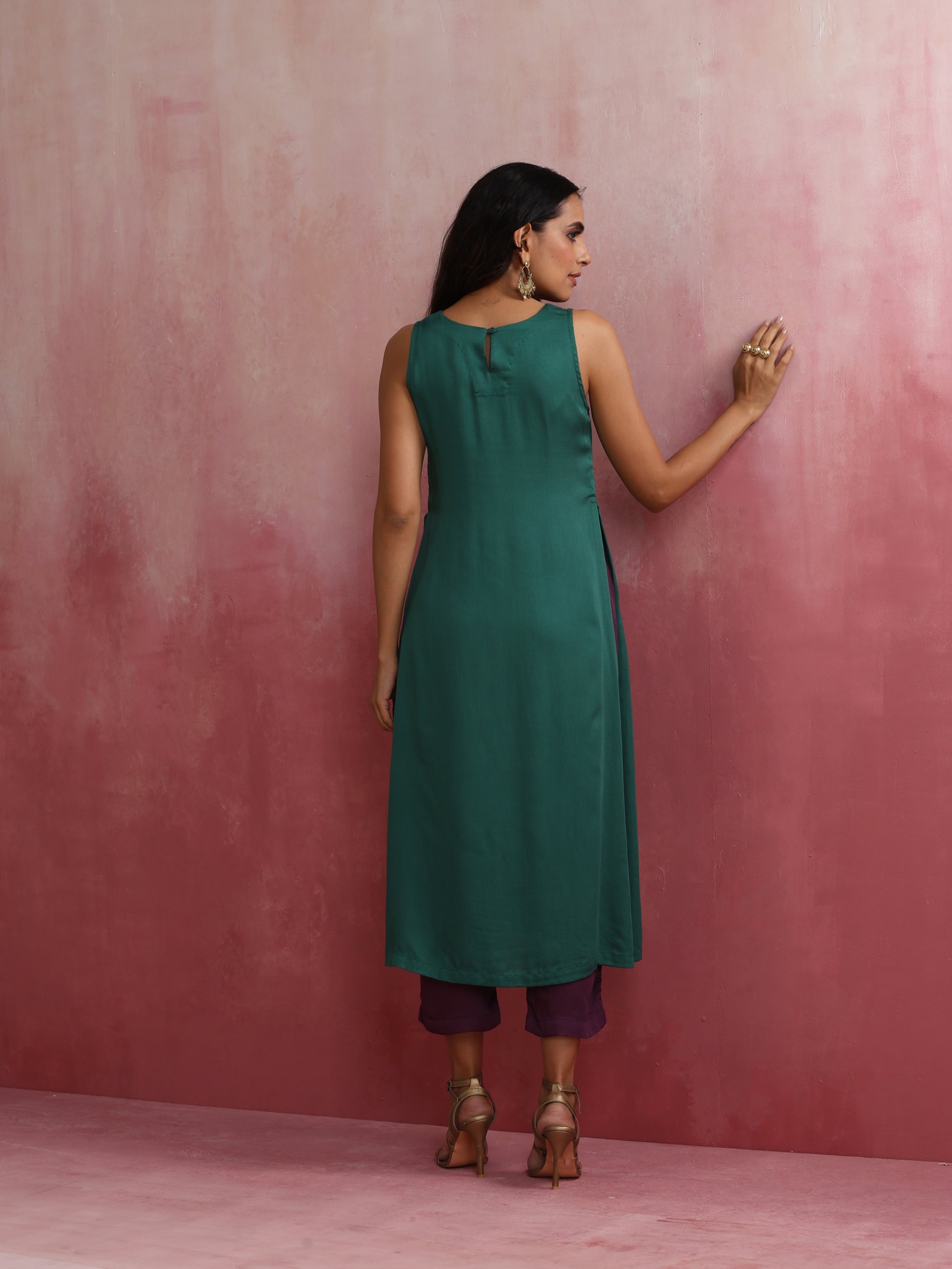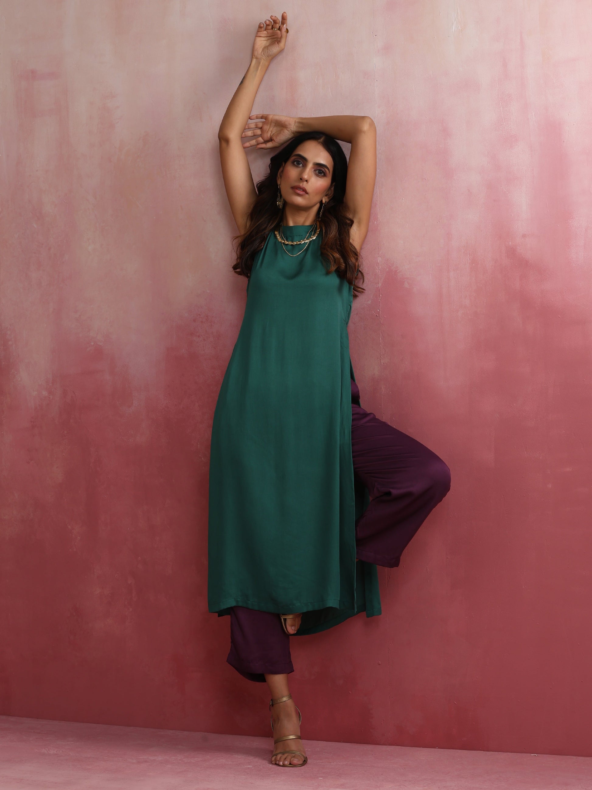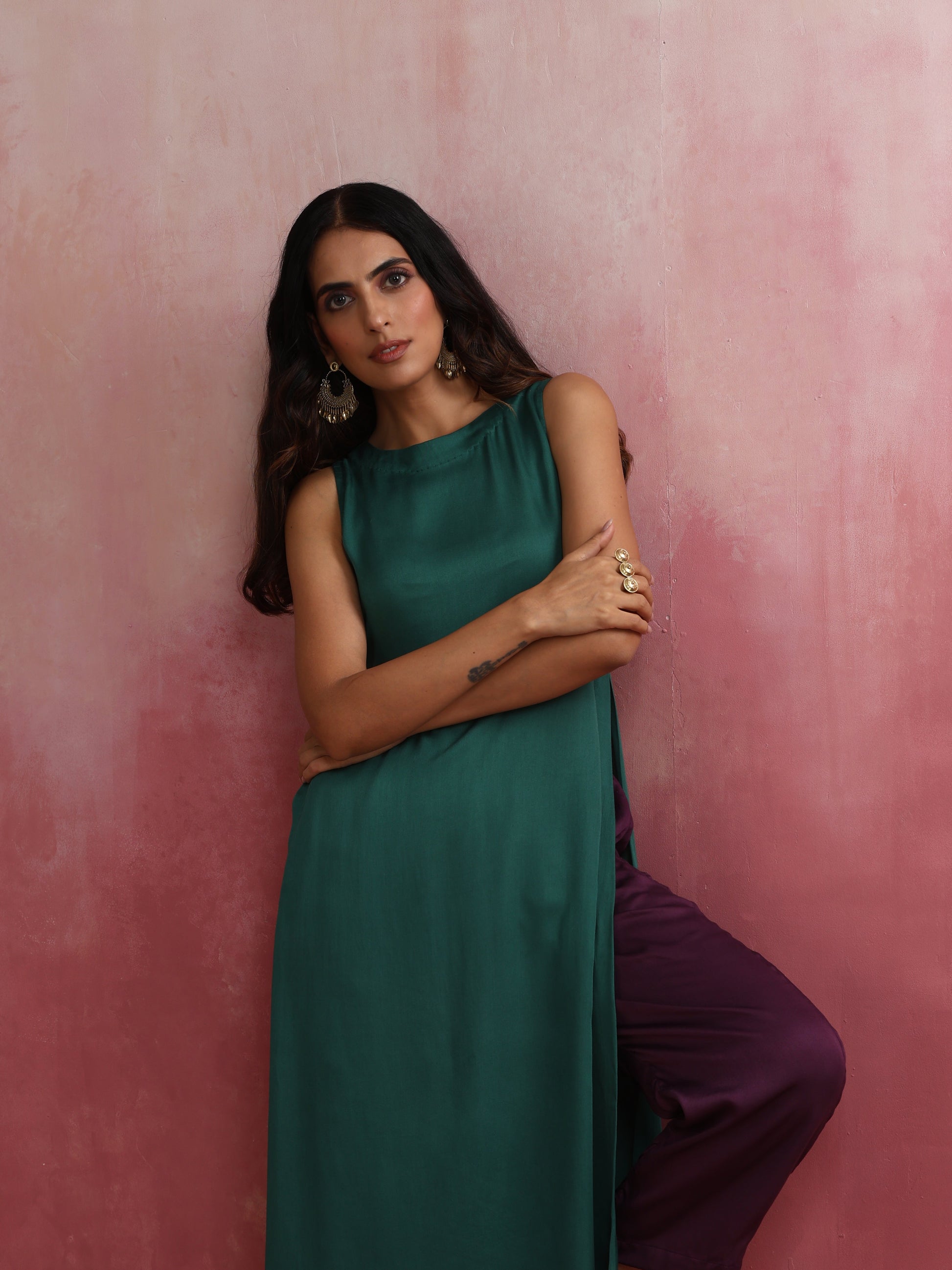 - Elevate your style with this green modal solid high slit kurta with boat neck and back opening.