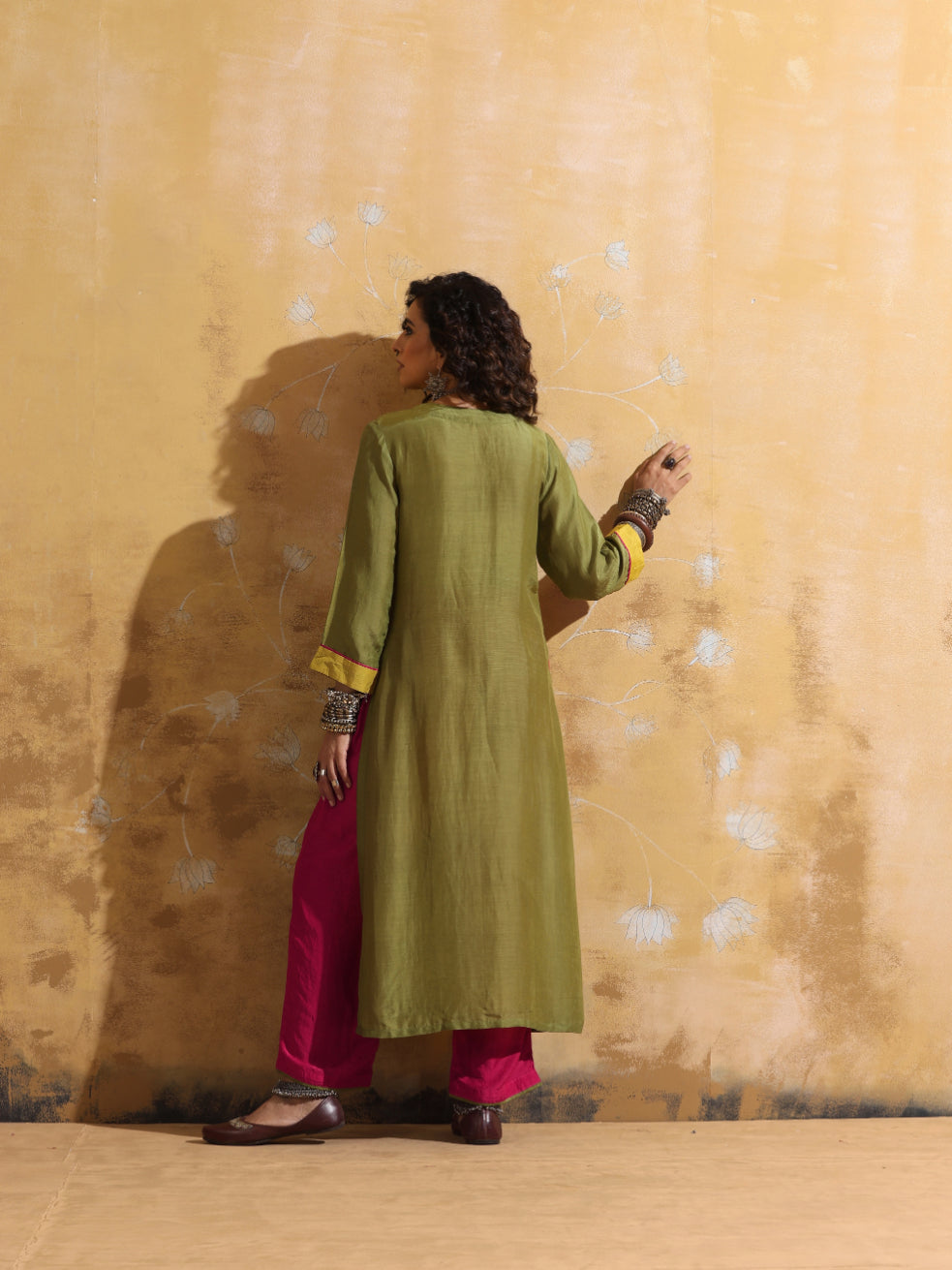 - Elevate your style and step into effortless elegance with this green high-slit kurta featuring contrast-color trim details, paired with pink pants. Designed for modern style and comfort, it’s perfect for occasions and gatherings.
