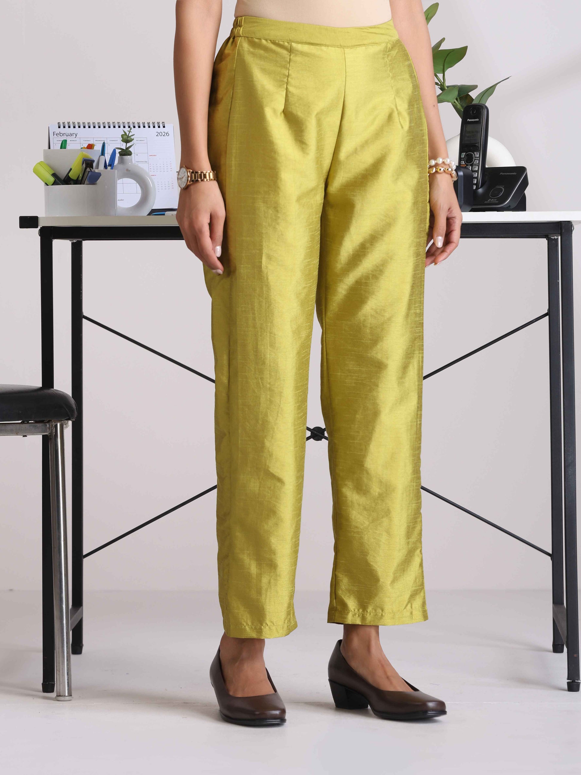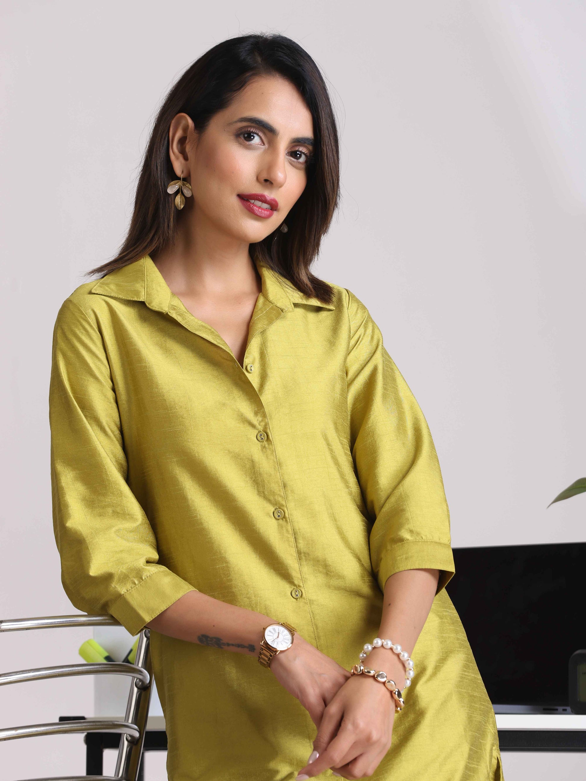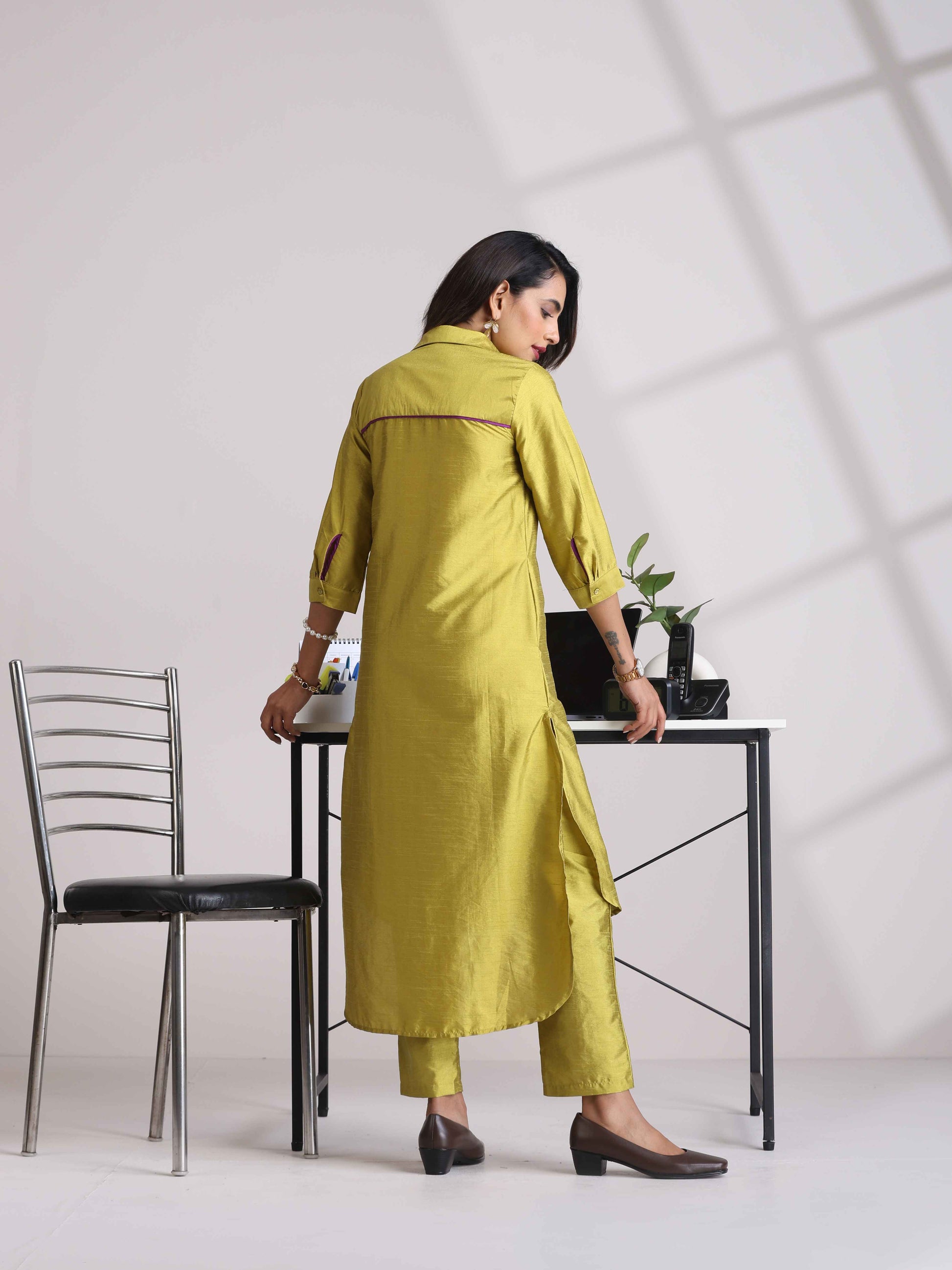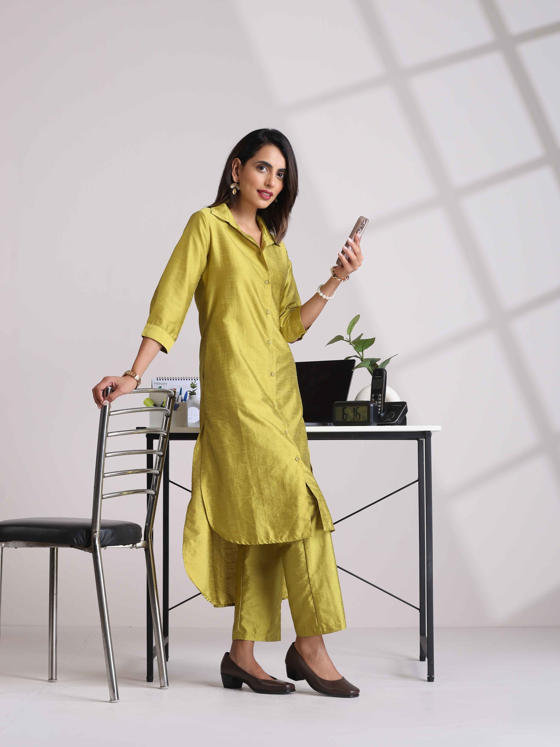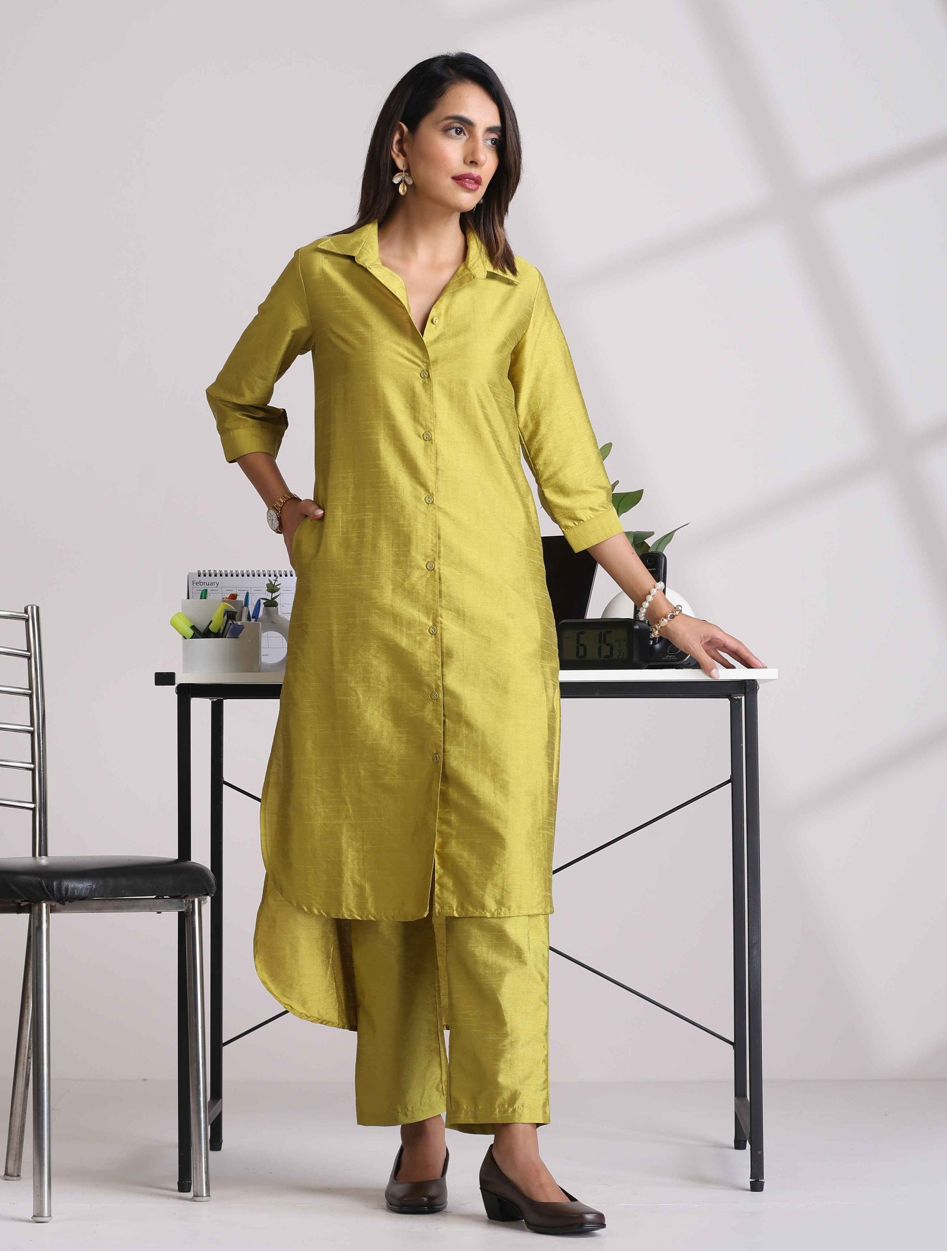 - Elevate your style with this green silk blend shirt style kurta paired perfectly with green silk blend elasticated waist pants.