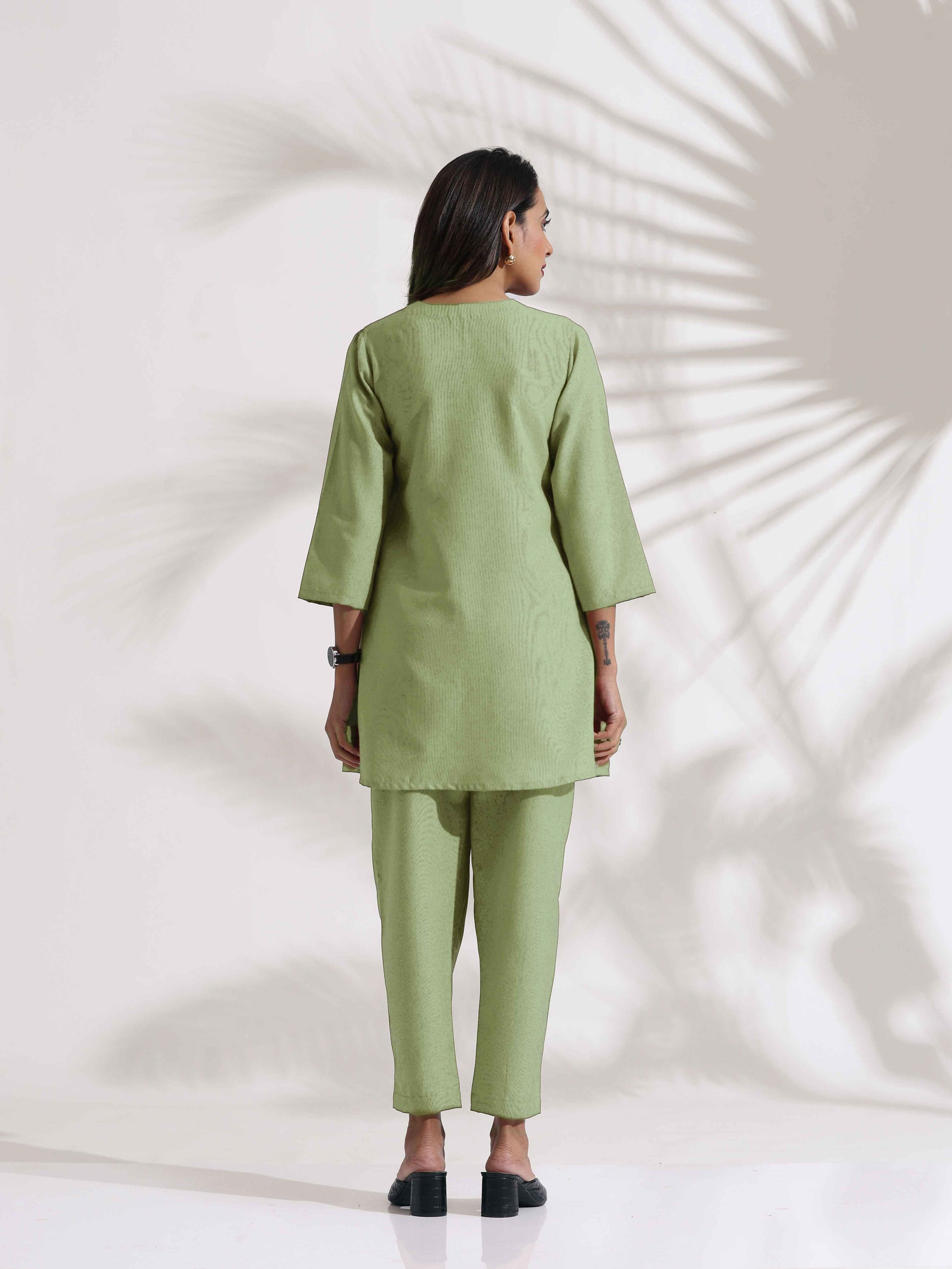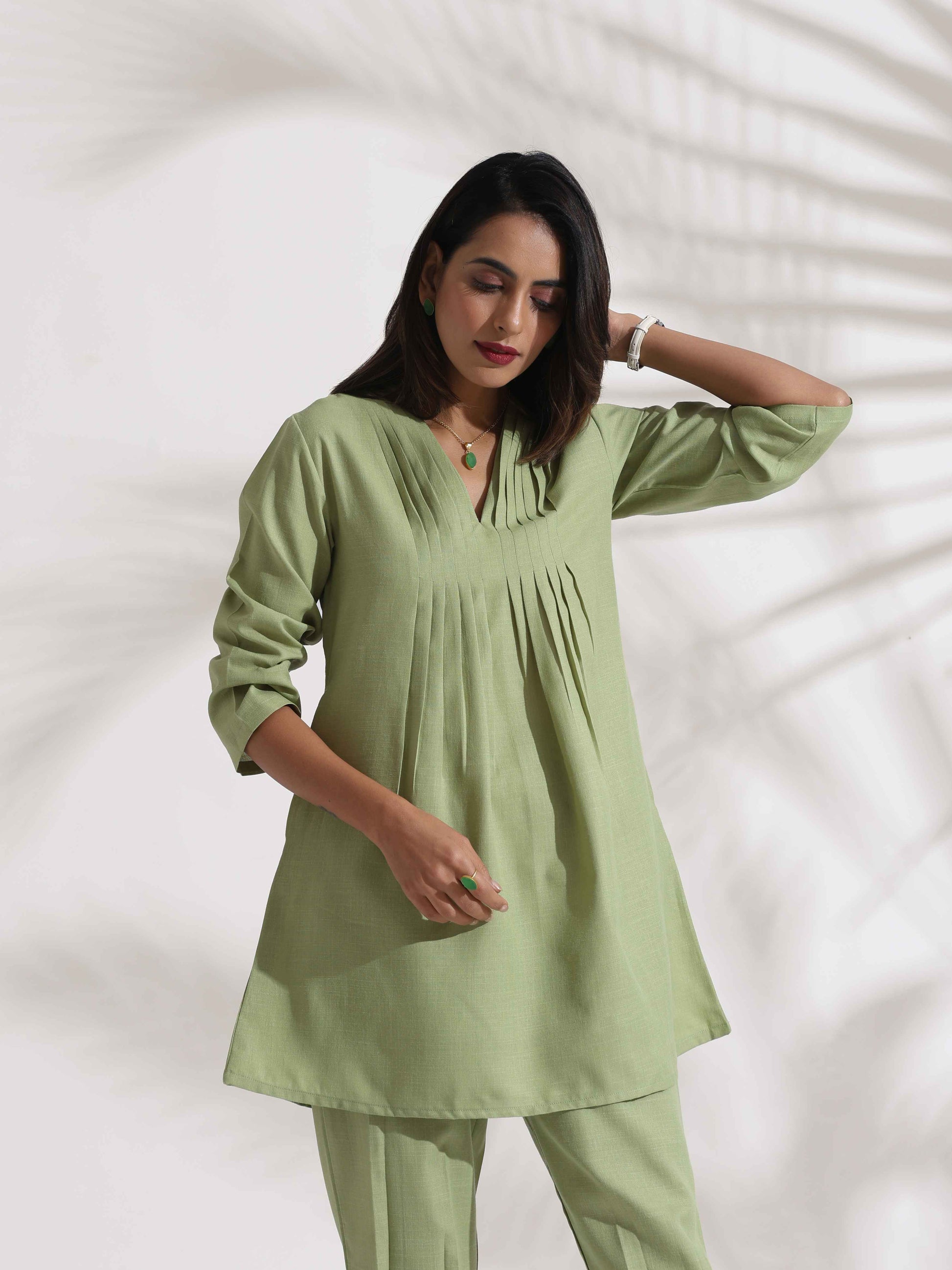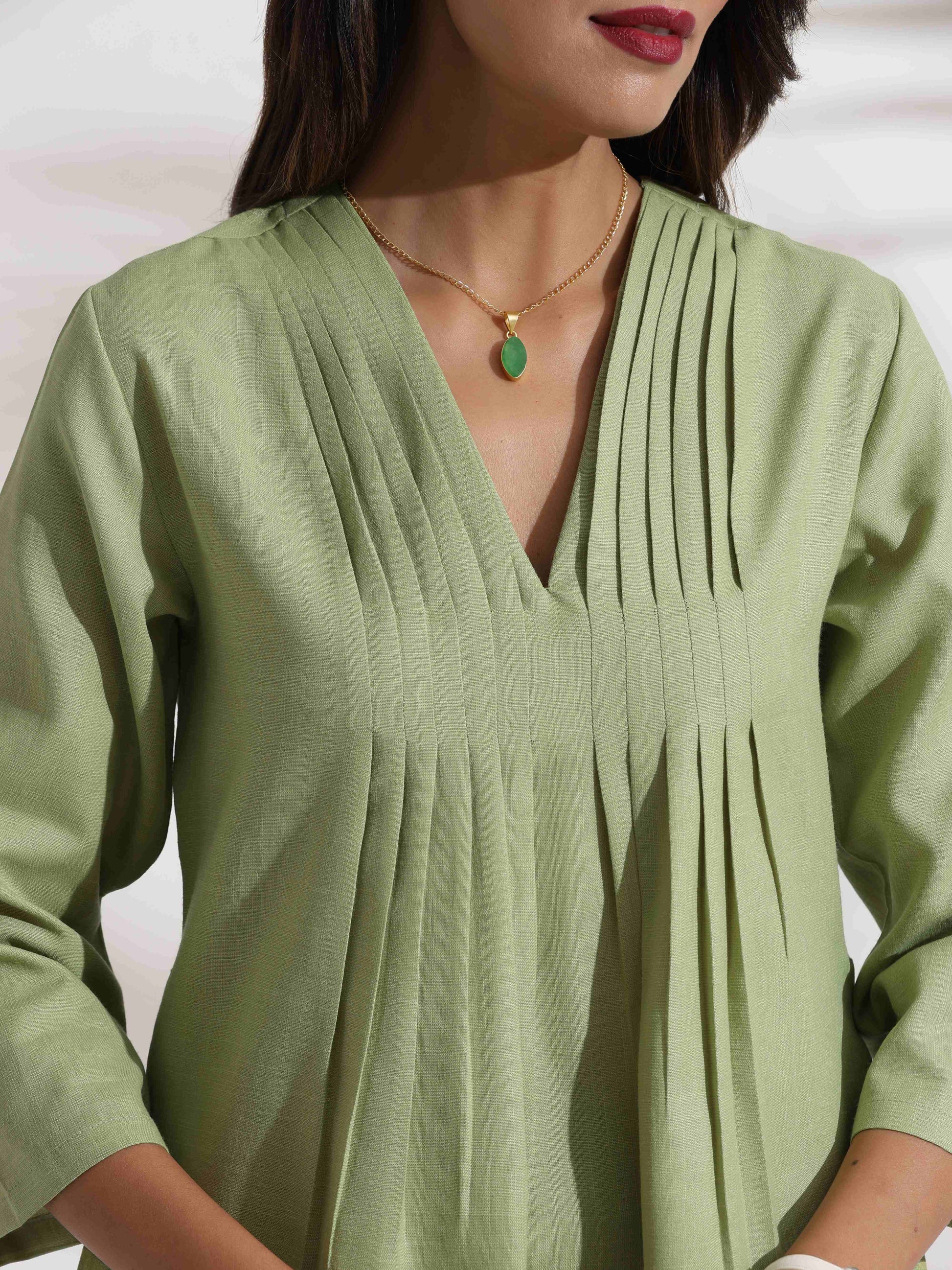 - Elevate your style with this green V- neck pleated top with green pants, it's an ideal blend of elegance and comfort.