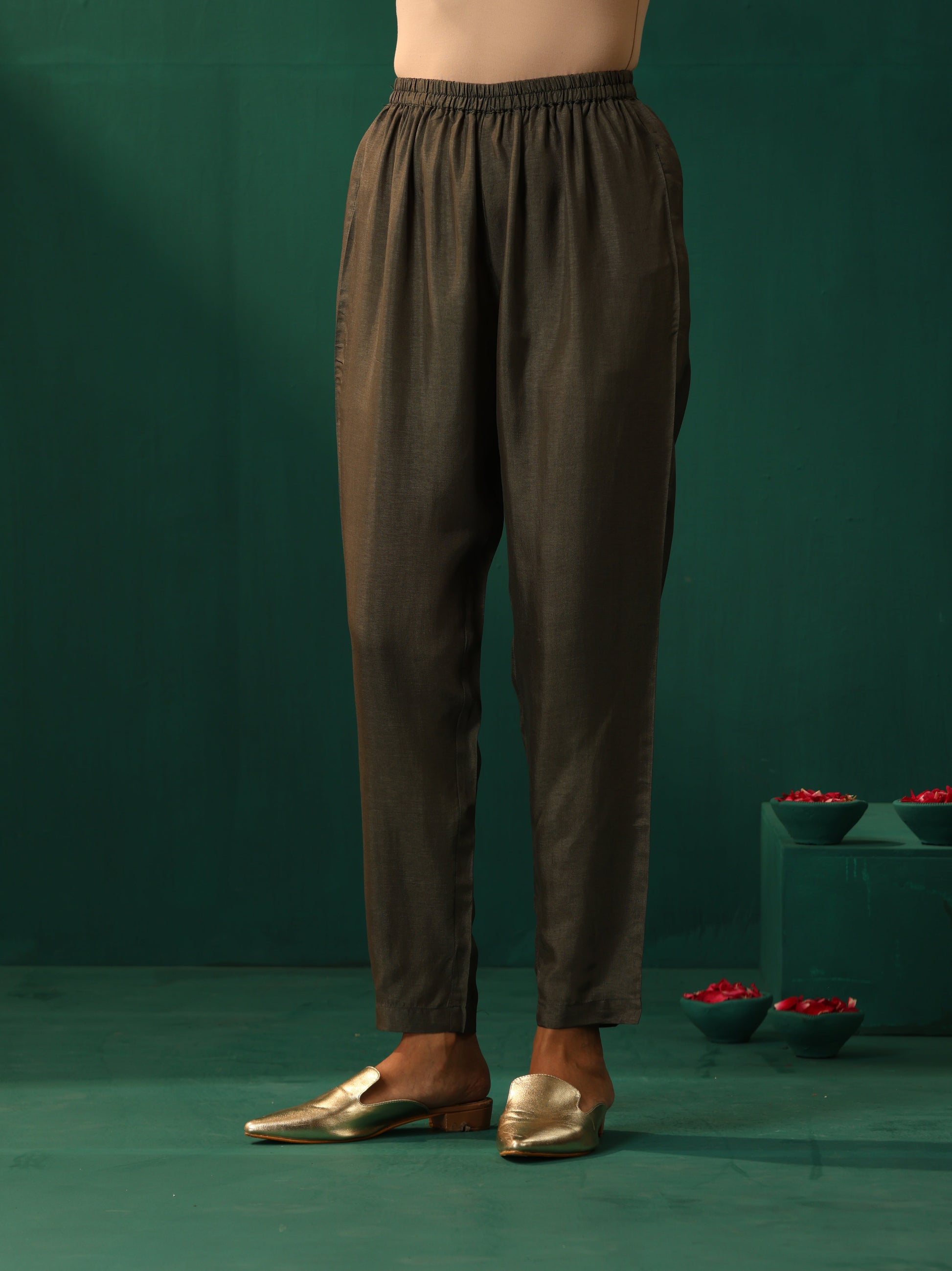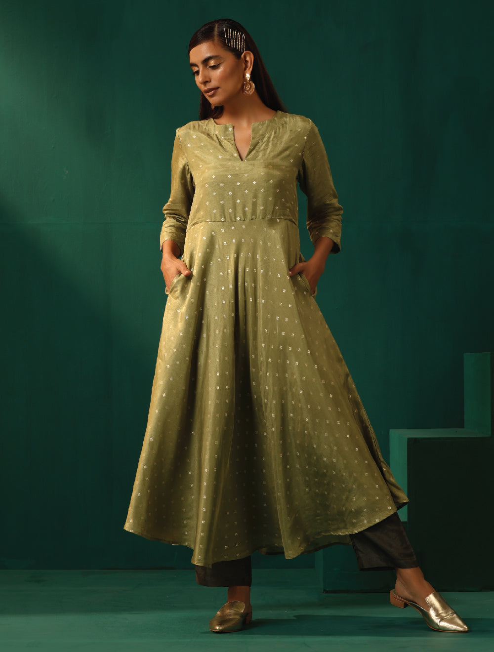 - Viscose Silk Flared Kurta with Round neck slit neckline and three-fourth sleeve . Paired with elasticated waist pant. Style with pair of mules to complete the look.