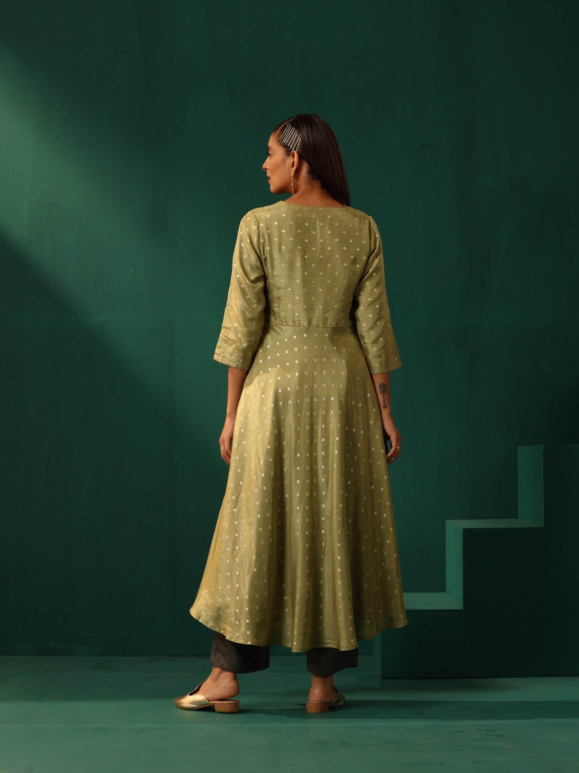 trueBrowns Green Square Viscose Silk Flared Kurta Pant Set