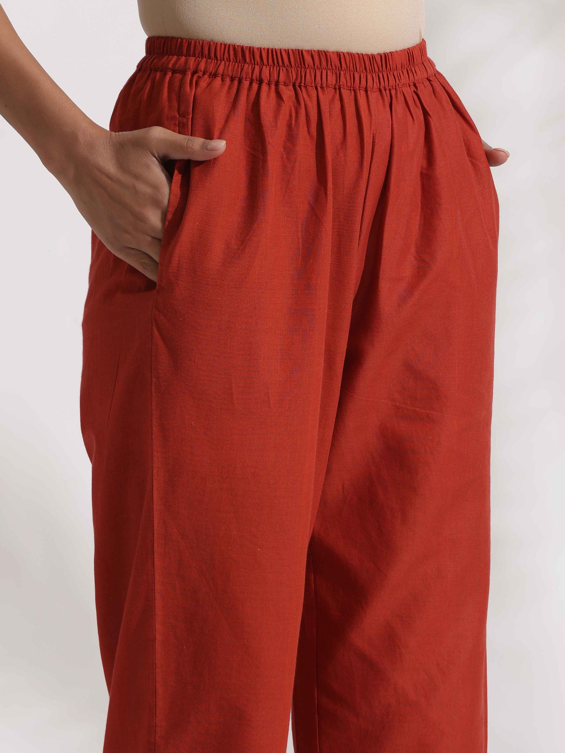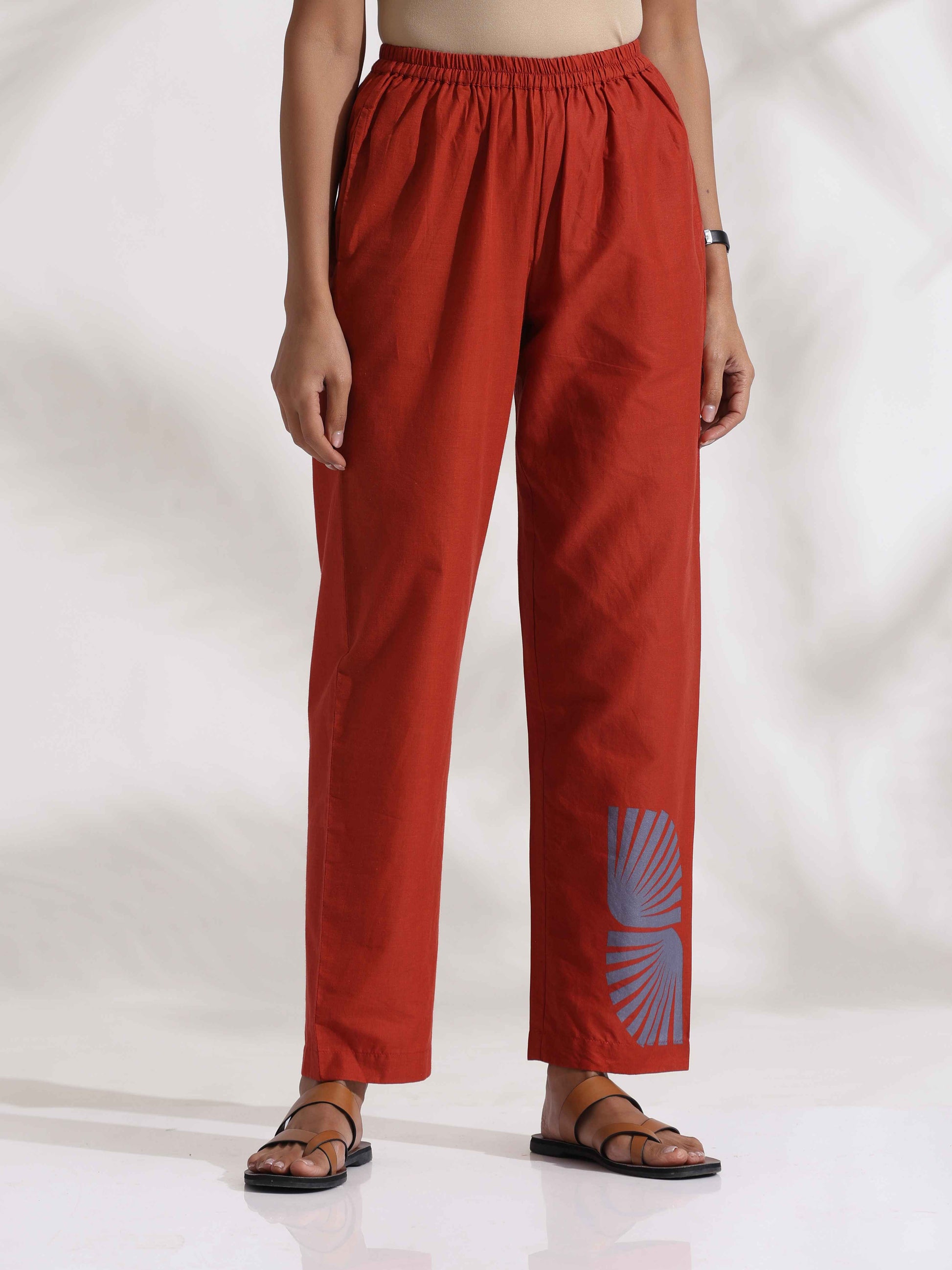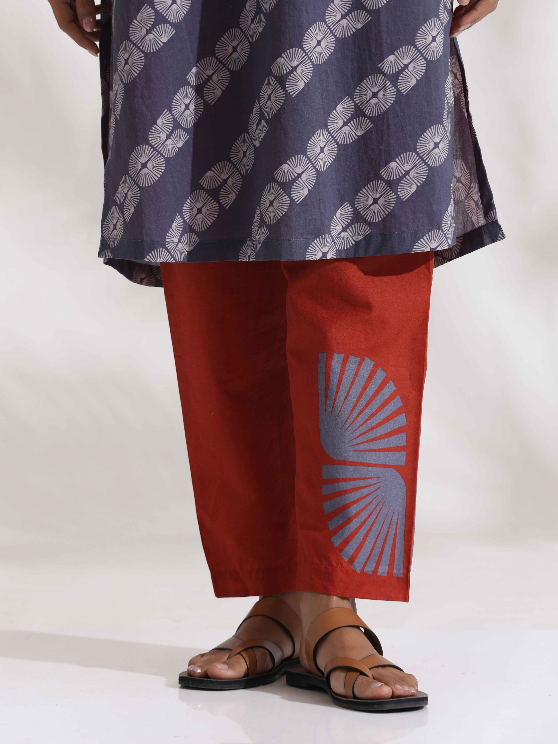 - Elevate your style and enhance your wardrobe with this sophisticated grey cotton print high-slit top with adjustable straps, perfectly complemented by red cotton pants which has one side placement print. This ensemble effortlessly combines timeless elegance with unmatched comfort for a chic and versatile look.